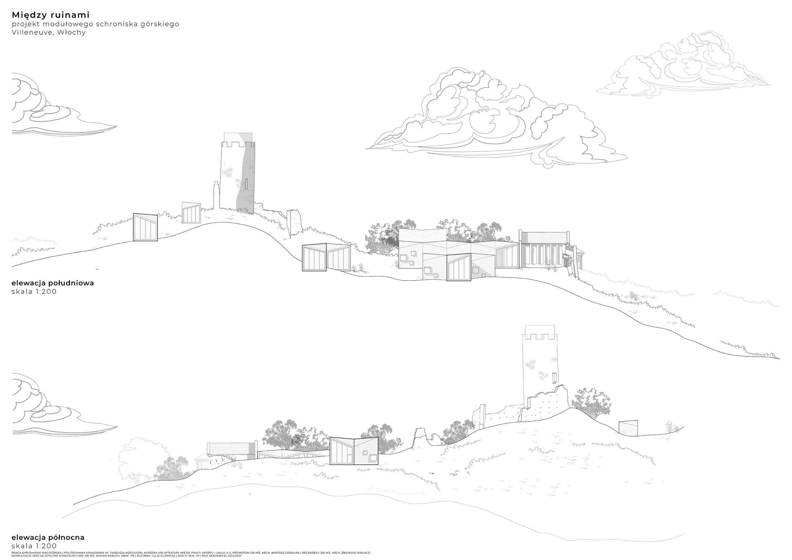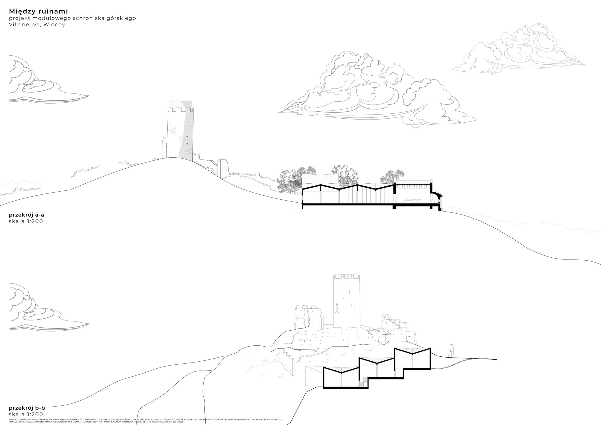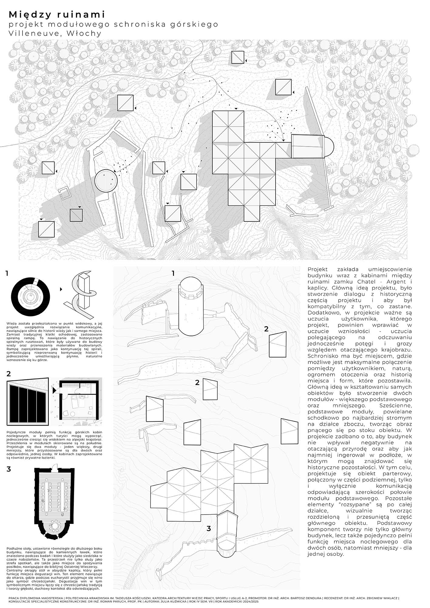 Projekt zakłada umiejscowienie budynku wraz z kabinami między ruinami zamku Chatel – Argent i kaplicy. Główną ideą projektu, było stworzenie dialogu z historyczną częścią projektu i aby był kompatybilny z tym, co zastane. Dodatkowo, w projekcie ważne są uczucia użytkownika, którego projekt, powinien wprawiać w uczucie wzniosłości – uczucia polegającego na odczuwaniu jednocześnie potęgi i grozy względem otaczającego krajobrazu. Schronisko ma być miejscem, gdzie możliwe jest maksymalne połączenie pomiędzy użytkownikiem, naturą, ogromem otoczenia oraz historią miejsca i form, które pozostawiła. Główną ideą w kształtowaniu samych obiektów było stworzenie dwóch modułów – większego podstawowego oraz mniejszego. Sześcienne, podstawowe moduły, powielane schodkowo po najbardziej stromym na działce zboczu, tworząc obraz pnącego się po stoku obiektu. W projekcie zadbano o to, aby budynek nie wpływał negatywnie na otaczającą przyrodę oraz aby jak najmniej ingerował w podłoże, w którym mogą znajdować się historyczne pozostałości. W tym celu, projektuje się obiekt parterowy, połączony w części podziemnej, tylko i wyłącznie komunikacją odpowiadającą szerokości połowie modułu podstawowego. Pozostałe elementy “rozsypane” są po całej działce, wizualnie tworząc rozdzieloną i przesuniętą część głównego obiektu. Podstawowy komponent tworzy nie tylko główny budynek, lecz także pojedynczo pełni funkcję miejsca noclegowego dla dwóch osób, natomiast mniejszy – dla jednej osoby.