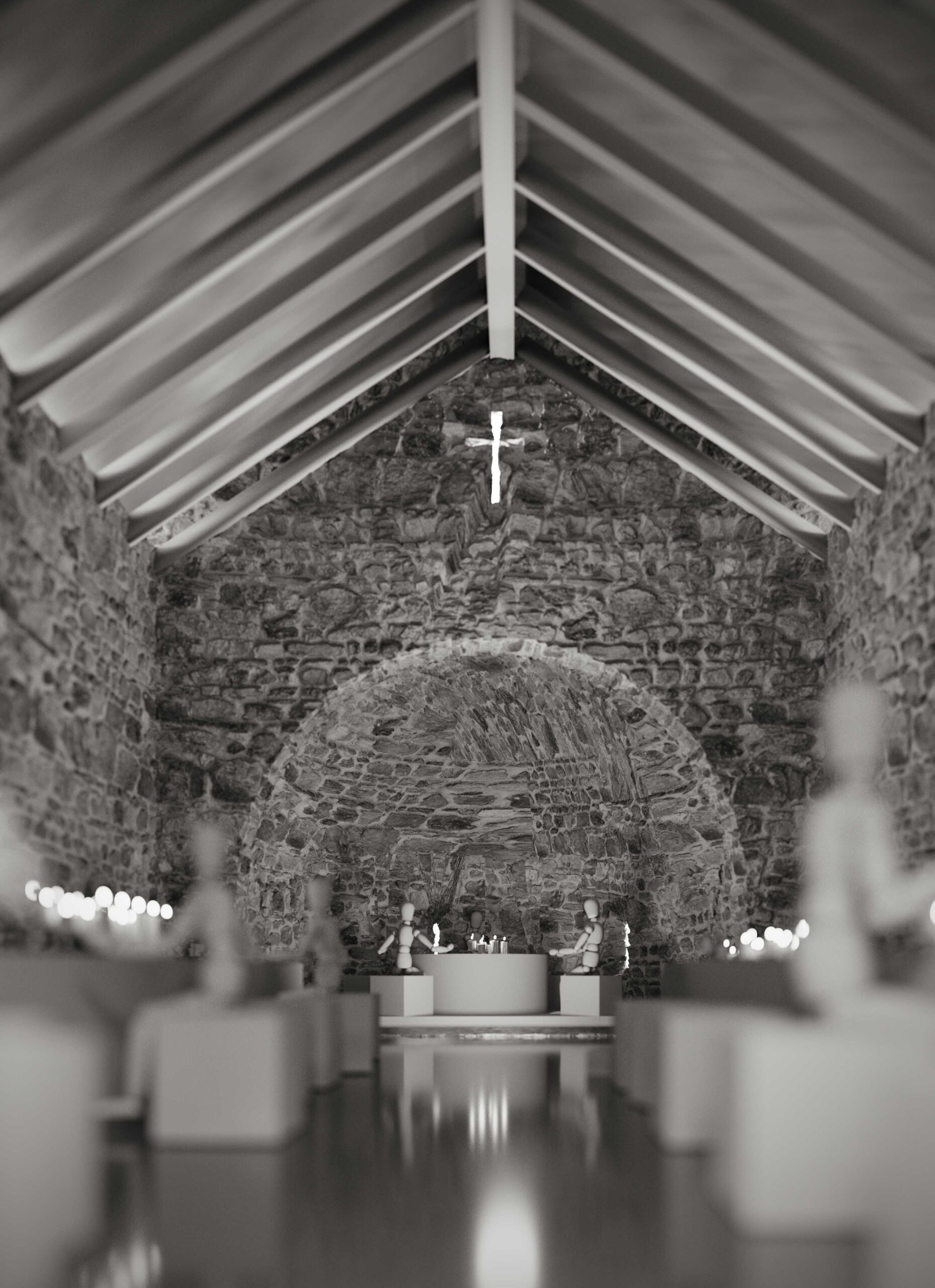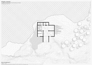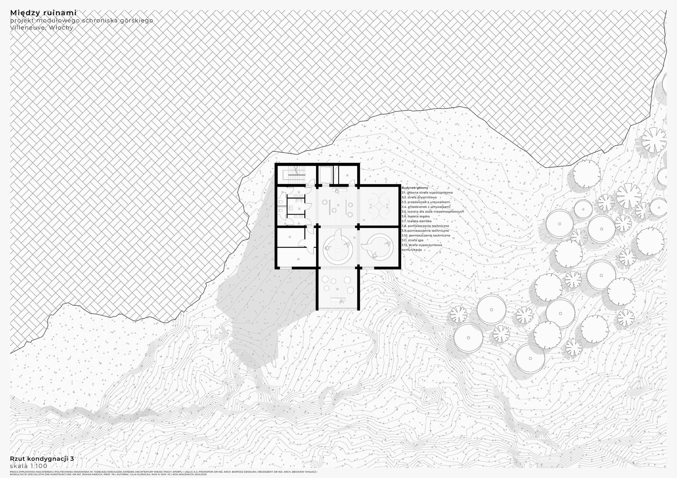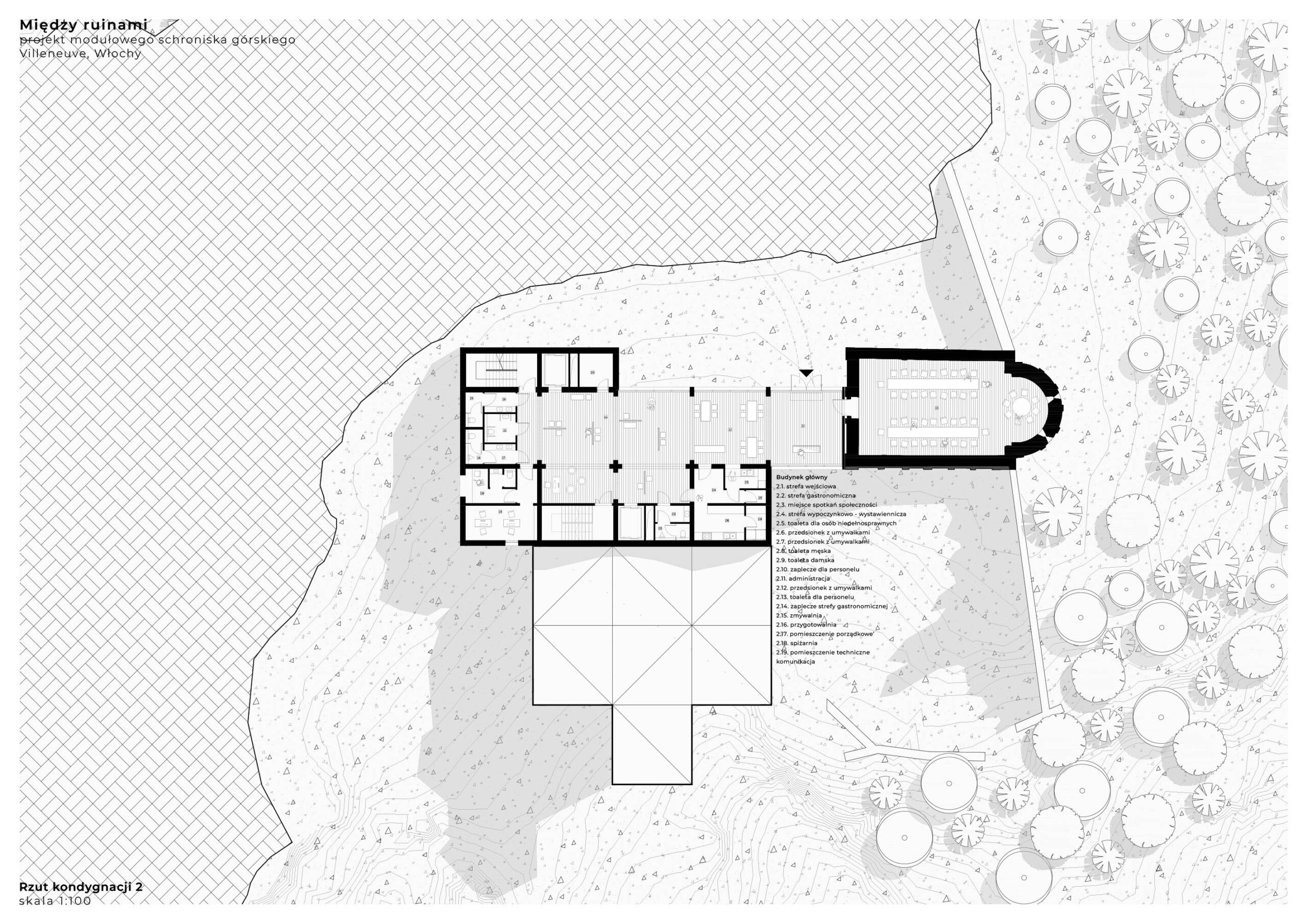 Projekt zakłada umiejscowienie budynku wraz z kabinami między ruinami zamku Chatel – Argent i kaplicy. Główną ideą projektu, było stworzenie dialogu z historyczną częścią projektu i aby był kompatybilny z tym, co zastane. Dodatkowo, w projekcie ważne są uczucia użytkownika, którego projekt, powinien wprawiać w uczucie wzniosłości – uczucia polegającego na odczuwaniu jednocześnie potęgi i grozy względem otaczającego krajobrazu. Schronisko ma być miejscem, gdzie możliwe jest maksymalne połączenie pomiędzy użytkownikiem, naturą, ogromem otoczenia oraz historią miejsca i form, które pozostawiła. Główną ideą w kształtowaniu samych obiektów było stworzenie dwóch modułów – większego podstawowego oraz mniejszego. Sześcienne, podstawowe moduły, powielane schodkowo po najbardziej stromym na działce zboczu, tworząc obraz pnącego się po stoku obiektu. W projekcie zadbano o to, aby budynek nie wpływał negatywnie na otaczającą przyrodę oraz aby jak najmniej ingerował w podłoże, w którym mogą znajdować się historyczne pozostałości. W tym celu, projektuje się obiekt parterowy, połączony w części podziemnej, tylko i wyłącznie komunikacją odpowiadającą szerokości połowie modułu podstawowego. Pozostałe elementy “rozsypane” są po całej działce, wizualnie tworząc rozdzieloną i przesuniętą część głównego obiektu. Podstawowy komponent tworzy nie tylko główny budynek, lecz także pojedynczo pełni funkcję miejsca noclegowego dla dwóch osób, natomiast mniejszy – dla jednej osoby.