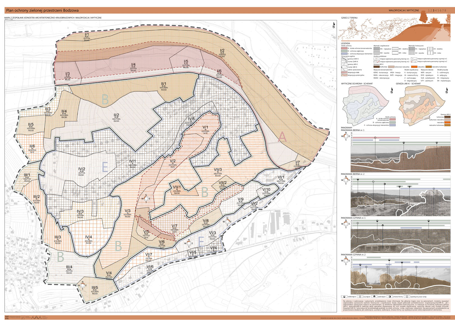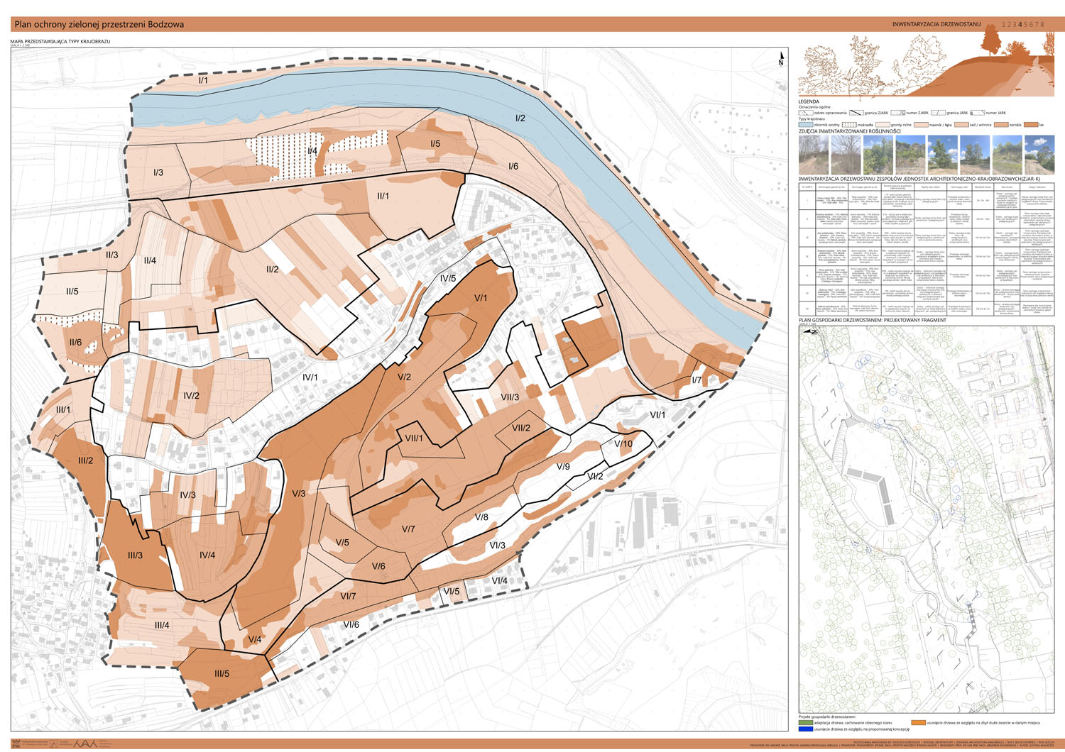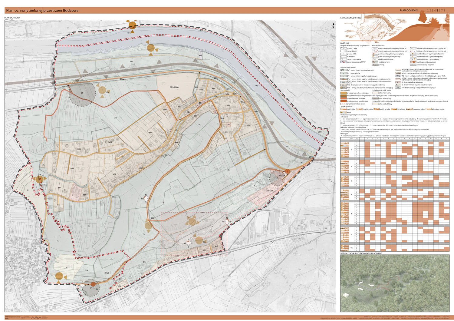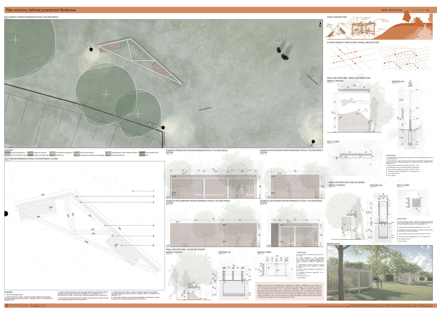 Tematem prezentowanej pracy jest „Plan ochrony zielonej przestrzeni Bodzowa”. Głównym założeniem projektu jest rewitalizacja, która obejmuje odnowę jak i projekt koncepcji dla obszaru objętego opracowaniem. Celem jest nadanie miejscu nowego znaczenia funkcjonalnego, społecznego i kulturowego. Pracę nad projektem rozpoczęto od wizji lokalnej, która pozwoliła zdobyć informacje dotyczące skali miejsca i jego najważniejszych elementów. Pokazała rozmieszczenie historycznych ruin i cennej roślinności. Wykonano zdjęcia, które przedstawiły panoramy na otaczający krajobraz. Następnie stworzono liczne analizy uwarunkowań, oś czasu i porównano mapy oraz zdjęcia archiwalne. Zaprezentowano też dobre przykłady, które posłużyły jako inspiracje do projektu. Kolejno przedstawiono podział terenu na zespoły i jednostki architektoniczno-krajobrazowe. Zaprezentowano plan zasobu miejsca, na którym wyróżniono typy krajobrazu, wskazano punkty widokowe oraz przedstawiono miejsce występowania ekspozycji stałej. Zamieszczono też panoramy. Następnie pokazano plan z waloryzacją i wytycznymi miejsca. Przedstawił on strefy ochrony i pokazał wartości historyczne oraz współczesne jednostek. Na planie pokazano też informacje dotyczące wytycznych konserwatorskich i ideowych, wskazano model współczesny oraz przyszły, a także przedstawiono rozkład genezy wnętrza. Na panoramach wyróżniono proponowane działania względem otoczenia. Finalnie, na planszy przedstawiającej inwentaryzacje drzewostanu wyróżniono typy krajobrazu przestrzeni, pokazano inwentaryzację zespołów oraz wskazano projekt gospodarki drzewostanem dla opracowywanego fragmentu. Część projektową rozpoczęto od stworzenia planu ochrony. Wyróżniono nowe działania względem obszaru i wskazano przeznaczenie terenów. Pokazano istniejące i projektowane trasy, wyróżniono punkty akcesji turystycznej, wejścia na obszar oraz proponowane parkingi. Kolejno pokazano projektowany fragment, który stworzono przy pomocy schematu ideowego, komunikacyjnego i podziału stref funkcjonalnych. Detal przyrodniczy przedstawił projektowaną trasę historyczną, wokół której zaproponowano nową roślinność, a detal techniczny- altanę do odpoczynku. W projekcie zawarto też projektowaną, małą architekturę, która ozdobiła przestrzeń.