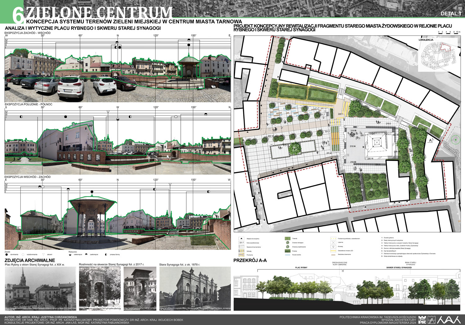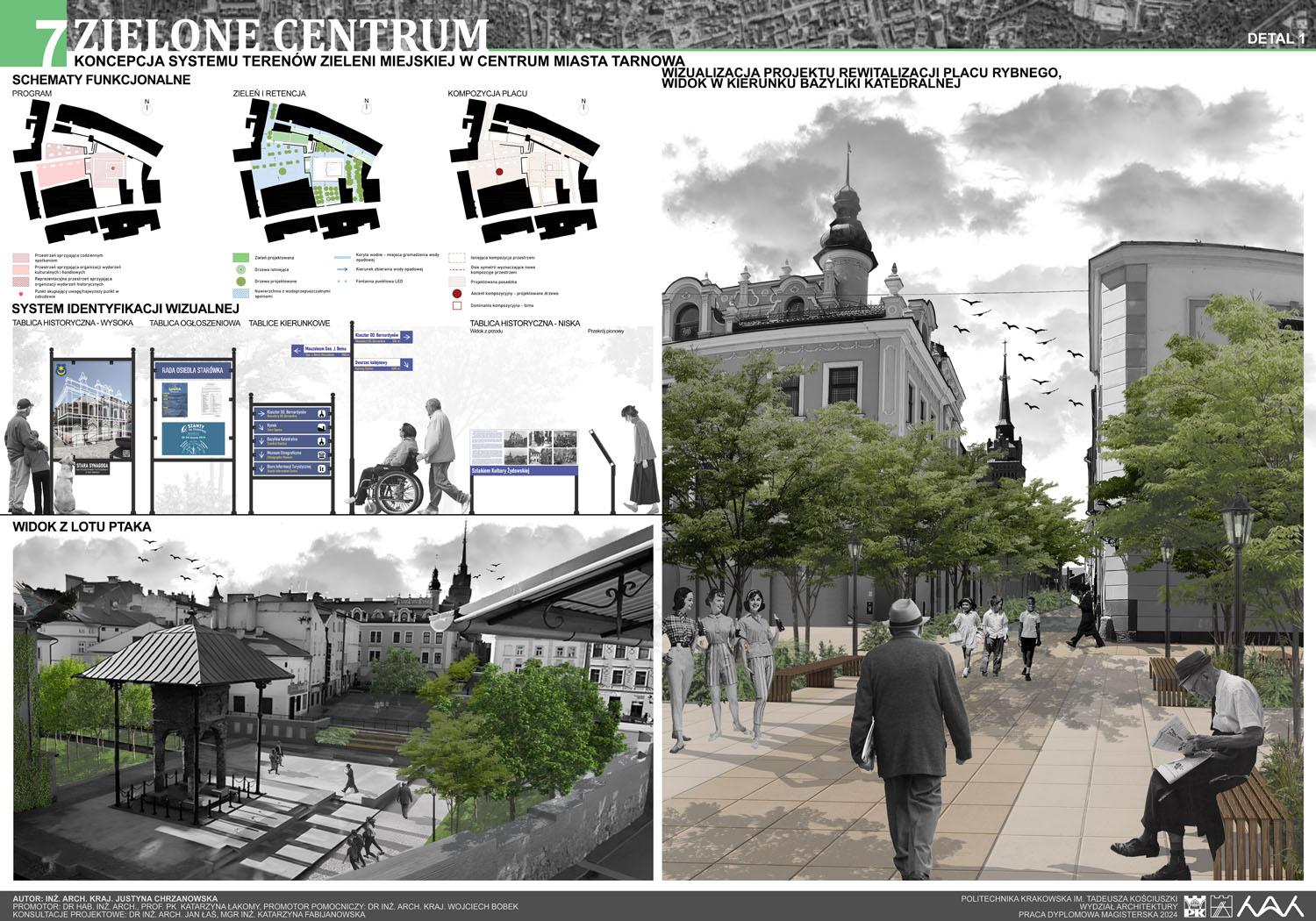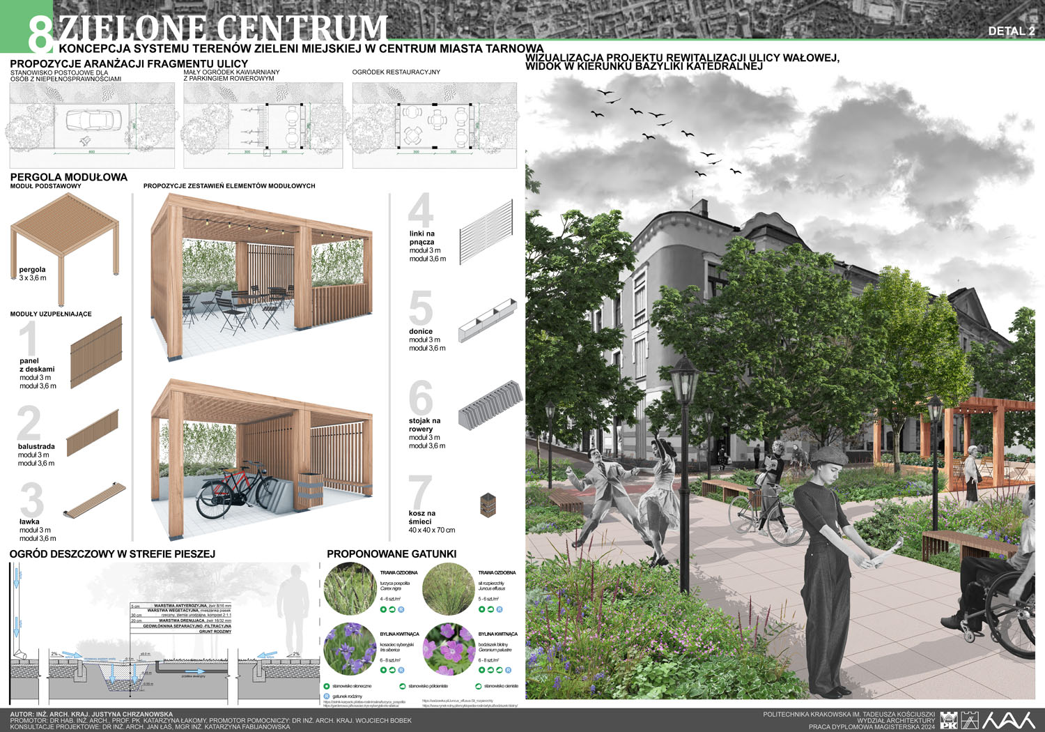 Tematem opracowania jest koncepcja systemu terenów zieleni miejskiej dla śródmieścia Tarnowa, wpisanego do rejestru zabytków, w województwie małopolskim. W obliczu urbanistycznych wyzwań i zmian klimatycznych, z jakimi mierzy się miasto, głównym celem projektu było stworzenie spójnego systemu zieleni miejskiej, który podniesie atrakcyjność i dostępność historycznych przestrzeni Tarnowa w duchu zrównoważonego rozwoju. Priorytetem było wprowadzenie rozwiązań błękitno-zielonej infrastruktury, które umożliwią efektywne gospodarowanie wodą opadową, przy jednoczesnym zwiększeniu bioróżnorodności. Projekt odpowiada również na potrzeby osób ze szczególnymi potrzebami zgodnie z zasadami projektowania uniwersalnego. Inwestycja w zieleń miejską to krok w stronę bardziej ekologicznego i przyjaznego środowiska, które nie tylko wzbogaci przestrzeń publiczną, ale również wpłynie pozytywnie na zdrowie i jakość życia mieszkańców Tarnowa, dbając o dziedzictwo kulturowe miasta.
