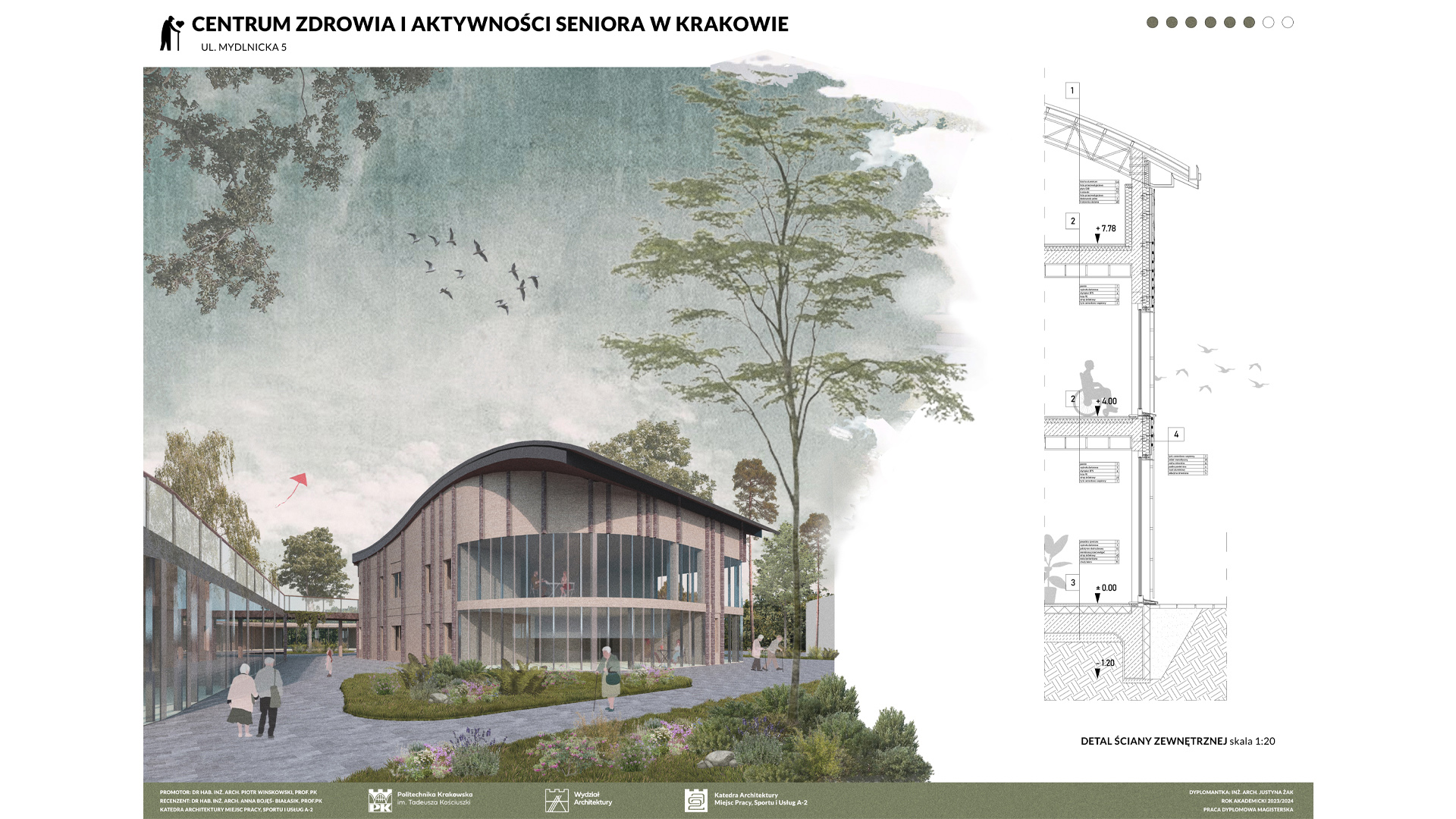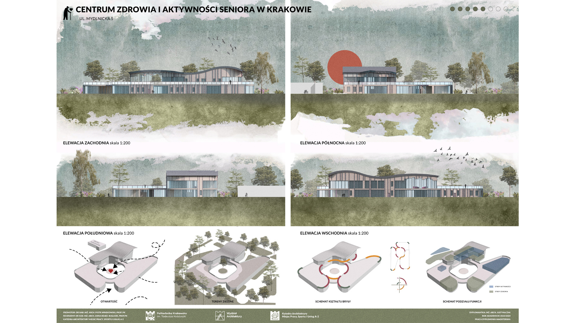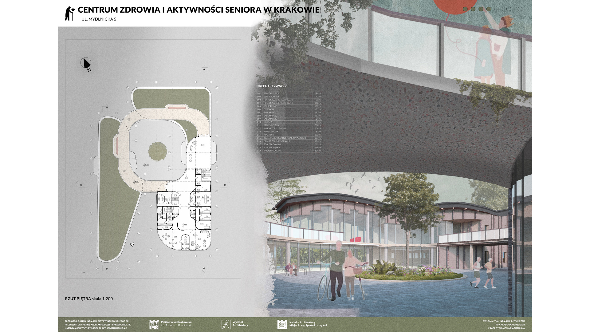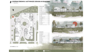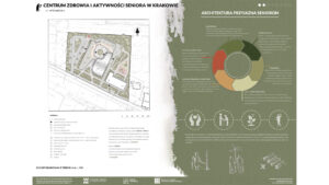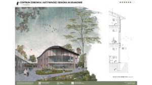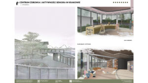 Projekt Centrum Zdrowia i Aktywności Seniora w Krakowie zakłada stworzenie dwóch budynków: większego, dwukondygnacyjnego i mniejszego, jednokondygnacyjnego, połączonych kładką pieszą, co umożliwia seniorom spacery. Obiekt harmonijnie współgra z otoczeniem, nie dominując działki, na której znajduje się także Szkoła Montessori. Wspólna lokalizacja sprzyja budowaniu relacji międzypokoleniowych, korzystnych zarówno dla seniorów, jak i dzieci. W centrum zaprojektowano liczne przestrzenie aktywności, m.in. sale malarskie, ceramiczne, komputerowe, klub książki, jadalnię, a także strefy relaksu i masażu. Obiekt oferuje różnorodne formy aktywizacji, wspierając zdrowie fizyczne i psychiczne seniorów. Budynki wyróżniają się zaokrąglonymi formami i przeszklonymi przestrzeniami, które wprowadzają światło oraz umożliwiają kontakt z naturą. Na terenie otaczającym centrum zaplanowano ścieżki spacerowe, ławki oraz plac zabaw dla dzieci z Montessori, sprzyjając integracji i wypoczynkowi.