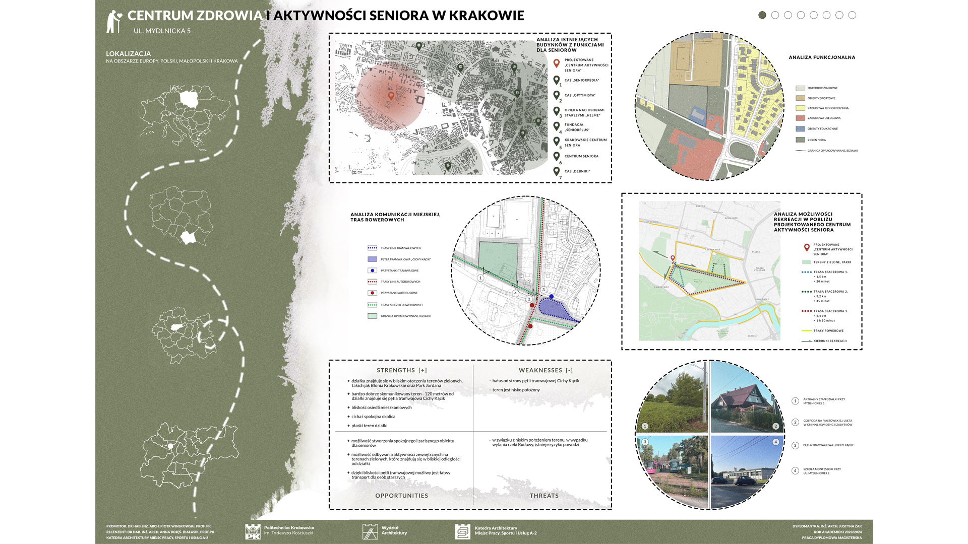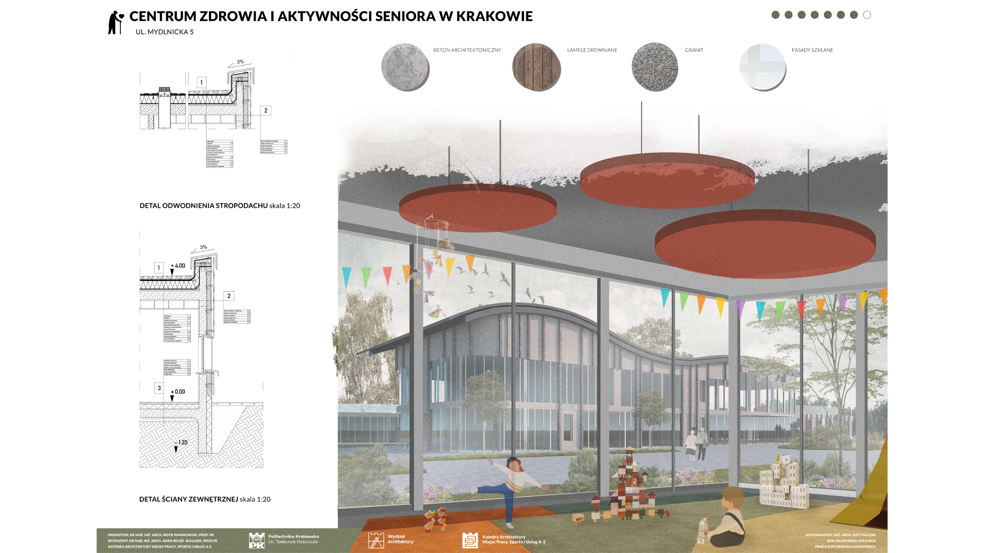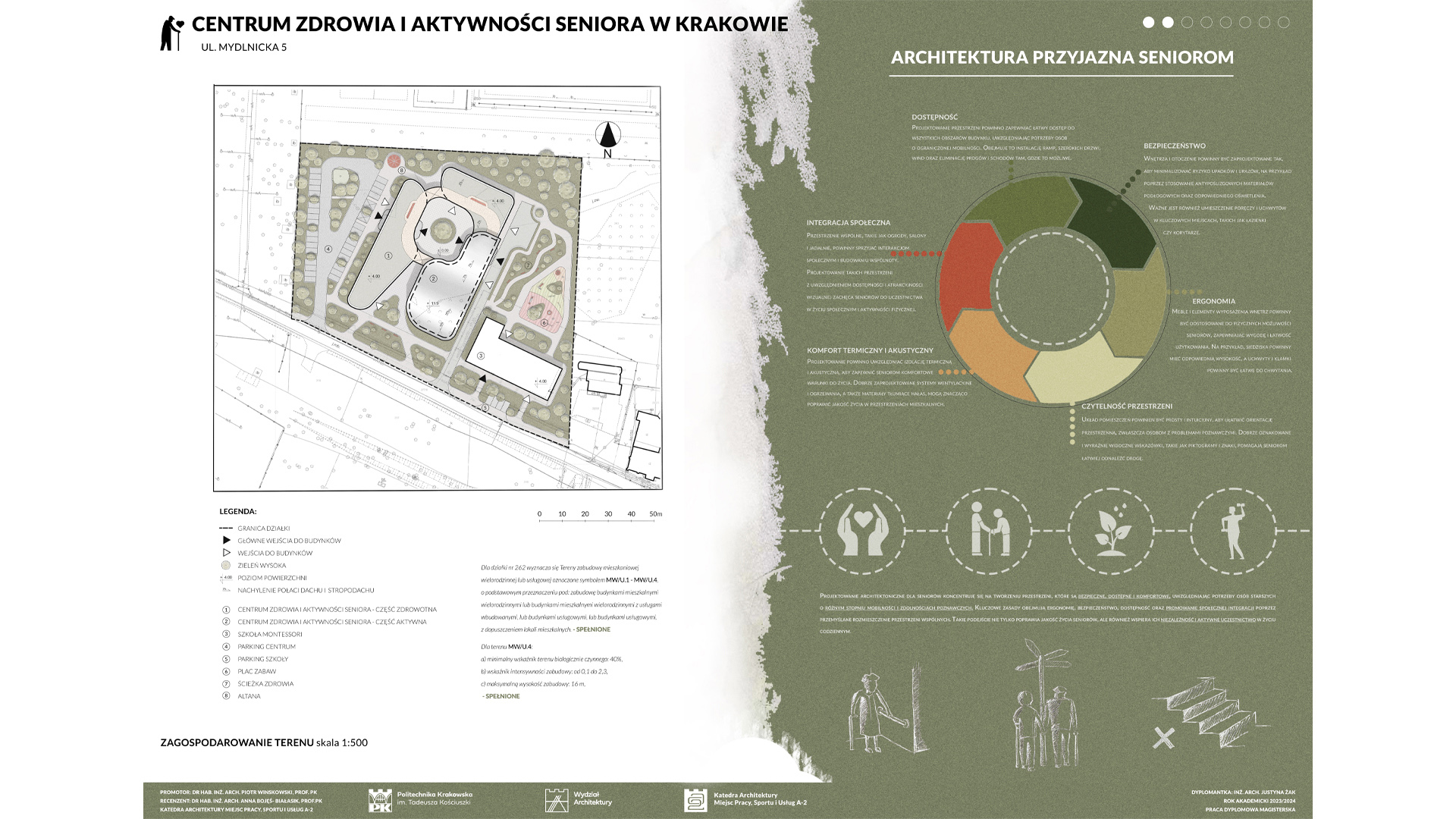 Projekt Centrum Zdrowia i Aktywności Seniora w Krakowie zakłada stworzenie dwóch budynków: większego, dwukondygnacyjnego i mniejszego, jednokondygnacyjnego, połączonych kładką pieszą, co umożliwia seniorom spacery. Obiekt harmonijnie współgra z otoczeniem, nie dominując działki, na której znajduje się także Szkoła Montessori. Wspólna lokalizacja sprzyja budowaniu relacji międzypokoleniowych, korzystnych zarówno dla seniorów, jak i dzieci. W centrum zaprojektowano liczne przestrzenie aktywności, m.in. sale malarskie, ceramiczne, komputerowe, klub książki, jadalnię, a także strefy relaksu i masażu. Obiekt oferuje różnorodne formy aktywizacji, wspierając zdrowie fizyczne i psychiczne seniorów. Budynki wyróżniają się zaokrąglonymi formami i przeszklonymi przestrzeniami, które wprowadzają światło oraz umożliwiają kontakt z naturą. Na terenie otaczającym centrum zaplanowano ścieżki spacerowe, ławki oraz plac zabaw dla dzieci z Montessori, sprzyjając integracji i wypoczynkowi.