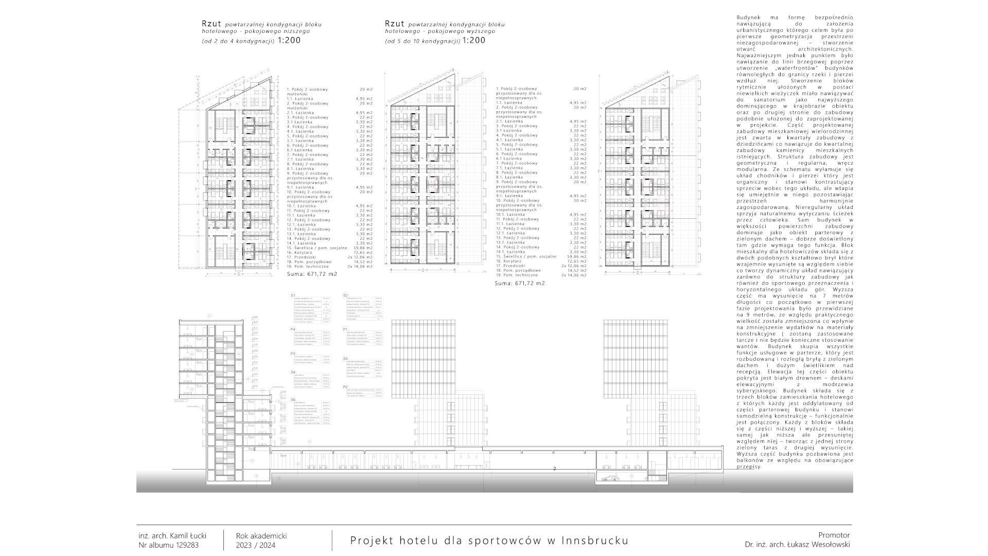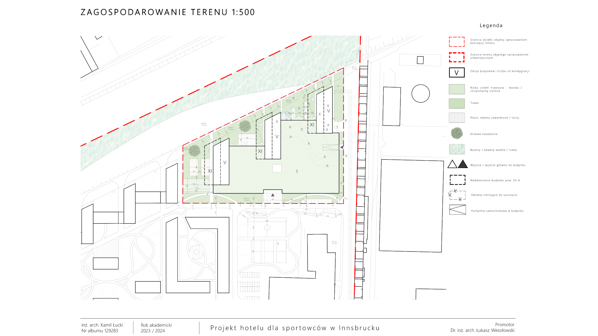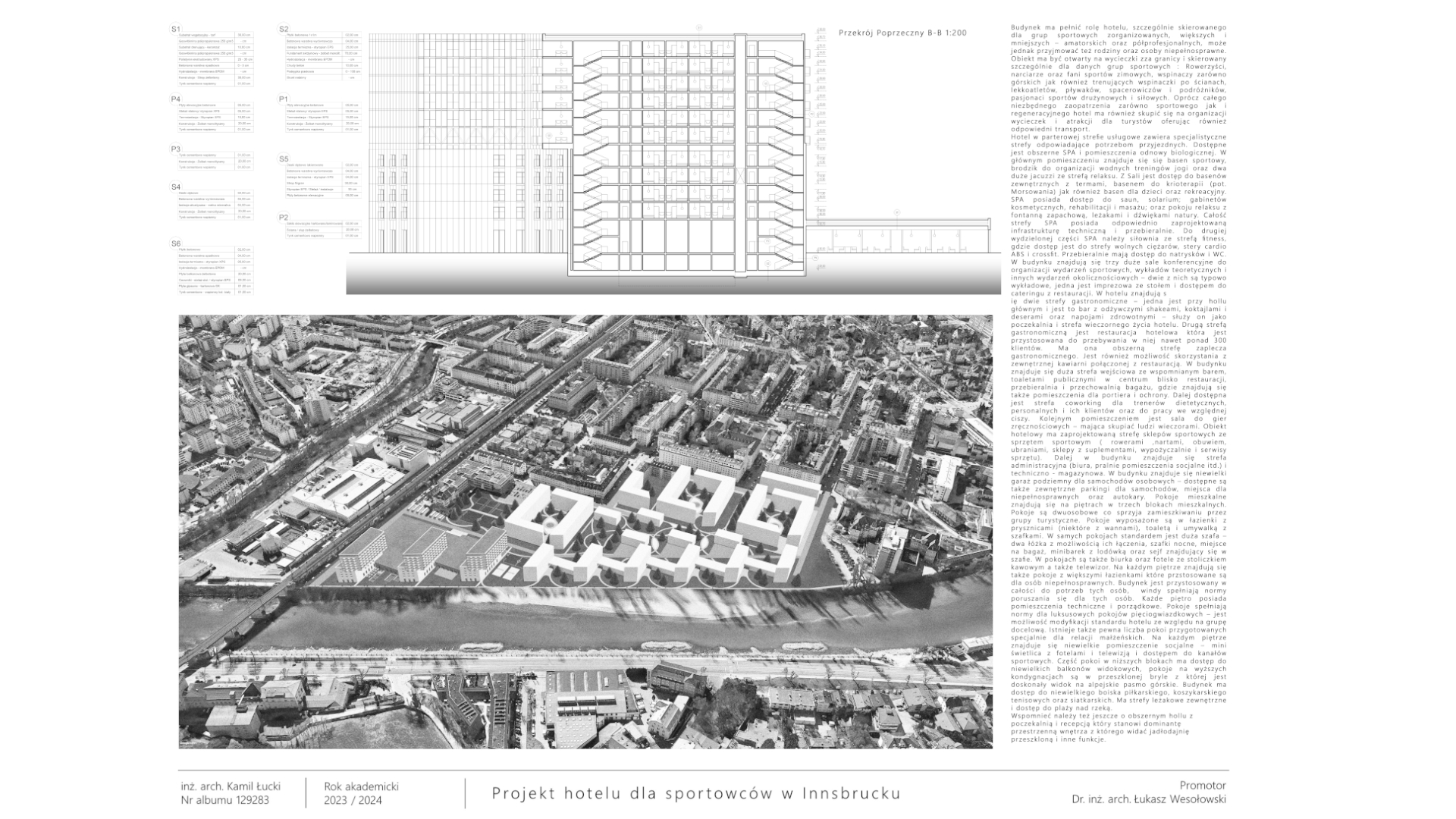 Projektowany hotel to nowoczesny obiekt, skierowany głównie do grup sportowych, zarówno amatorskich, jak i półprofesjonalnych, ale także rodzin oraz osób niepełnosprawnych. Znajdują się tu rozbudowane strefy usługowe, w tym SPA z basenami, saunami, gabinetami kosmetycznymi i siłownią. Hotel oferuje też sale konferencyjne, przestrzeń coworkingową oraz strefę rekreacyjną z salą gier. Dla gości dostępne są sklepy sportowe, restauracja, bar oraz kawiarnia. Pokoje mieszkalne są dwuosobowe, wyposażone w łazienki i inne udogodnienia, a część z nich przystosowana jest dla osób niepełnosprawnych. Budynek, z przeszkloną elewacją i zielonym dachem, nawiązuje do lokalnej zabudowy, a jego geometria podkreśla harmonijne połączenie z otaczającym krajobrazem. Wokół obiektu znajdują się boiska sportowe, strefy relaksu oraz dostęp do plaży nad rzeką. Hotel oferuje pełne zaplecze do treningu, regeneracji oraz rekreacji, tworząc idealne warunki dla aktywnych turystów i sportowców.