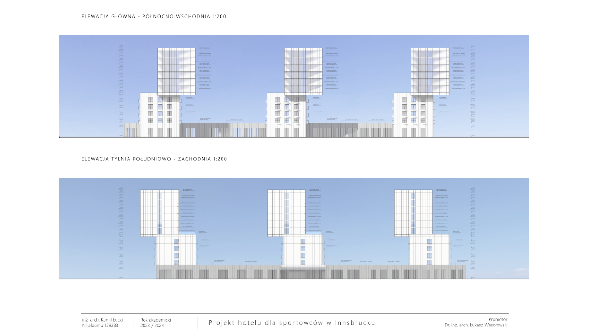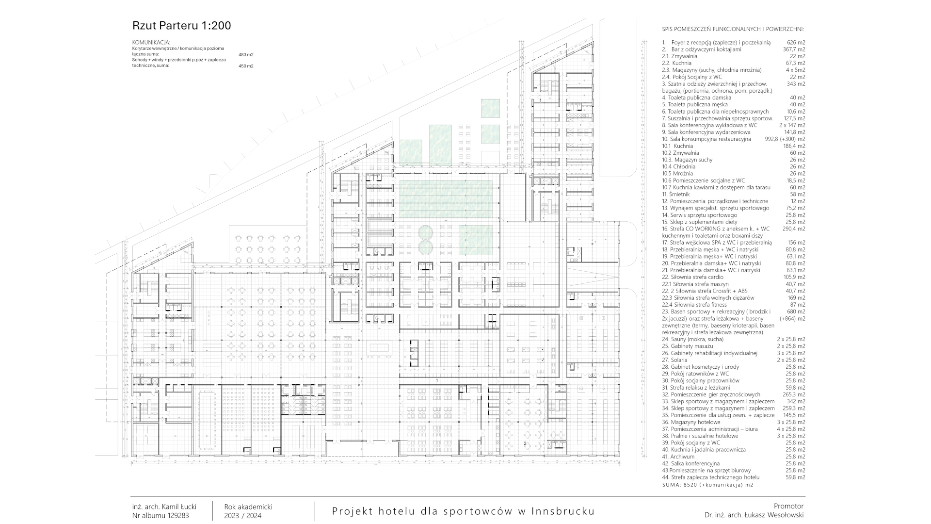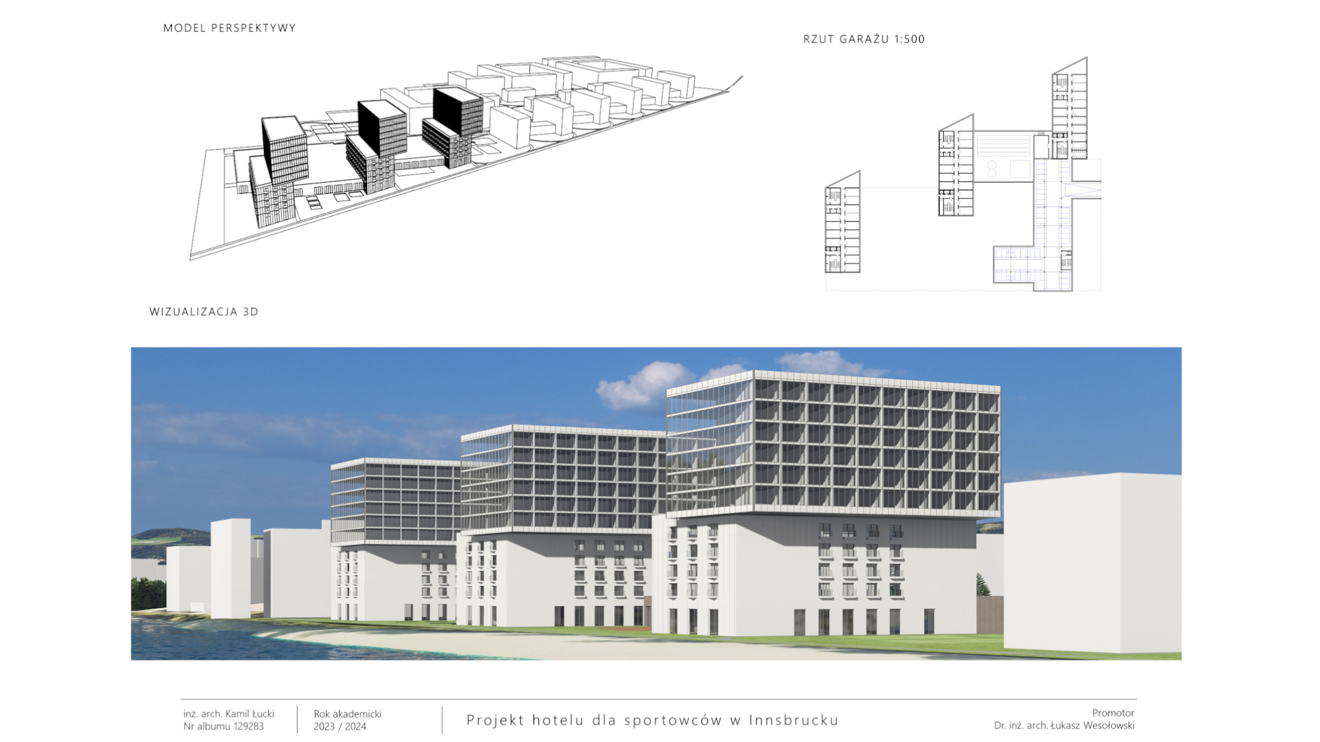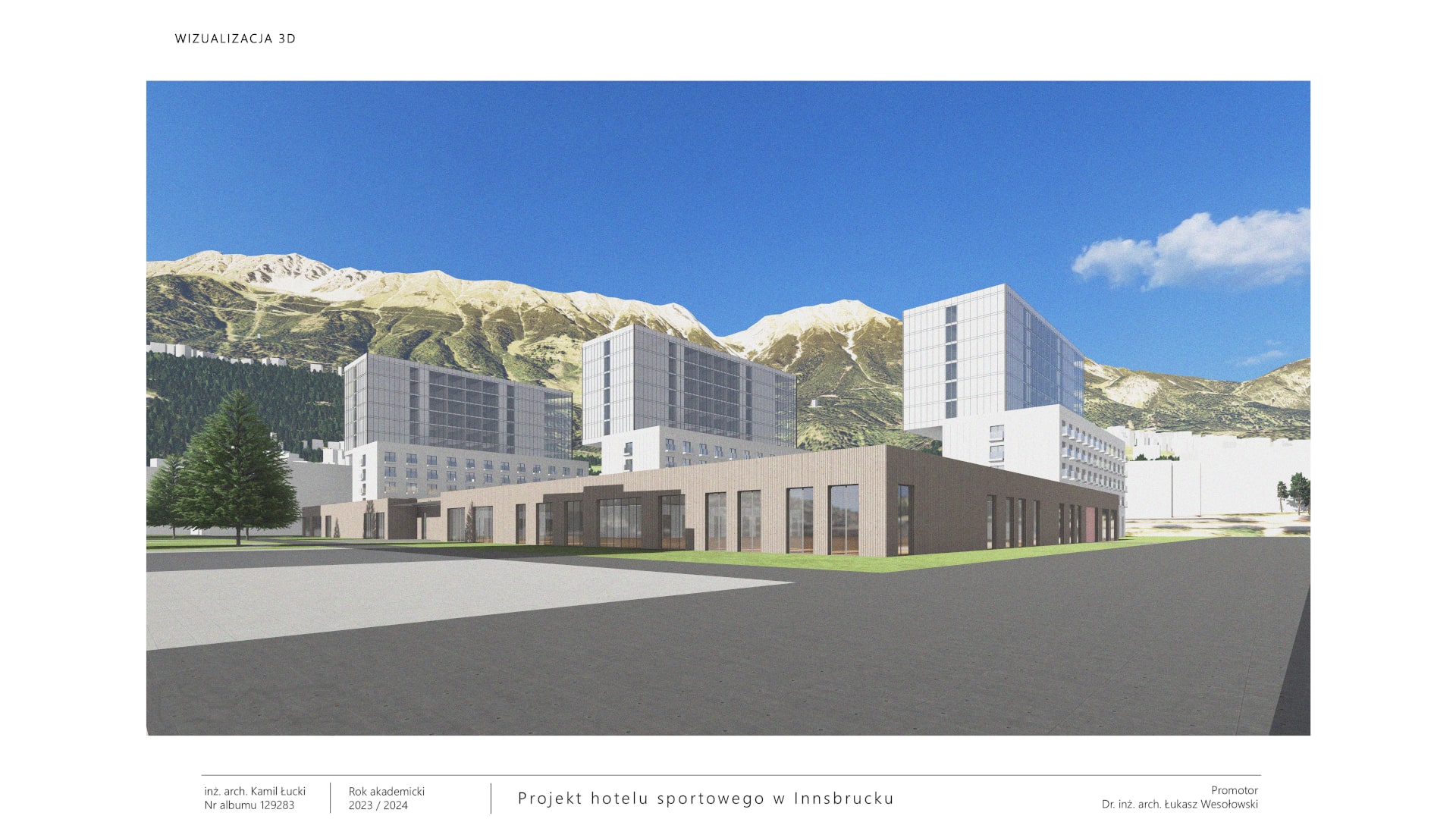 Projektowany hotel to nowoczesny obiekt, skierowany głównie do grup sportowych, zarówno amatorskich, jak i półprofesjonalnych, ale także rodzin oraz osób niepełnosprawnych. Znajdują się tu rozbudowane strefy usługowe, w tym SPA z basenami, saunami, gabinetami kosmetycznymi i siłownią. Hotel oferuje też sale konferencyjne, przestrzeń coworkingową oraz strefę rekreacyjną z salą gier. Dla gości dostępne są sklepy sportowe, restauracja, bar oraz kawiarnia. Pokoje mieszkalne są dwuosobowe, wyposażone w łazienki i inne udogodnienia, a część z nich przystosowana jest dla osób niepełnosprawnych. Budynek, z przeszkloną elewacją i zielonym dachem, nawiązuje do lokalnej zabudowy, a jego geometria podkreśla harmonijne połączenie z otaczającym krajobrazem. Wokół obiektu znajdują się boiska sportowe, strefy relaksu oraz dostęp do plaży nad rzeką. Hotel oferuje pełne zaplecze do treningu, regeneracji oraz rekreacji, tworząc idealne warunki dla aktywnych turystów i sportowców.