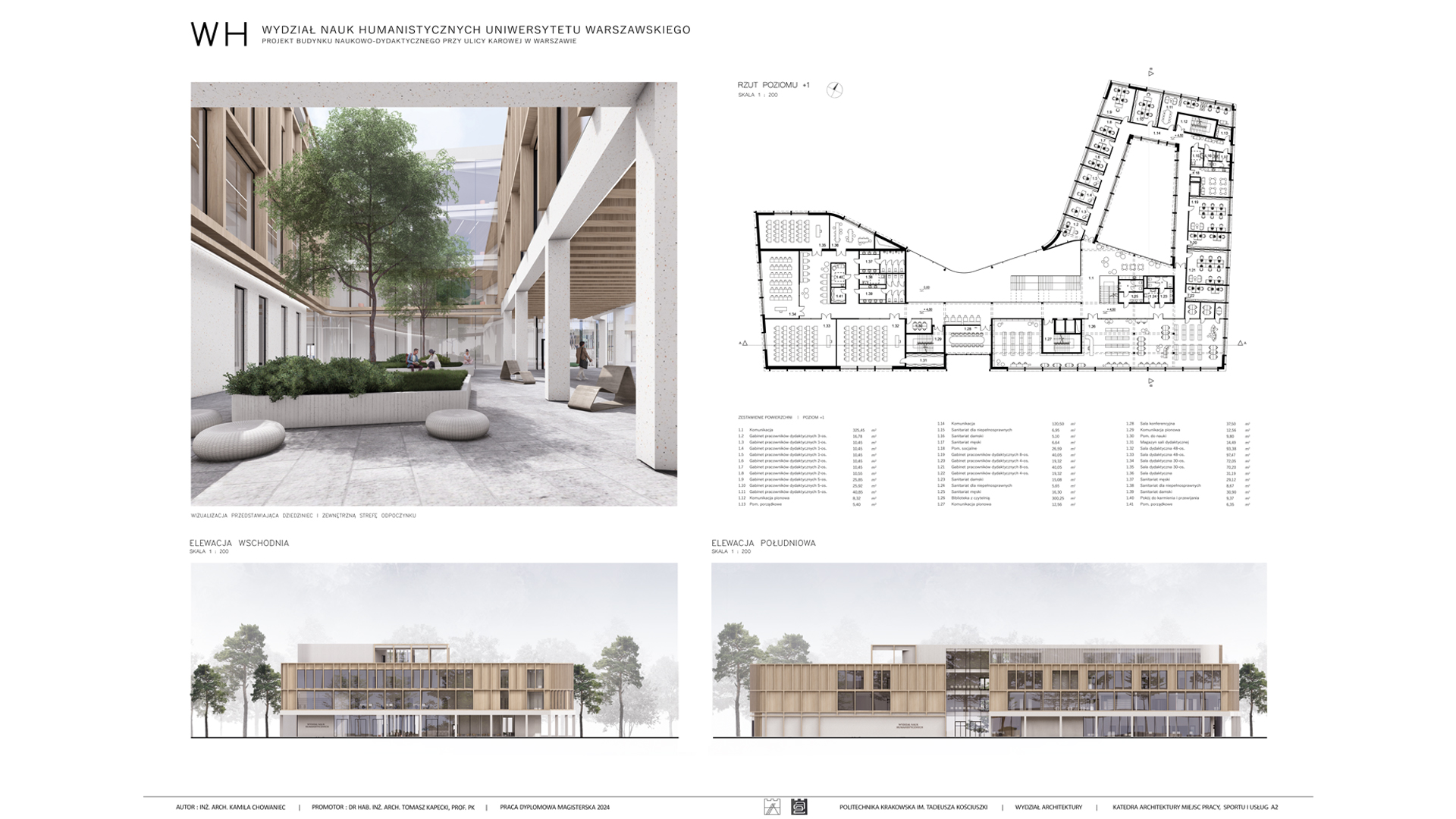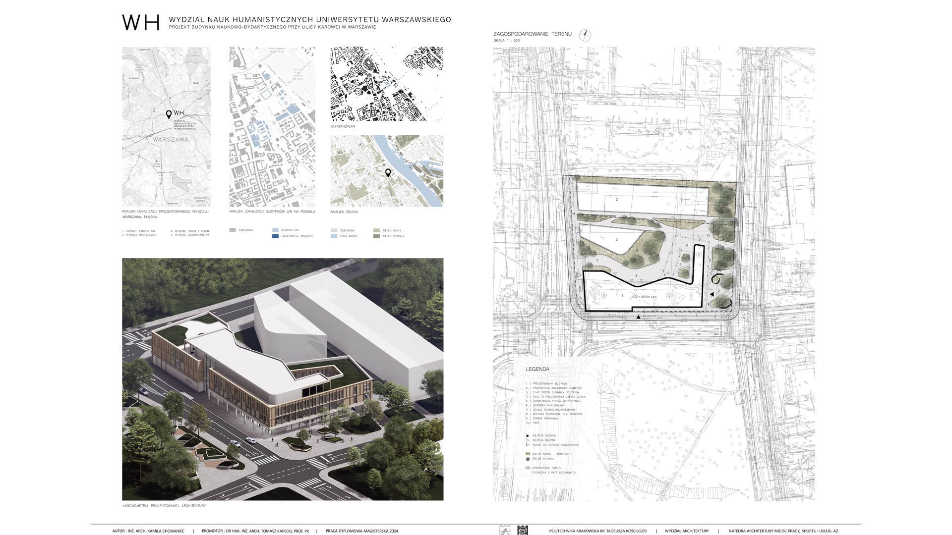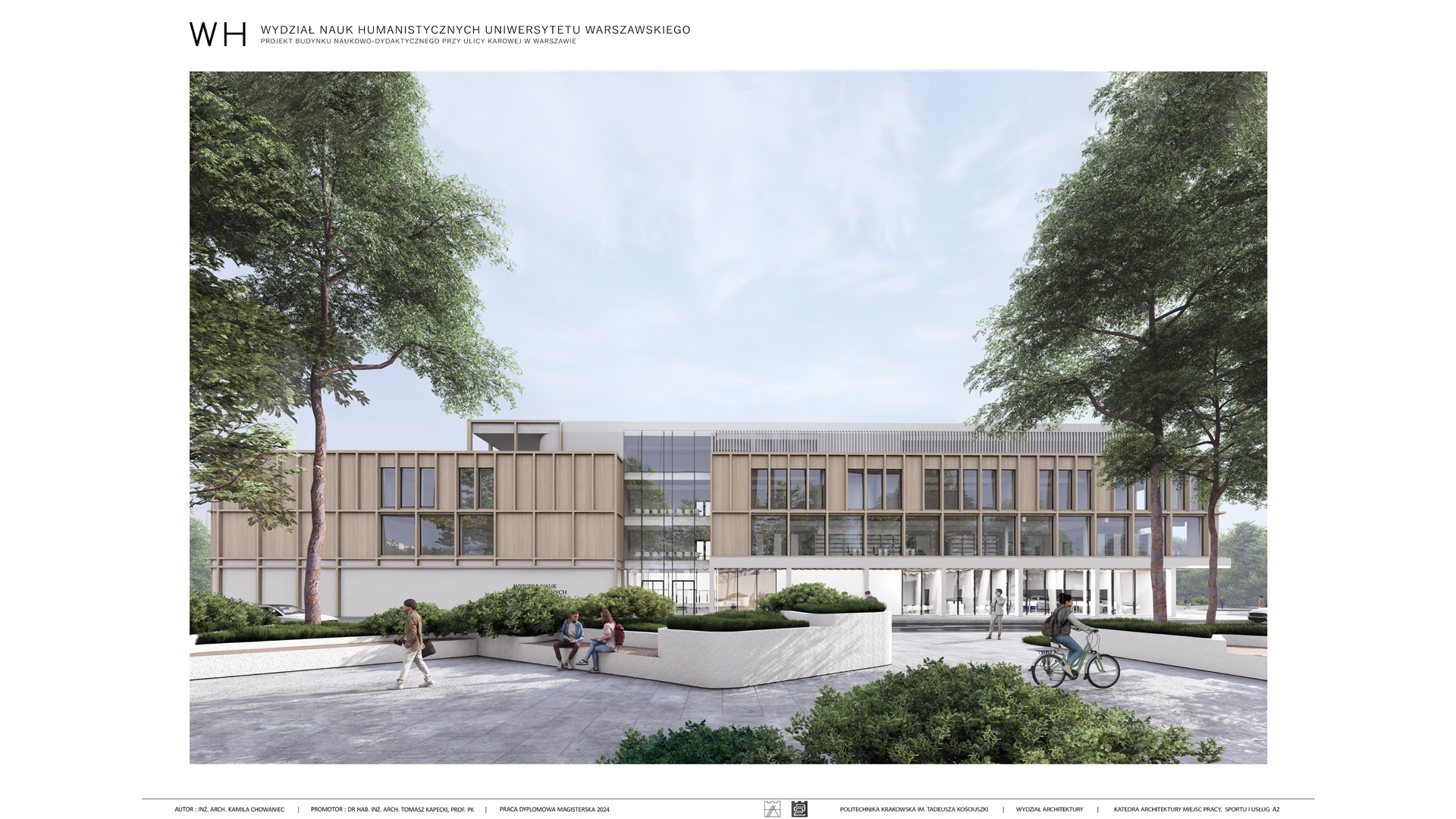 Głównym założeniem projektowym Wydziału Nauk Humanistycznych było stworzenie nowoczesnej i funkcjonalnej przestrzeni edukacyjnej. Architektura swoją formą ma za zadanie sprzyjać integracji społecznej oraz wszechstronnemu rozwojowi studentów. Istotne było zapewnienie środowiska, które inspiruje do nauki oraz twórczego myślenia. Inspiracją dla projektu stały się idee humanizmu. Człowiek jako jednostka świadoma swej godności i możliwości potrafi swoim talentem i wiedzą kształtować otaczającą go rzeczywistość. Twórczość jest cechą charakterystyczną ludzi, dlatego też projekt budynku Wydziału Nauk Humanistycznych pozostawia przestrzeń na kreatywność i samodoskonalenie. Budynek zaprojektowano jako elastyczny i łatwo adaptowalny. Projekt elewacji przewiduje materiały inspirowane naturalnymi surowcami, takimi jak  drewno oraz kamień. Od strony głównych ulic forma budynku jest prostopadłościenna. Wpisuje się w architekturę Powiśla oraz domyka kwartał zabudowy. Natomiast od strony wnętrza kwartału budynek charakteryzują obłe, miękkie formy oraz duże przeszklenia.