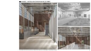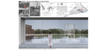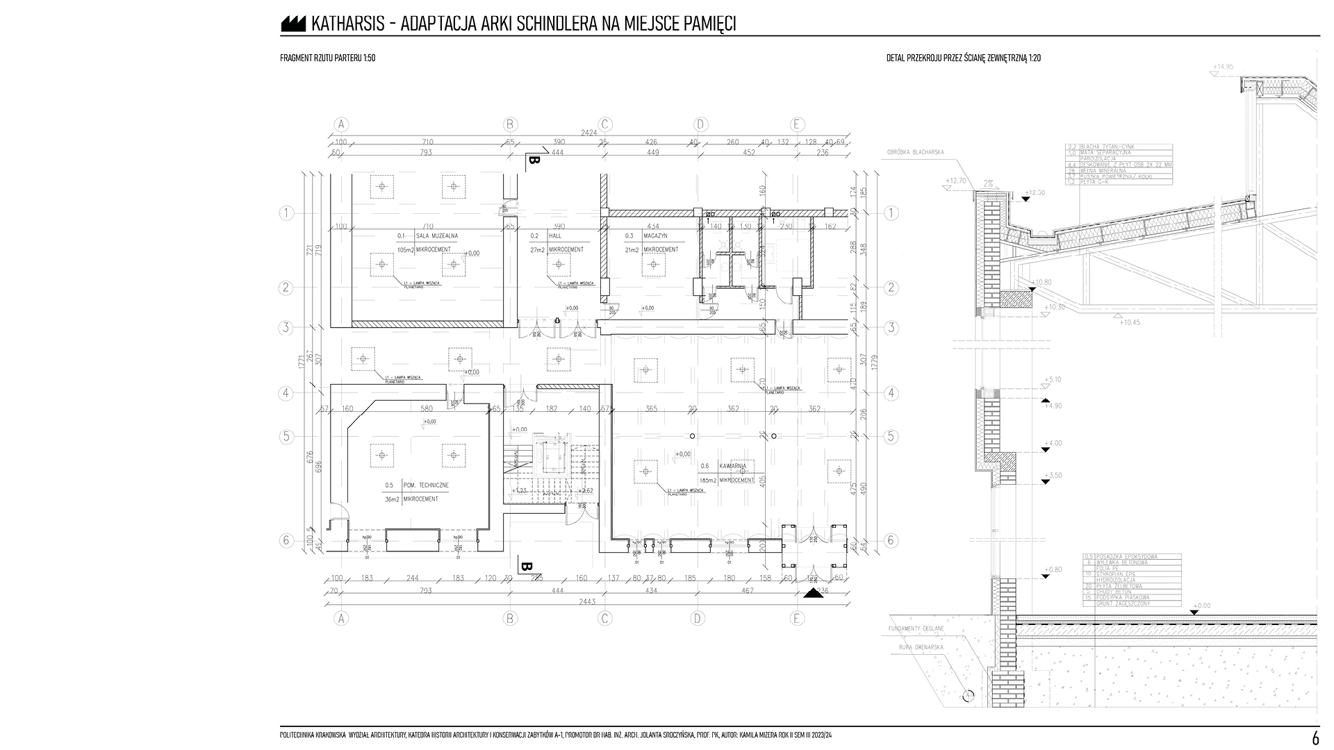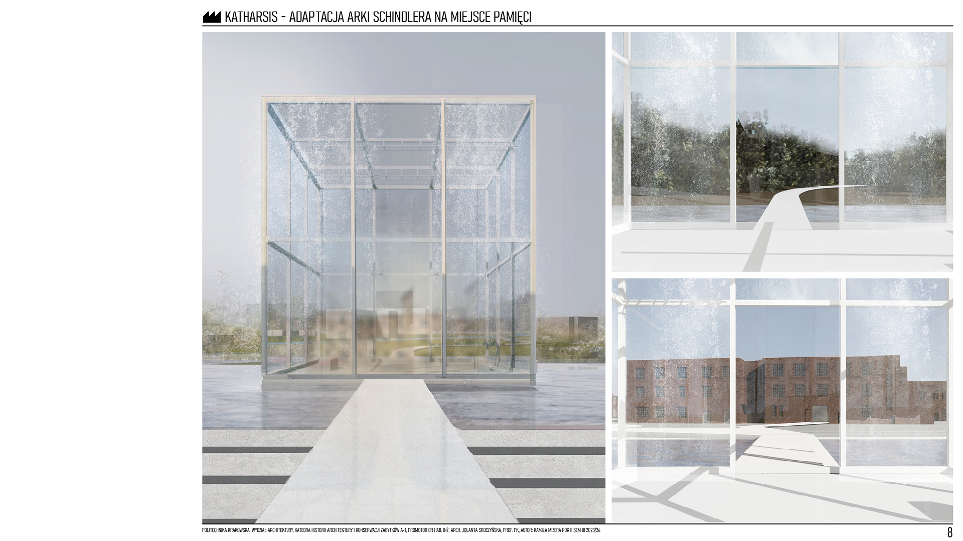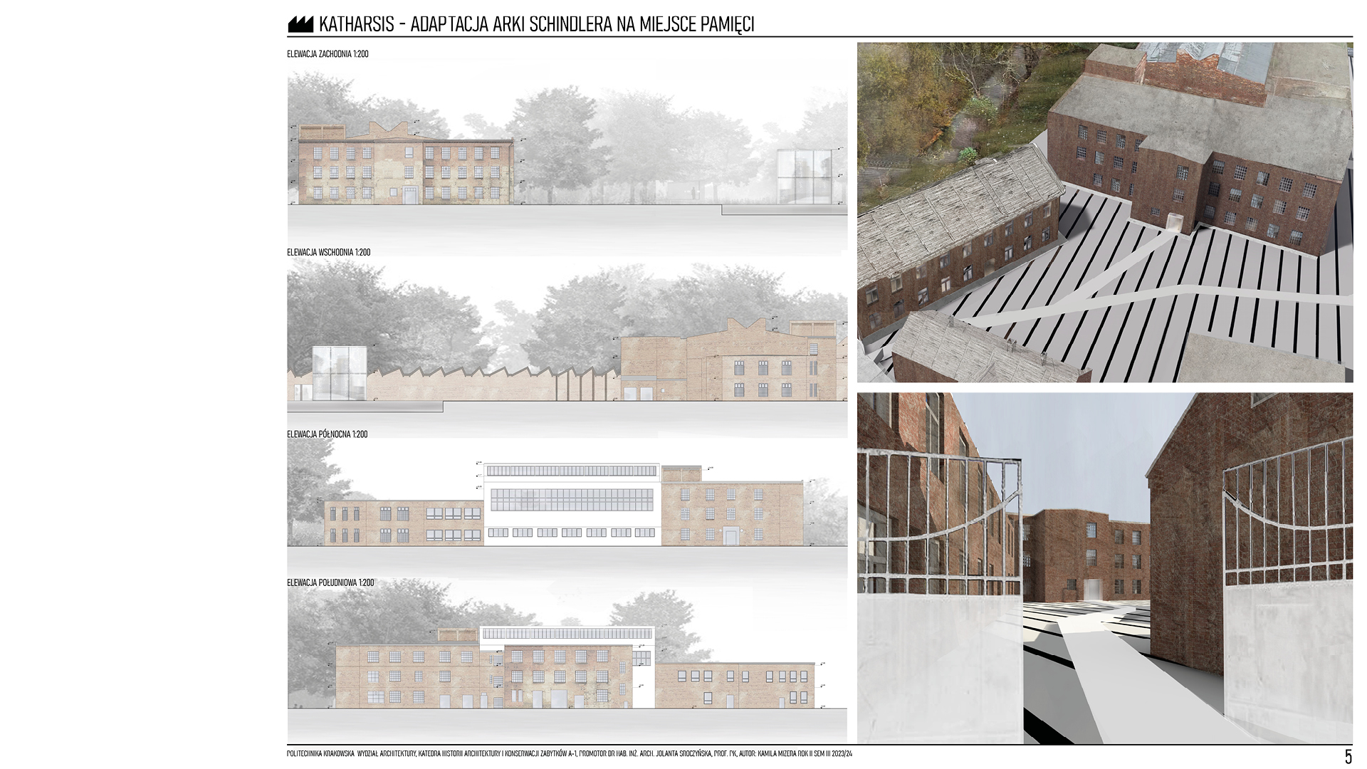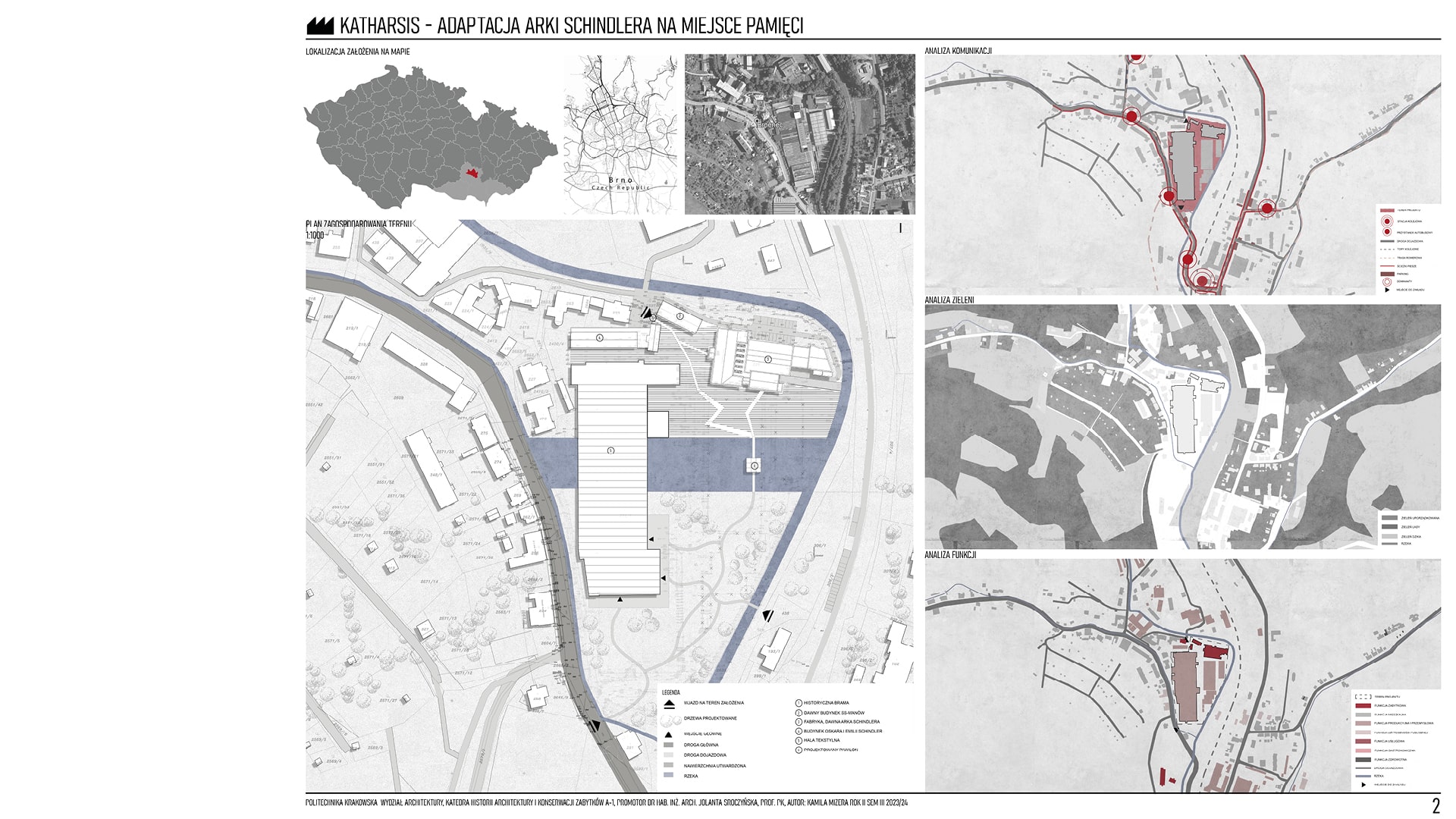 Miejscowość Brněnec po II wojnie światowej została zapomniana wśród mieszkańców Czech jak i Europy. Pamięć o wydarzeniach, które niegdyś miały miejsce w dawnej fabryce Löw-Beer’ów w Brněnec: o ocaleniu 1200 Żydów dzięki Oskarowi Schindlerowi oraz o filii obozu koncentracyjnego Groß-Rosen Brünnlitz powinna zostać przywrócona. Współcześnie właściciele fabryki podejmują próby mające na celu przywrócenie tożsamości do założenia oraz ponownej adaptacji miejsca na nową funkcję spełniającą oczekiwania zarówno mieszkańców jak i odwiedzających miejscowość. Działania te obejmują ponowną aktywizację spotkań odbywających się na terenie kompleksu mających na celu upamiętnienie przeszłych wydarzeń. W projekcie dyplomowym przedstawiona została adaptacja Arki Schindlera na miejsce pamięci. Obejmuje ona program zarówno dla mieszkańców proponując wielofunkcyjne centrum warsztatowe w hali znajdującej się w zachodniej części założenia oraz szczegółowe rozwiązania w zakresie adaptacji dawnej fabryki Löw-Beer’ów, tytułowej Arki Schindlera, na miejsce pamięci z wystawami o tematyce zarówno historii fabryki jak i o filii obozu koncentracyjnego Groß-Rosen Brünnlitz, ocalenia przez Oskara Schindlera Żydów oraz dalszych losów osób ocalonych po zakończeniu II wojny światowej. Opracowanie zawiera również propozycję rozwiązań w zakresie urbanistyki, dostęp do przeszłości w założeniu zostanie dosadnie odcięty od przyszłości dzięki umieszczeniu w projekcie pasa wody na terenie założenia, które będzie nawiązywać do oczyszczenia oraz okolicznego krajobrazu miejscowości Brněnec. Na wodzie znajdować się będzie przestrzeń kontemplacji – przeszklony pawilon ocalałych, z którego przechodząc przez kładkę odwiedzający kompleks kierować się będą w stronę zielonej części założenia, znajdującej się w południowej części działki symbolizującego jednocześnie wolność.