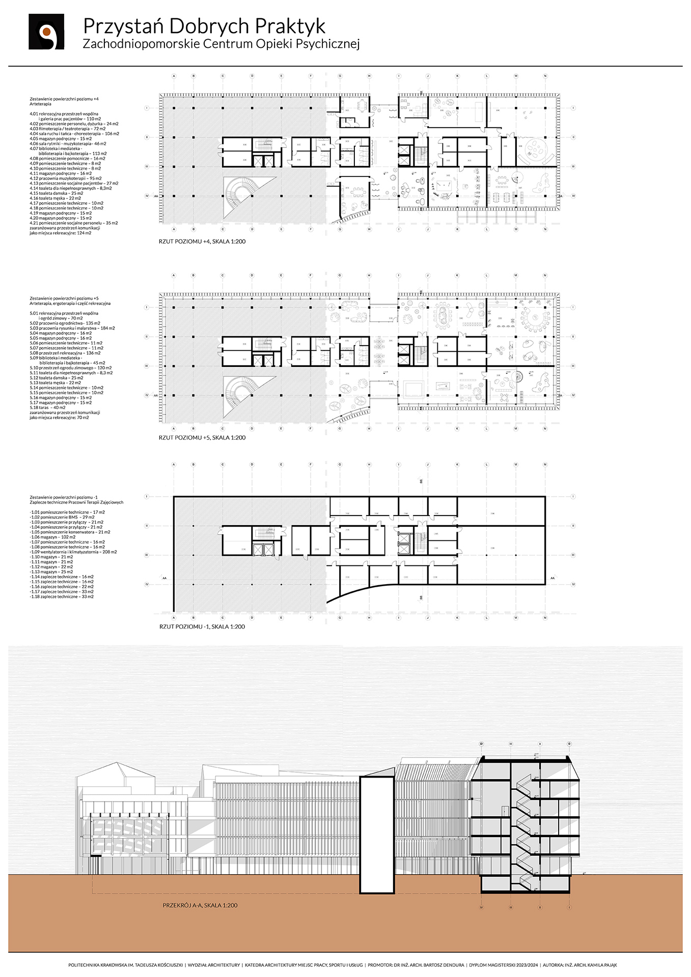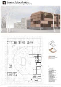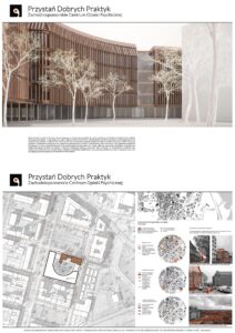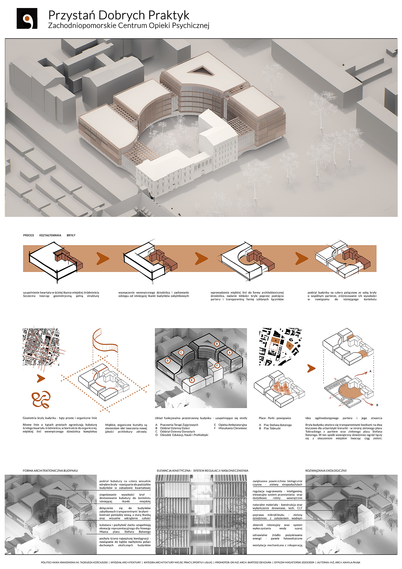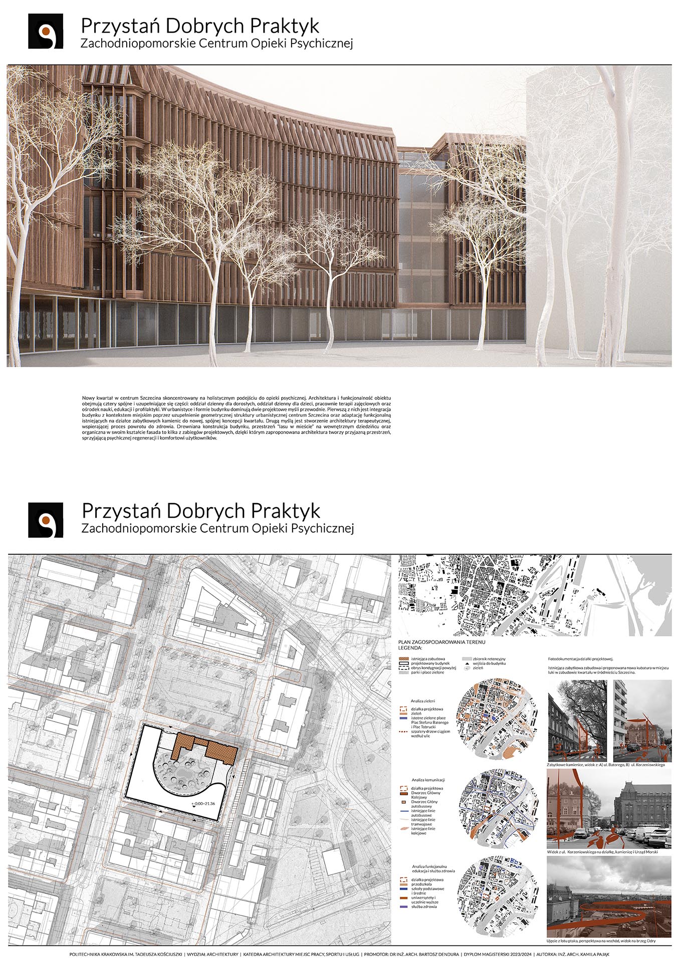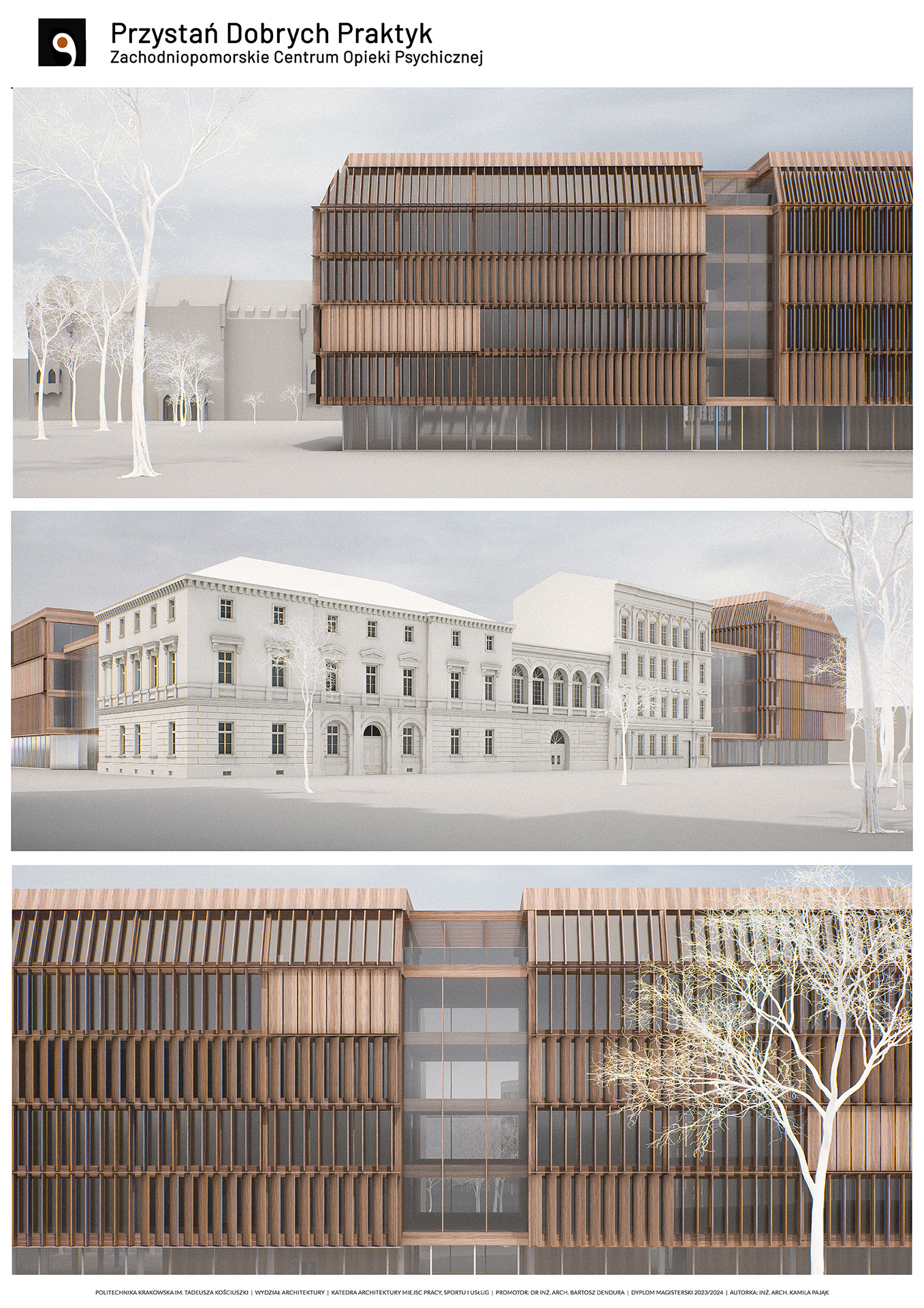 Przedmiotem projektu “Przystań Dobrych Praktyk” czyli Zachodniopomorskiego Centrum Zdrowia Psychicznego jest budynek kompleksu skupiającego się na holistycznym podejściu do opieki psychicznej. Architektura i funkcjonalność obiektu obejmują cztery spójne i uzupełniające się części: oddział dzienny dla dorosłych, oddział dzienny dla dzieci, pracownie terapii zajęciowych oraz ośrodek nauki, edukacji i profilaktyki. W urbanistyce i formie budynku dominują dwie projektowe myśli przewodnie. Pierwszą z nich jest integracja budynku z kontekstem miejskim poprzez uzupełnienie geometrycznej struktury urbanistycznej centrum Szczecina dopełniając kwartał na działce projektowej. Dwa istniejące na działce budynki zaadaptowane są funkcjonalnie do nowej, spójnej koncepcji kwartału. Drugą myślą jest stworzenie architektury terapeutycznej, wspierającej proces powrotu do zdrowia. Myśl ta realizowana jest między innymi poprzez zaproponowanie drewnianej konstrukcji budynku, przestrzeni “lasu w mieście” na wewnętrznym dziedzińcu oraz organicznej w swoim kształcie fasady od strony wewnętrznego dziedzińca. Projekt jest odpowiedzią na wyzwanie stworzenia nowej jakości architektury terapeutycznej, kreującej przyjazną przestrzeń, która sprzyja psychicznej regeneracji i komfortowi użytkowników.