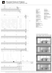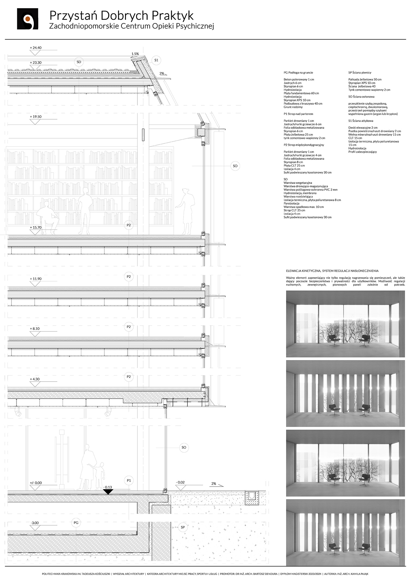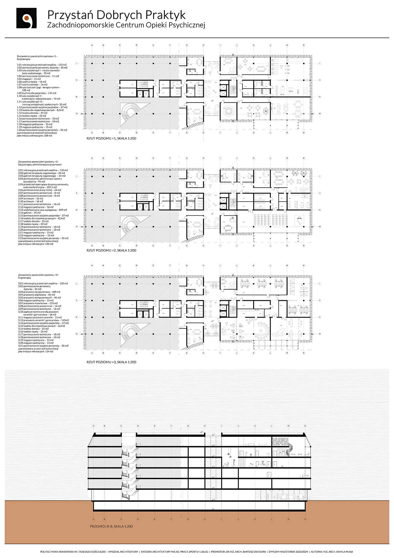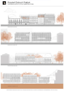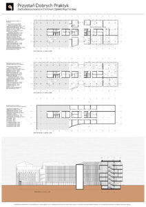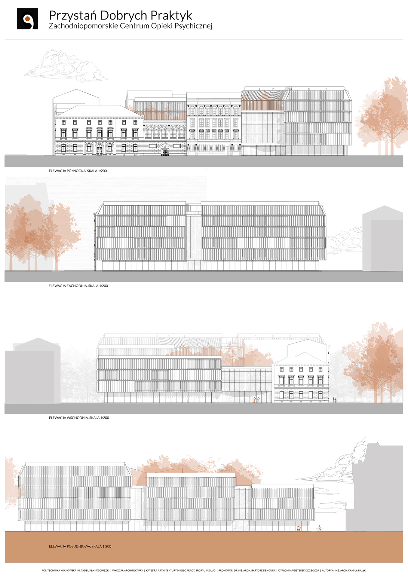 Przedmiotem projektu “Przystań Dobrych Praktyk” czyli Zachodniopomorskiego Centrum Zdrowia Psychicznego jest budynek kompleksu skupiającego się na holistycznym podejściu do opieki psychicznej. Architektura i funkcjonalność obiektu obejmują cztery spójne i uzupełniające się części: oddział dzienny dla dorosłych, oddział dzienny dla dzieci, pracownie terapii zajęciowych oraz ośrodek nauki, edukacji i profilaktyki. W urbanistyce i formie budynku dominują dwie projektowe myśli przewodnie. Pierwszą z nich jest integracja budynku z kontekstem miejskim poprzez uzupełnienie geometrycznej struktury urbanistycznej centrum Szczecina dopełniając kwartał na działce projektowej. Dwa istniejące na działce budynki zaadaptowane są funkcjonalnie do nowej, spójnej koncepcji kwartału. Drugą myślą jest stworzenie architektury terapeutycznej, wspierającej proces powrotu do zdrowia. Myśl ta realizowana jest między innymi poprzez zaproponowanie drewnianej konstrukcji budynku, przestrzeni “lasu w mieście” na wewnętrznym dziedzińcu oraz organicznej w swoim kształcie fasady od strony wewnętrznego dziedzińca. Projekt jest odpowiedzią na wyzwanie stworzenia nowej jakości architektury terapeutycznej, kreującej przyjazną przestrzeń, która sprzyja psychicznej regeneracji i komfortowi użytkowników.