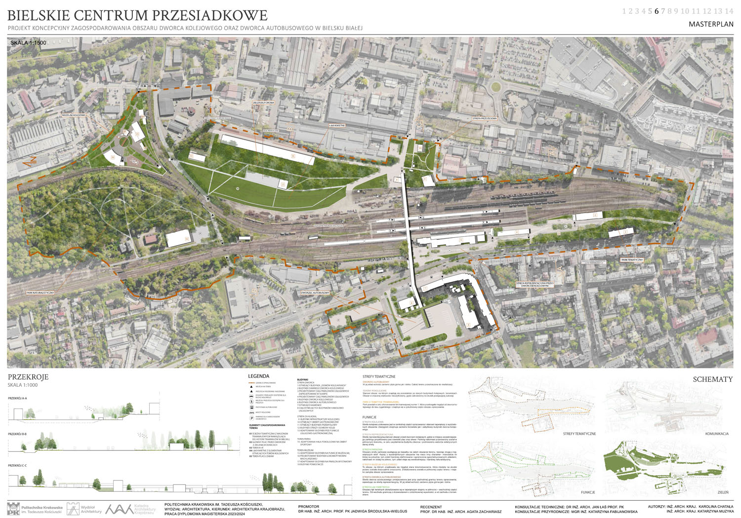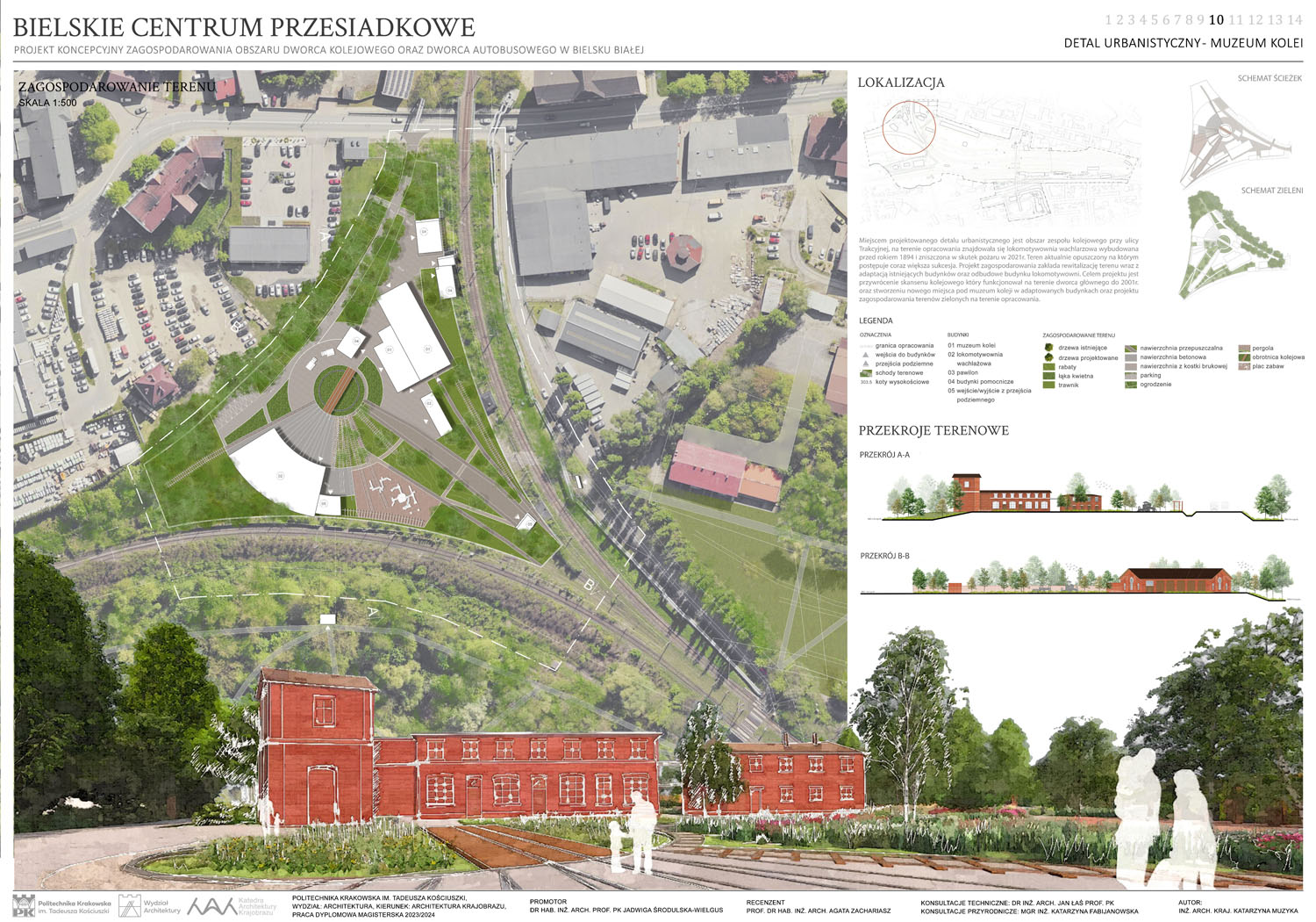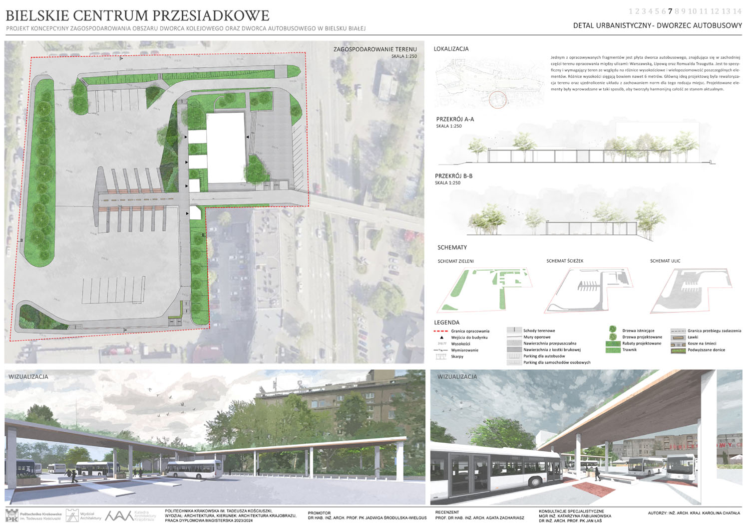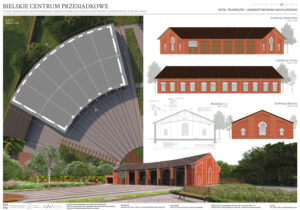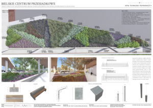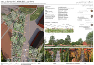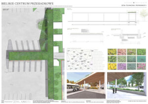 Tytuł ,,Bielskie centrum przesiadkowe’’ nawiązywać ma do planowanej, inwestycji w Bielsku-Białej jaką jest budowa nowego centrum przesiadkowego. Jest to ogromna inwestycja, która pomimo konkursów i ogłoszonych przetargów wciąż pozostaje nierozstrzygnięta. Z pewnością wpływa na to fakt, że przedstawiane wizje są mocno futurystyczne i bardzo trudne do zrealizowania ze względu na specyfikę tego obszaru. Proponowany przez nas projekt, podchodzi do tematu z zupełnie innej strony, bazując na stanie obecnym i wprowadzając jedynie modyfikacje. Główną ideą projektową jest stworzenie koncepcji zagospodarowania terenu, która ma na celu podniesienie walorów estetycznych i funkcjonalnych opracowywanego obszaru z uwzględnieniem jego aktualnego charakteru i wartości historycznej. Dodatkowo, projekt zakłada udostępnienie aktualnie nieużytkowanych terenów zielonych w taki sposób, aby maksymalnie zachować ich naturalistyczny charakter. Ze względu na planowaną inwestycję budowy nowego centrum przesiadkowego, wprowadzana zieleń bazowana na łąkach kwietnych tworzy niejako rozwiązanie tymczasowe.