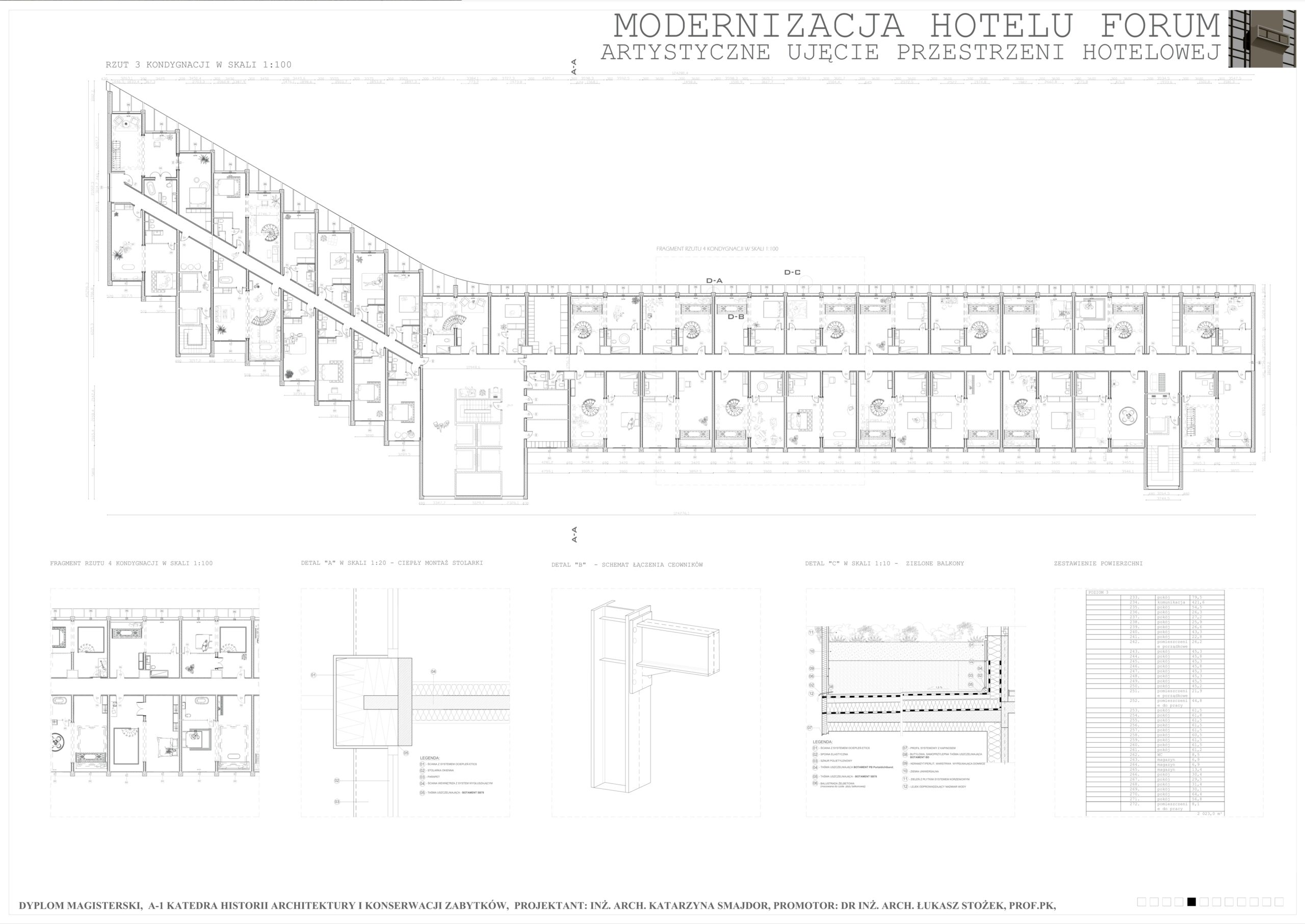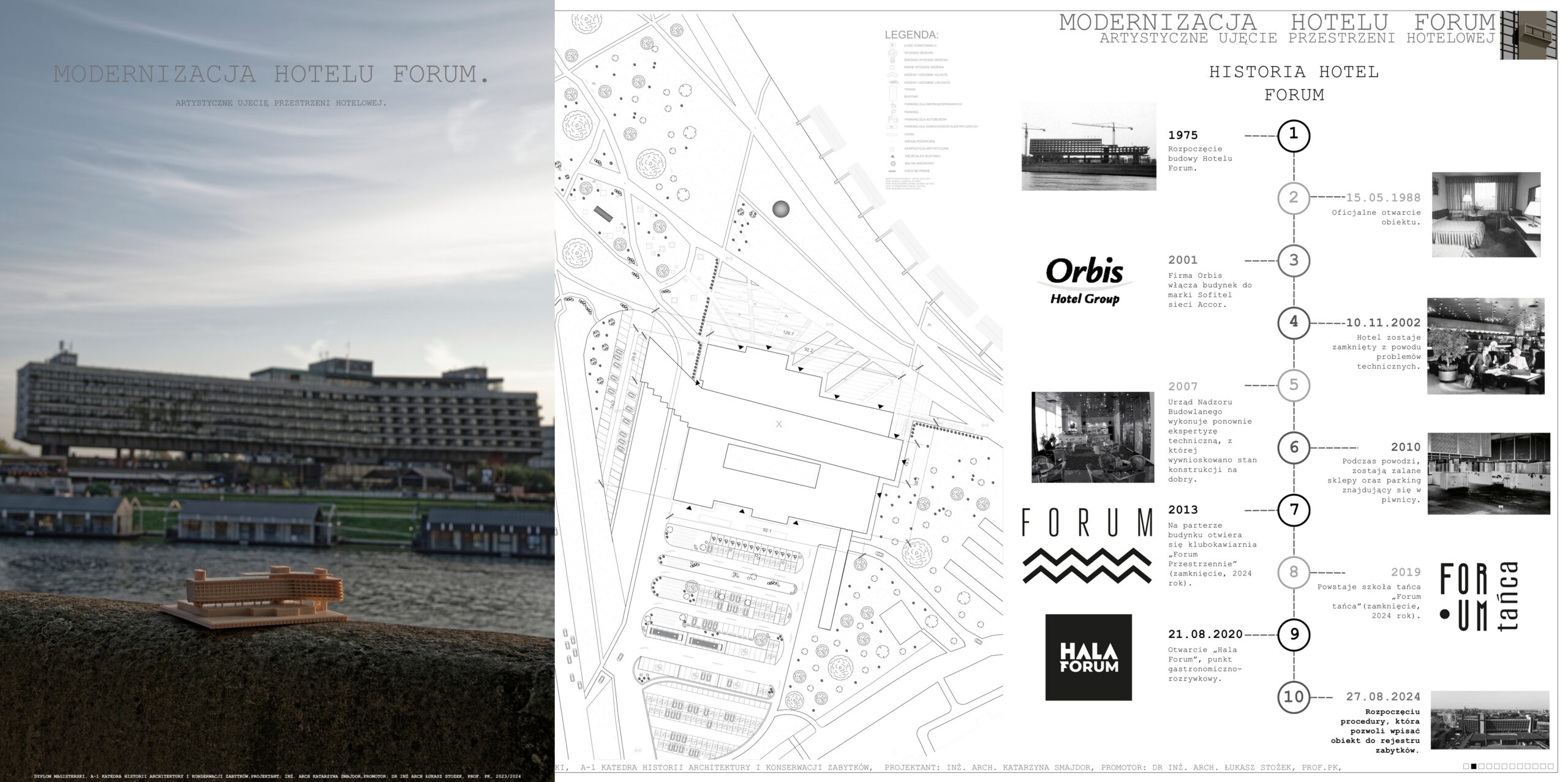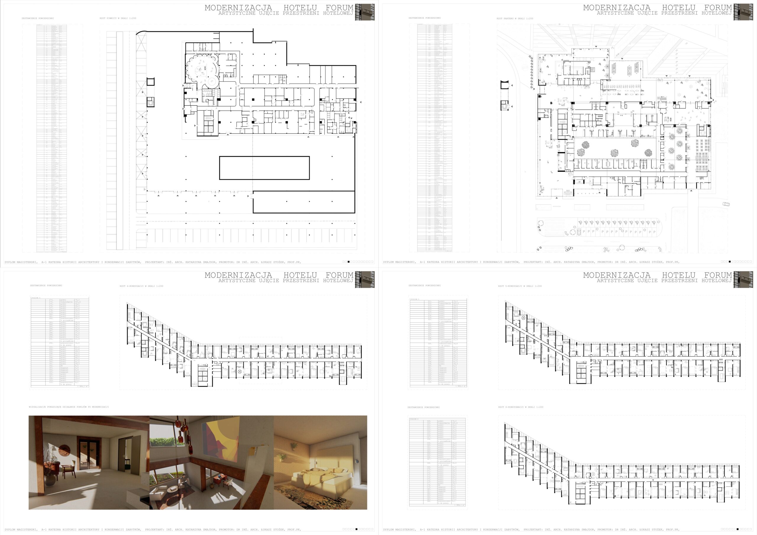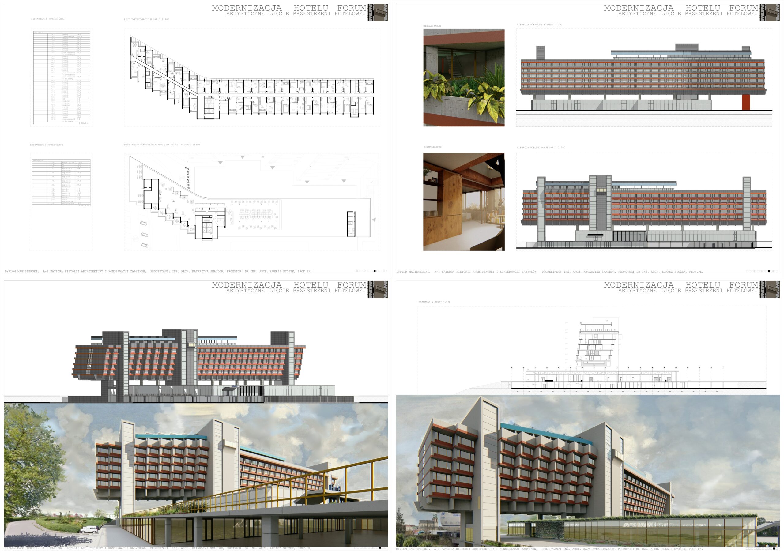 Prezentowana praca naukowa stanowi kompleksową analizę możliwości modernizacyjnych Hotelu Forum w Krakowie, ikony polskiej architektury modernistycznej. Celem projektu było opracowanie koncepcji, która przywróci budynkowi dawną świetność, dostosuje go do współczesnych standardów i stworzy przestrzeń spełniającą oczekiwania mieszkańców i gości miasta. Badania obejmowały szczegółową inwentaryzację budynku, analizę archiwalnych dokumentów, a także konsultacje z ekspertami z różnych dziedzin. W wyniku przeprowadzonych badań zidentyfikowano zarówno atuty obiektu, takie jak unikalna architektura i centralna lokalizacja, jak i wyzwania związane z jego obecnym stanem technicznym i funkcjonalnym.