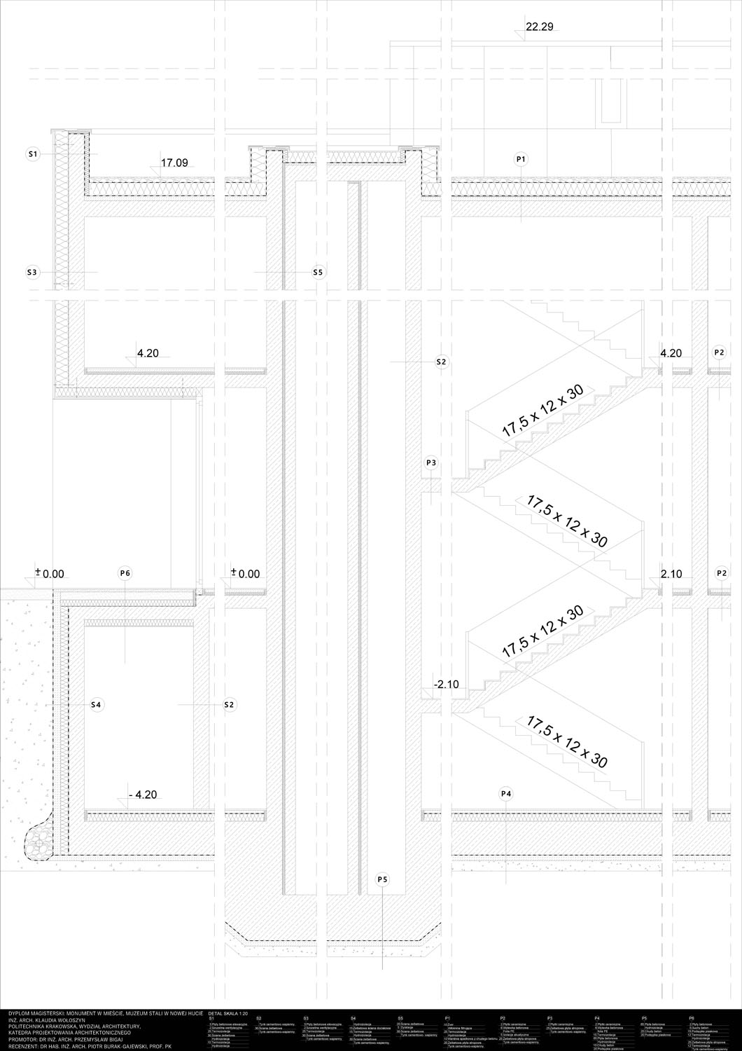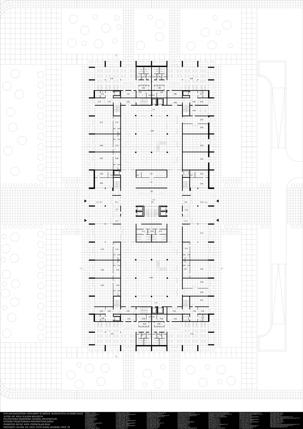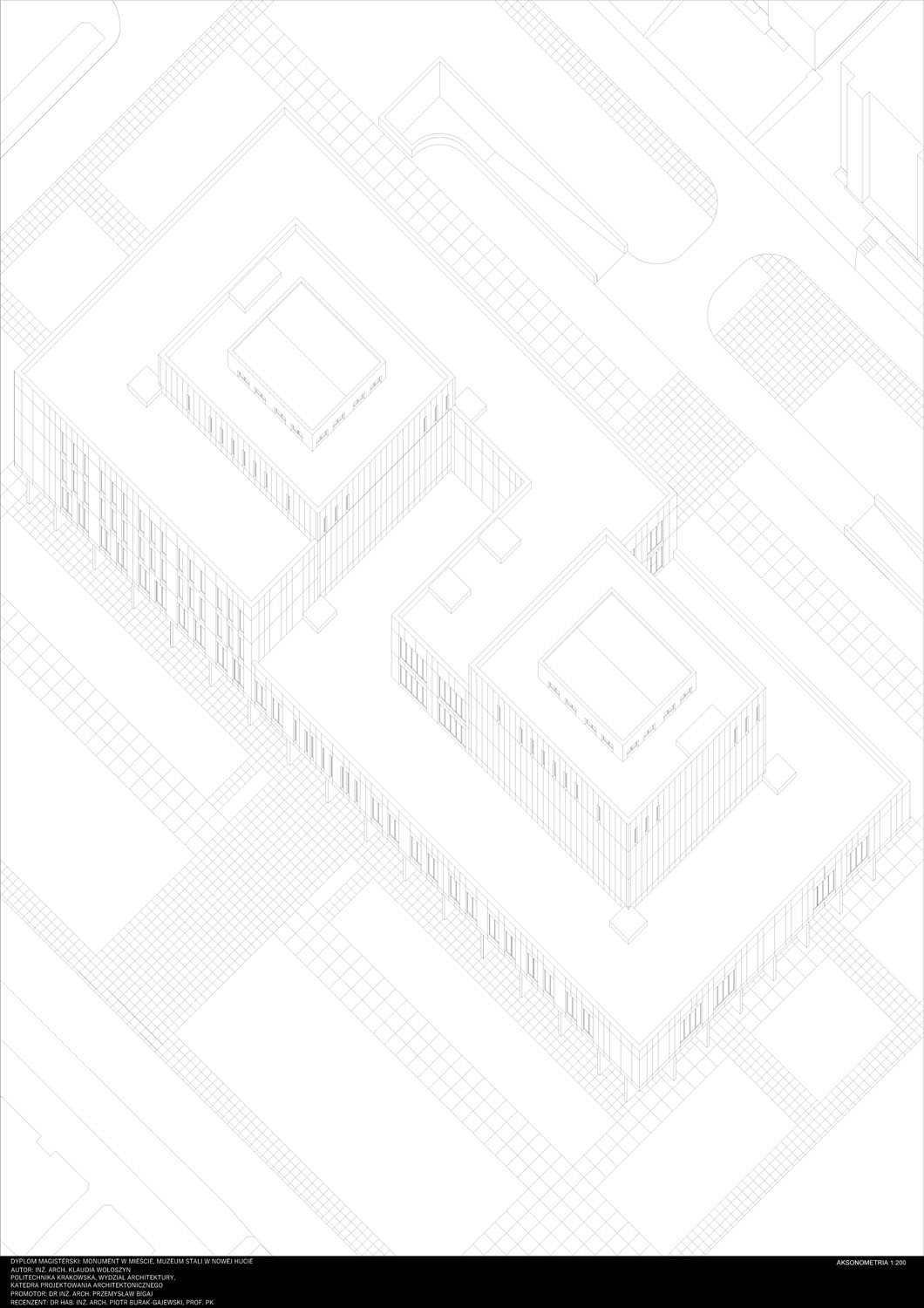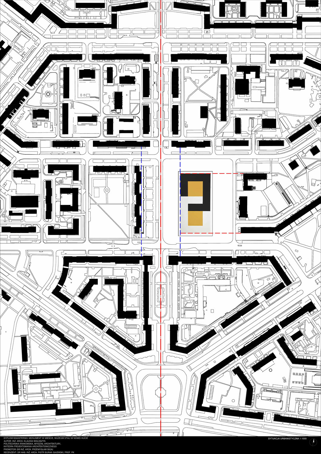 Zadaniem projektowym było stworzenie budynku grającego rolę monumentu miejskiego. Docelowo zadanie to objęło Muzeum Stali w Nowej Hucie. Obiekt zlokalizowano w miejscu obecnego Parku Ratuszowego. Pretekstem do powstania bryły budynku był obraz amerykańskiej malarki – Patsy Krebs. Obraz, z którego czerpana była inspiracja do bryły muzeum powstał na płótnie w roku 1990. Obraz jest symetryczny i zawiera w sobie trzy kolory – biel, czerń oraz dwa żółte kwadraty akcentujące kompozycję. Po wysunięciu wysokości z płaskiego dzieła powstała trójwymiarowa bryła o podstawie prostokąta. Dwie niższe bryły, które nachodzą na siebie wykończone są betonowymi płytami elewacyjnymi co nadaje budowli surowego wyglądu. Swoim ułożeniem nawiązuje on do istniejącego już otoczenia miejskiego poprzez dostosowanie jego wysokości oraz wyrównanie linii elewacji z otaczającą zabudową. Akcentem całego obiektu są dwie wysunięte do góry bryły – na obrazie żółte prostokąty. W projekcie pokryte one zostały blachą kortenowską. Mają one za zadanie tworzyć imitację starych kominów hutniczych nawiązując tym do programu wystaw muzealnych oraz historii miejsca.