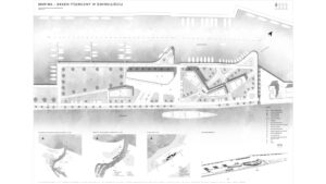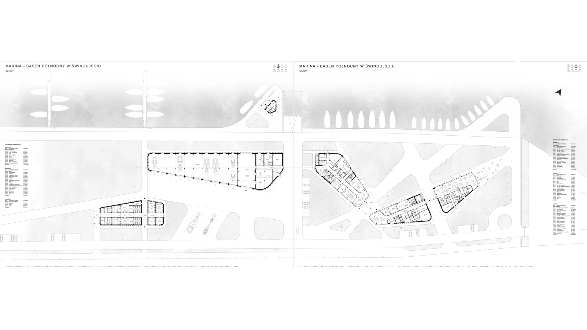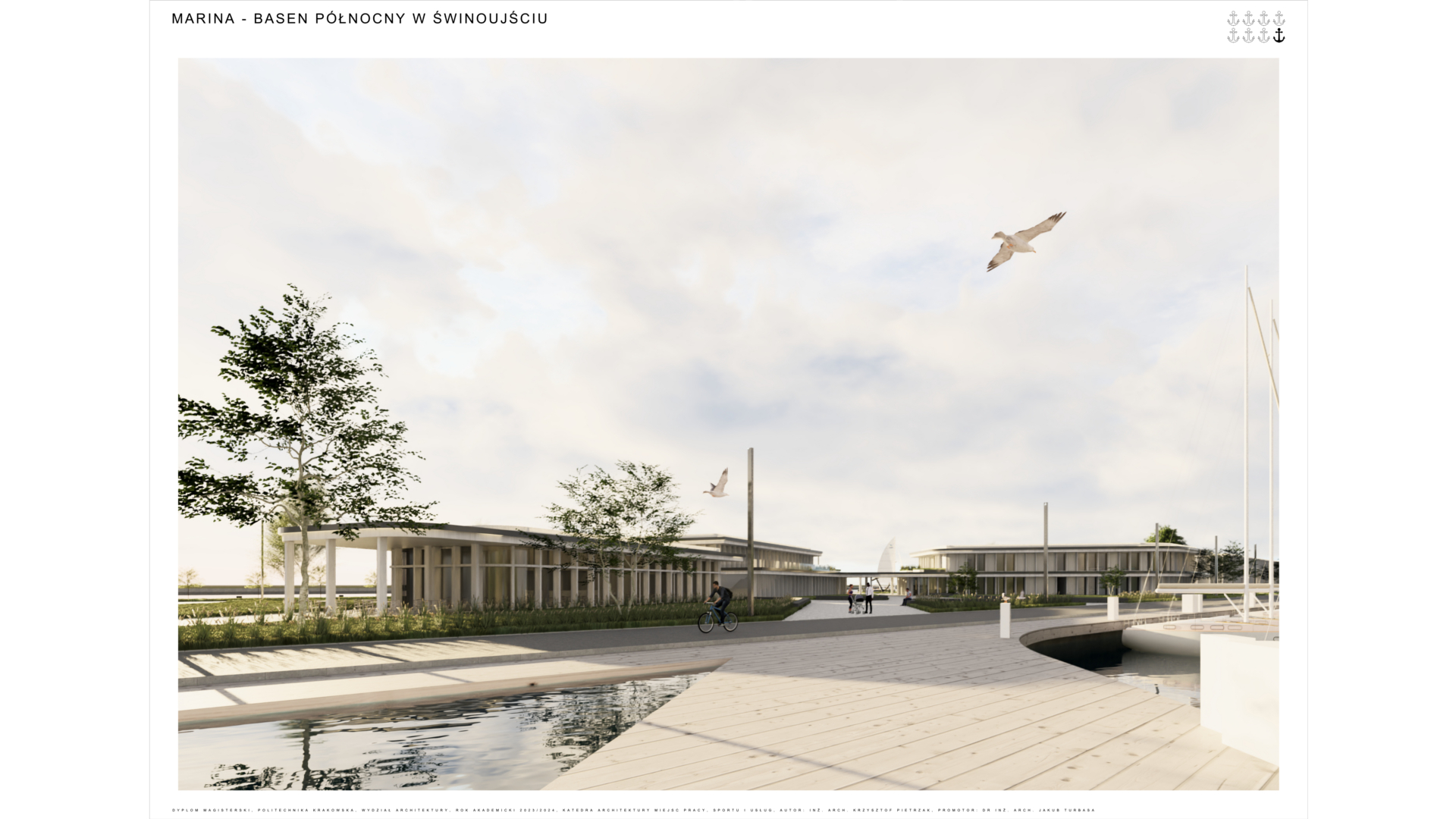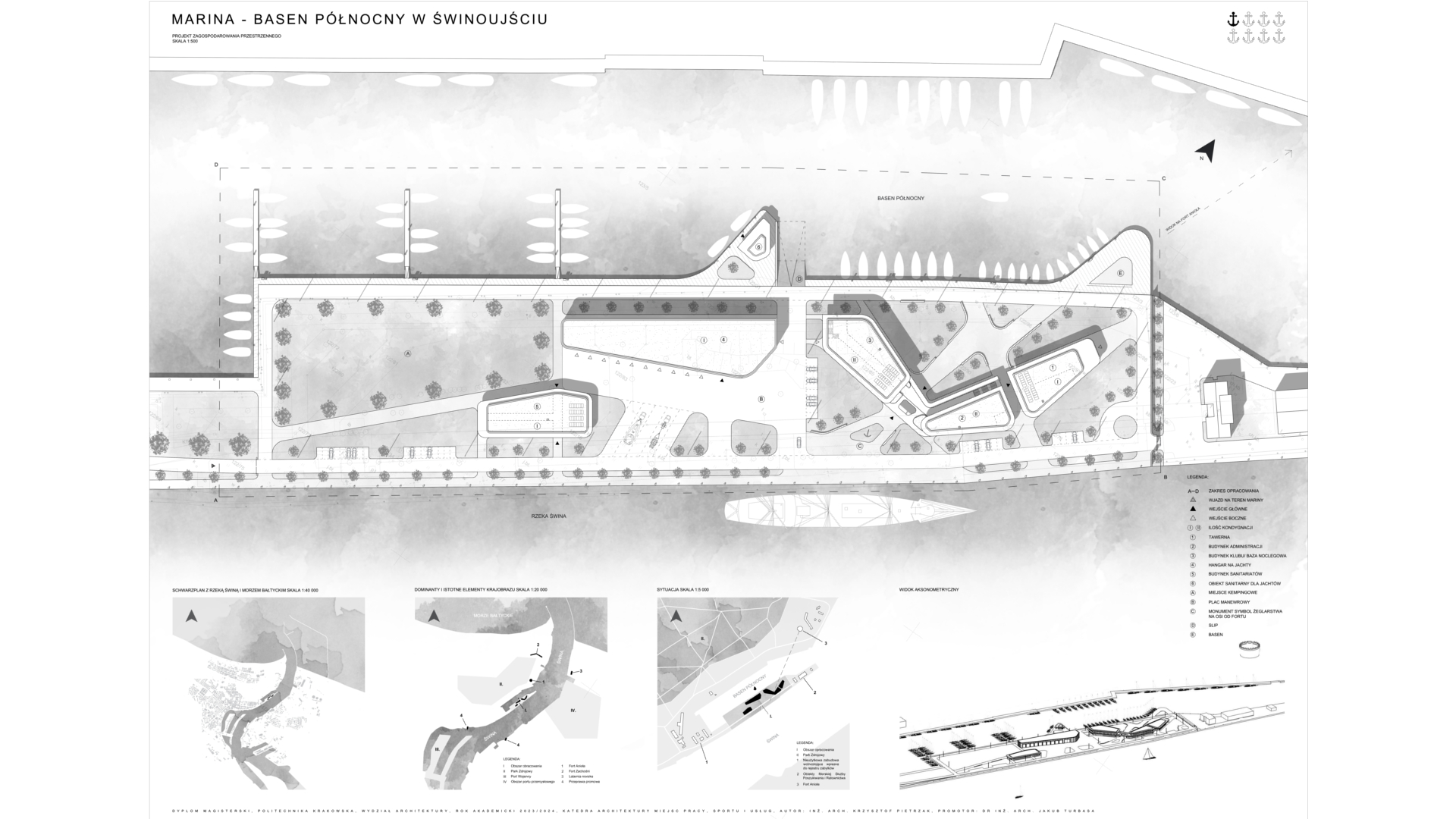 Tematem pracy dyplomowej jest projekt mariny w Świnoujściu. Zlokalizowana została przy ujściu rzeki Świny, na obszarze znanym jako „Basen Północny”. Od strony północnej roztacza się widok na ujście rzeki oraz morze z latarnią morską i Fortem Anioła, a od południowej widok na miejską zabudowę. Od wschodu teren graniczy z basenem portowym oraz parkiem natomiast od zachodu panorama obejmuje infrastrukturę portów przemysłowych. Celem projektu jest harmonijne wkomponowanie obiektu w otaczające go środowisko, z naciskiem na eksponowanie widoków, zwłaszcza na Fort Anioła, jako charakterystyczny punkt orientacyjny. Architektura mariny tworzy wyodrębnione przestrzenie (strefy), z których część publiczna otwierać się będzie w stronę parku i basenu portowego, akcentując widok na fort. Obiekty mają swoją formą nawiązywać do architektury okrętowej, poprzez zaokrąglone narożniki i zastosowanie drewnianych materiałów, odwołujących się do tradycyjnych konstrukcji łodzi. Projekt kompleksu stanowi spójną całość, zapewniając swobodę przemieszczania się, strefowanie oraz komfortową przestrzeń dla żeglarzy.
