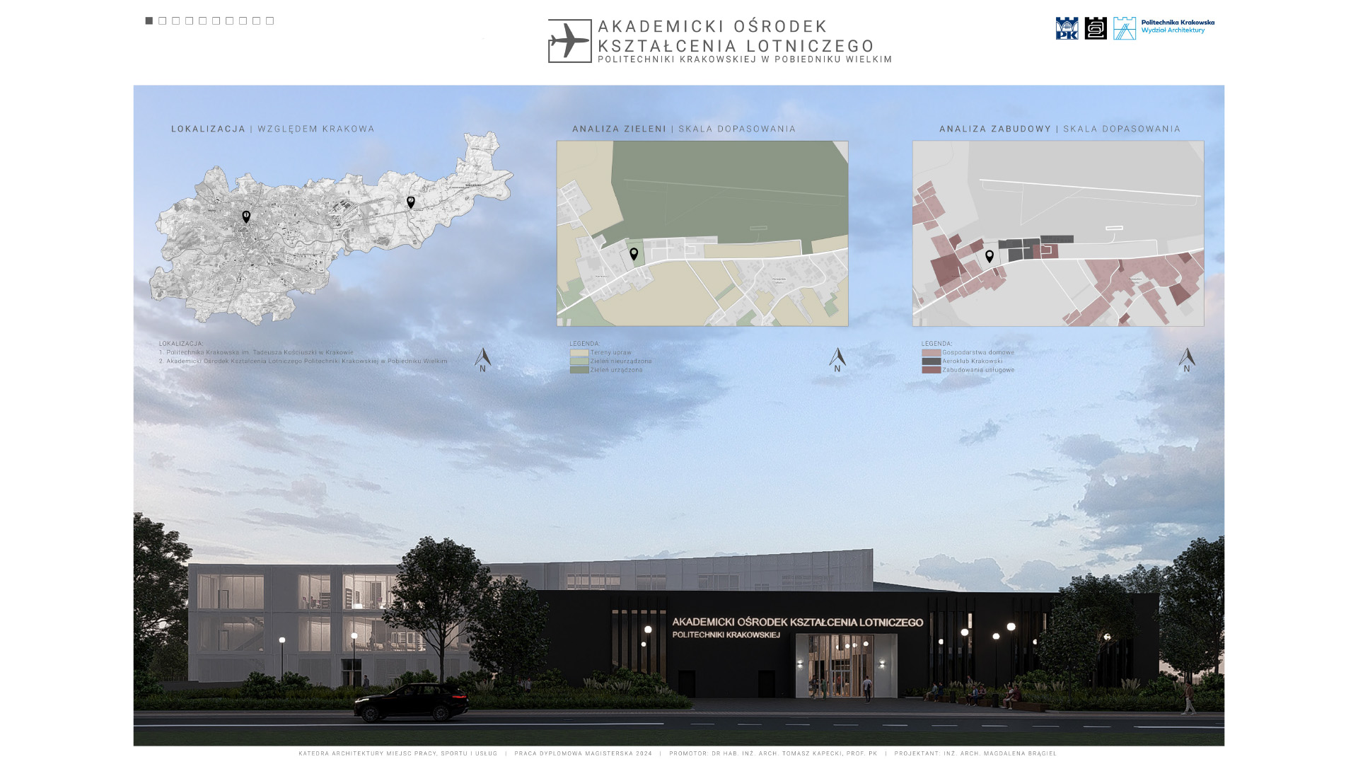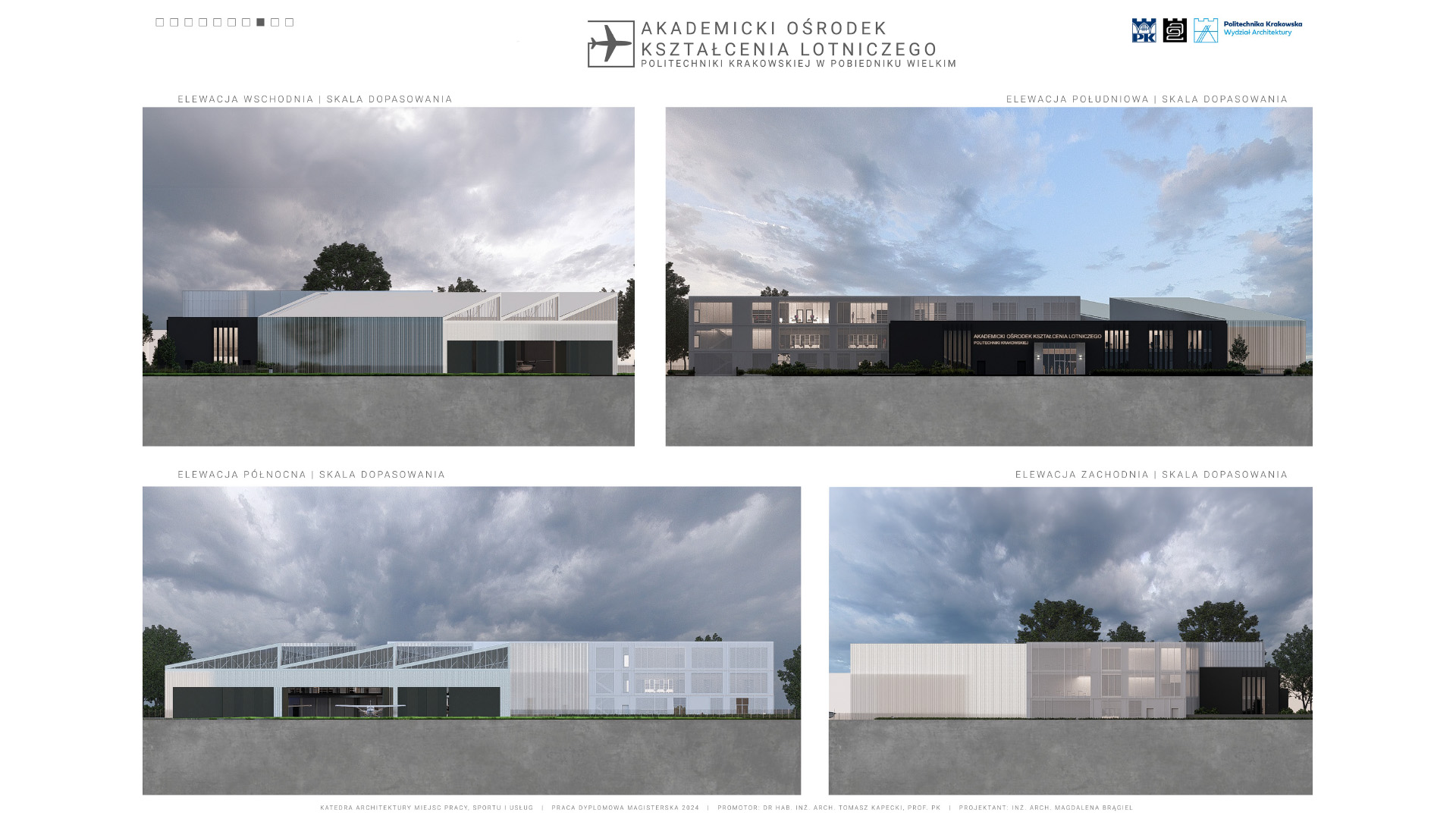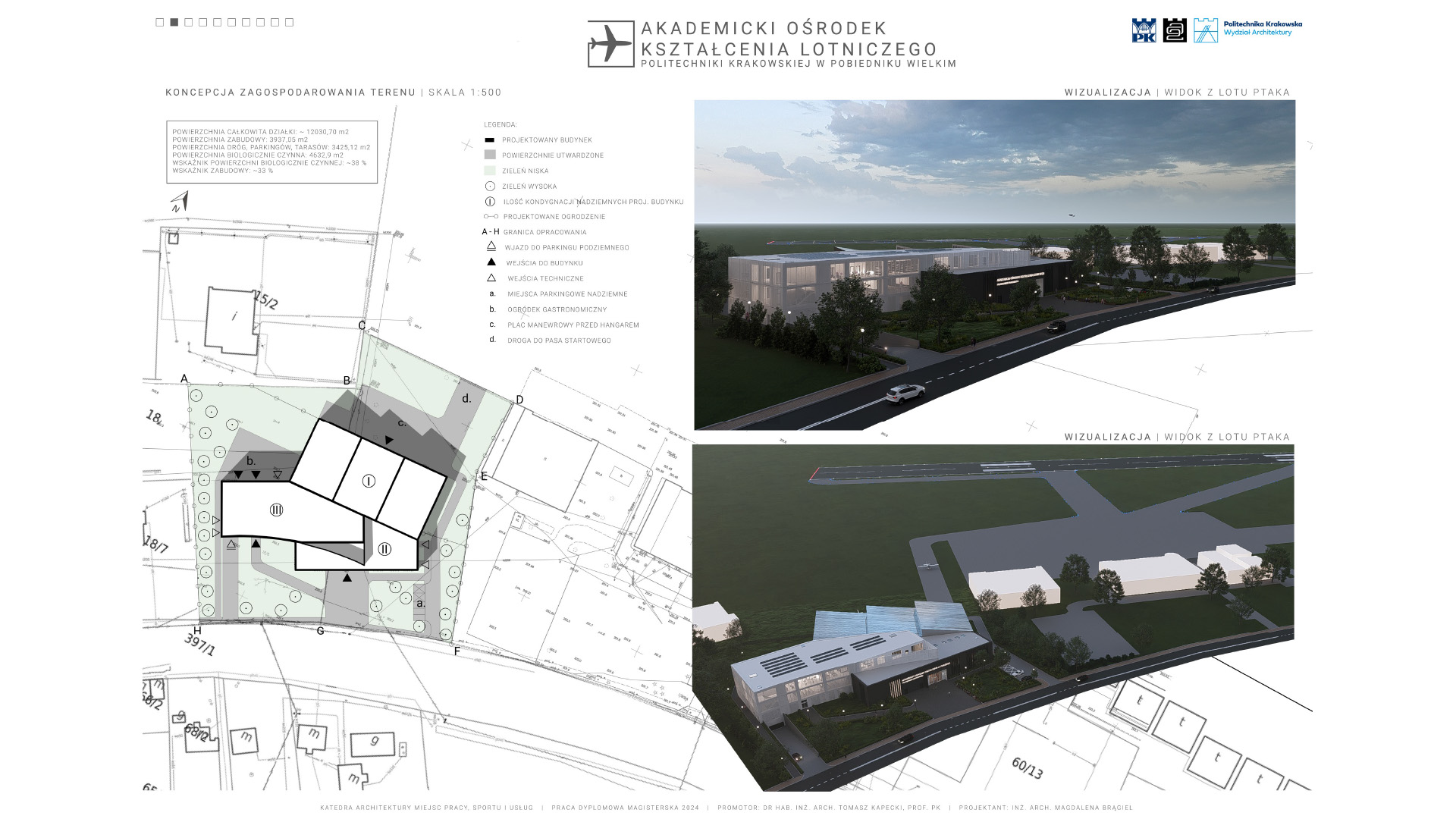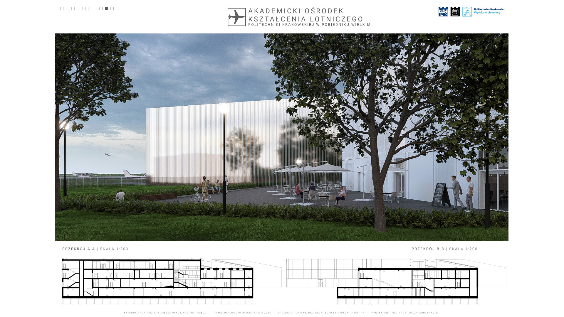 Ideą projektu jest stworzenie Akademickiego Ośrodka Kształcenia Lotniczego Politechniki Krakowskiej, który byłby odpowiedzią na mało dostępną edukacje lotniczą w województwie małopolskim. W Polsce działa 15 Politechnik z czego tylko 3 oferują kierunek związany z lotnictwem. Planowany obiekt zostałby zlokalizowany w sąsiedztwie pasa startowego w Pobiedniku Wielkim. Dzięki temu zabiegowi studenci nie będą zmuszeni podróżować między różnymi budynkami w celu odbycia zajęć. Projektowany budynek łączyłby w sobie wszystkie niezbędne funkcje takie jak strefę nauki teoretycznej, nauki praktycznej, strefę egzaminacyjną, strefę administracji oraz strefę gastronomiczną. Ośrodek posiadałby również pomieszczenia przeznaczone na najnowsze symulatory lotów. Ponad to projektuje się salę wielofunkcyjną zlokalizowaną zaraz przy głównym wejściu do budynku. Pozwalałoby to na organizację różnych wydarzeń oraz prelekcji związanych z lotnictwem. Stworzenie tego typu ośrodka byłoby doskonałą odpowiedzią na prężnie rozwijającą się branżę lotniczą w Krakowie.