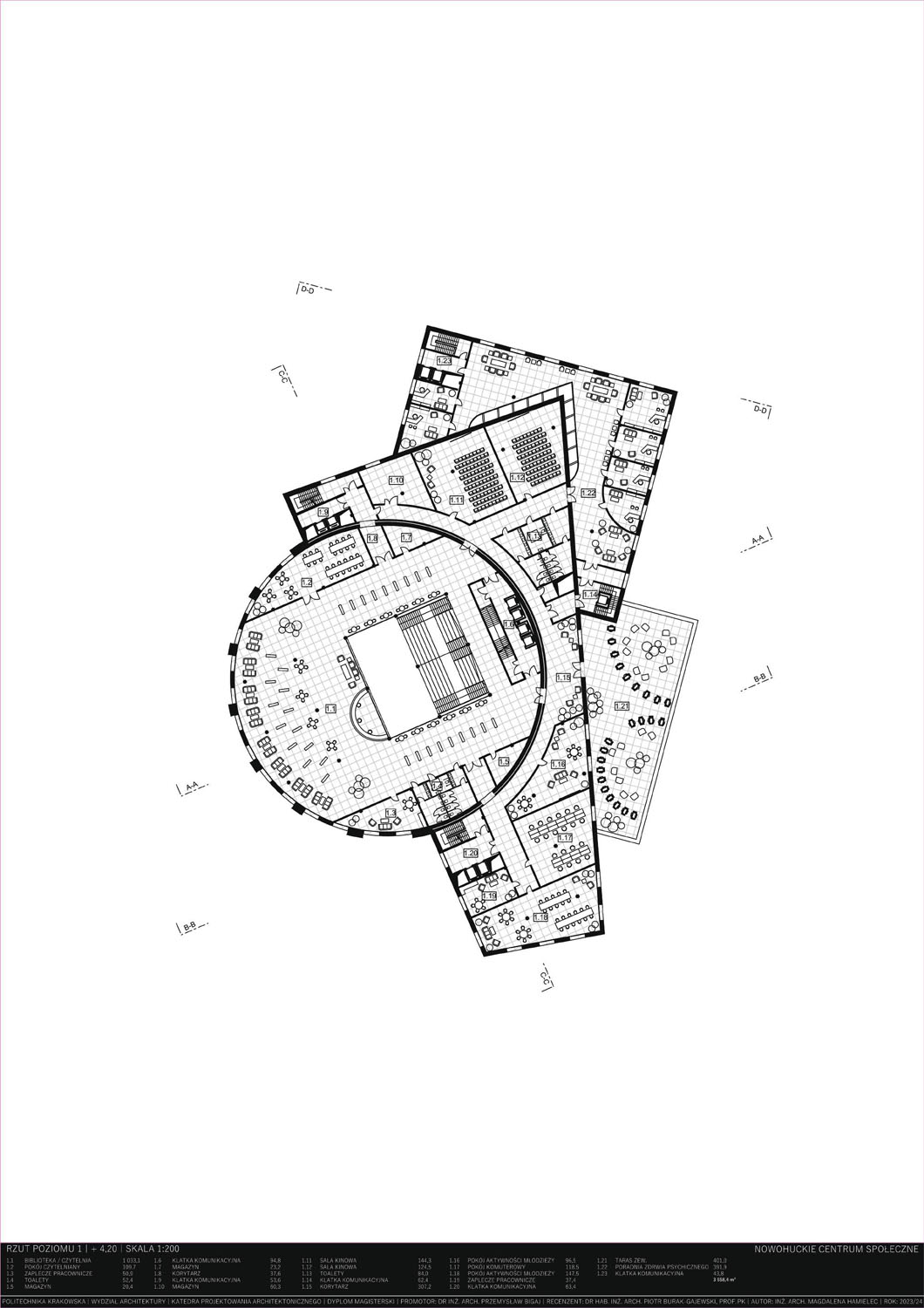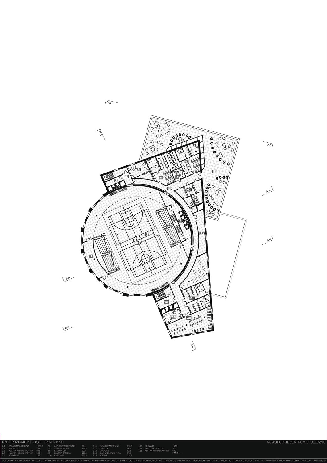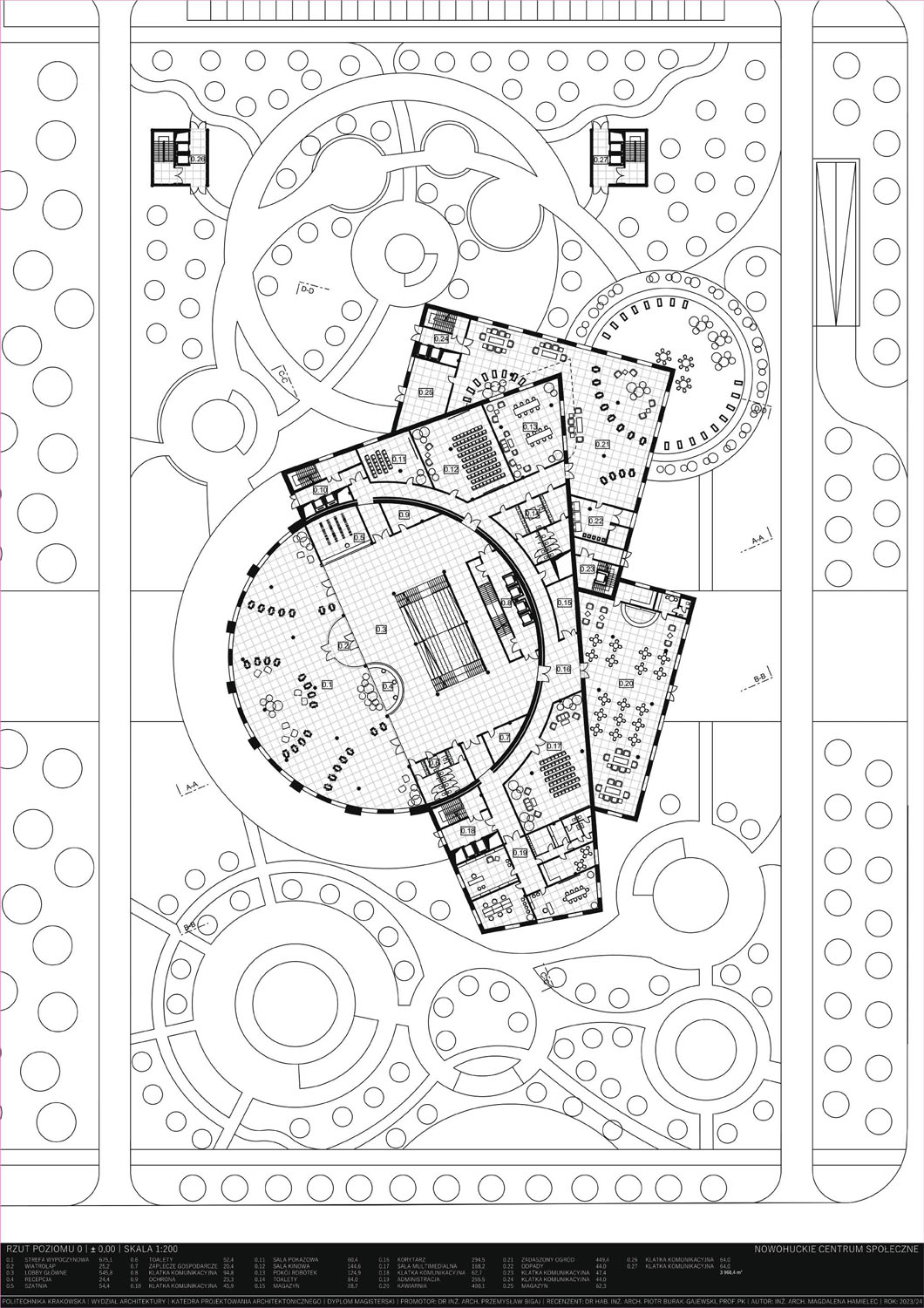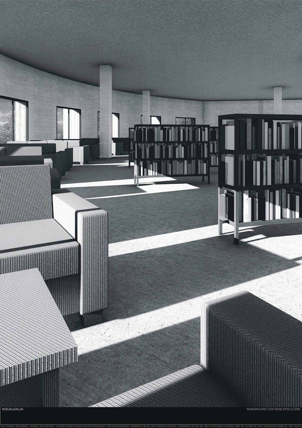 Nowohuckie Centrum Społeczne to wielofunkcyjna przestrzeń zarówno zewnętrzna, wokół budynku, jak i wewnętrzna zamknięta oraz półotwarta na otoczenie. Sam obiekt posiada zarówno strefy wspólne jak i indywidualne podzielne ze względu na kategorie wiekowe użytkowników. Najważniejsze to użytkowników. Najważniejsze z nich to: strefa muzealna, strefa seniora, strefa biblioteki / czytelni, strefa młodzieży, strefa sportu.