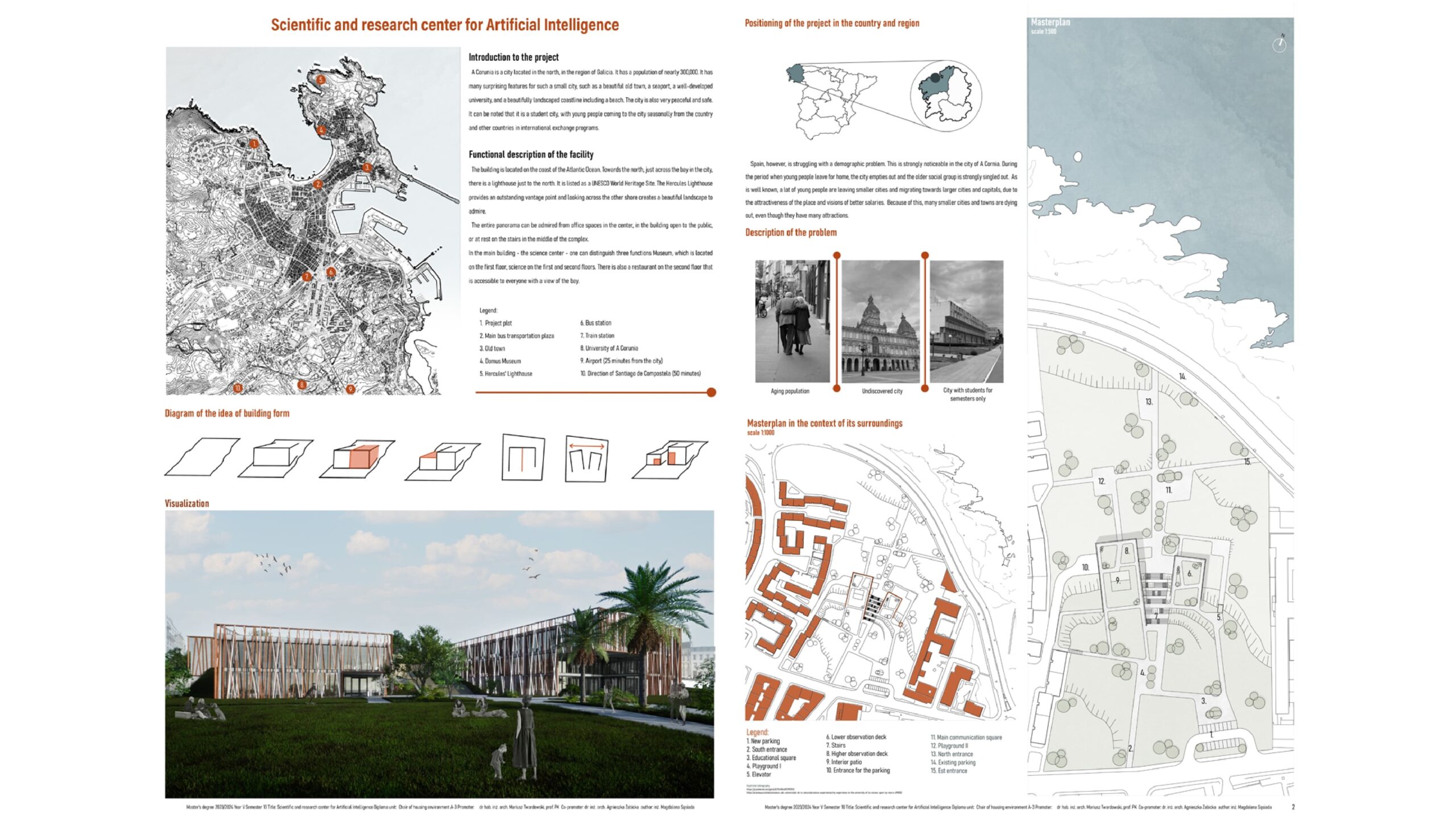Wybrany region Galicji, położony na północy Hiszpanii zainspirował mnie do przyglądnięciu się problemowi demografii w tamtym regionie oraz jak wygląda ten problem w całym państwie Hiszpanii. Zagłębiłam się oraz opisałam ten problem, z naciskiem co przyciąga ludzi do migracji pomiędzy hiszpańskimi regionami i które z nich są najatrakcyjniejsze. Wnioski wysunięte z tego rozpoznania pozwoliły nad dalszą pracą związaną z badaniem wpływu ośrodków na region. Projekt architektoniczny przedstawia dwa budynki. Jeden użyteczności publicznej, a drugi budynek biurowy z funkcją wystawową oraz restauracyjną. Działka posiada wiele walorów estetycznych ze względu, iż jest usytuowana tuż przy wybrzeżu oceanu Atlantyckiego z widokiem na zatokę miasta.