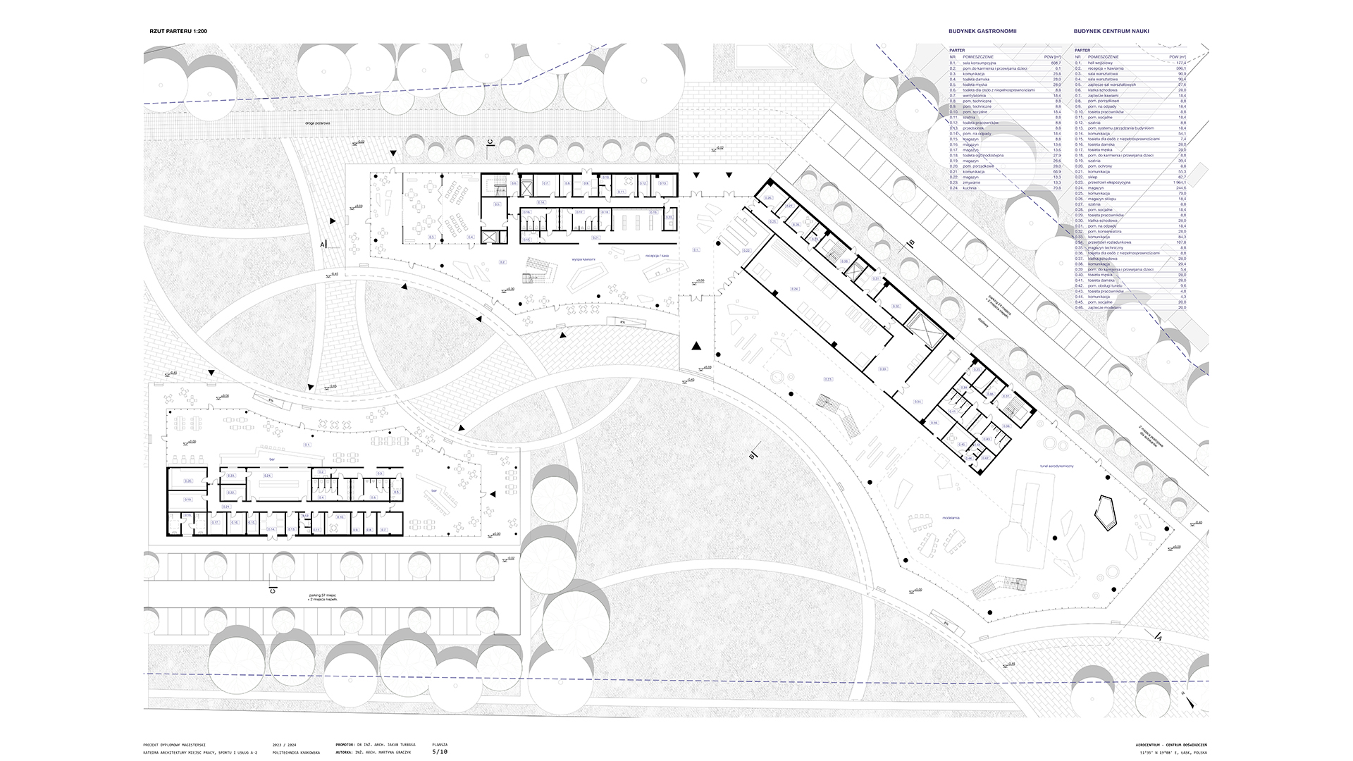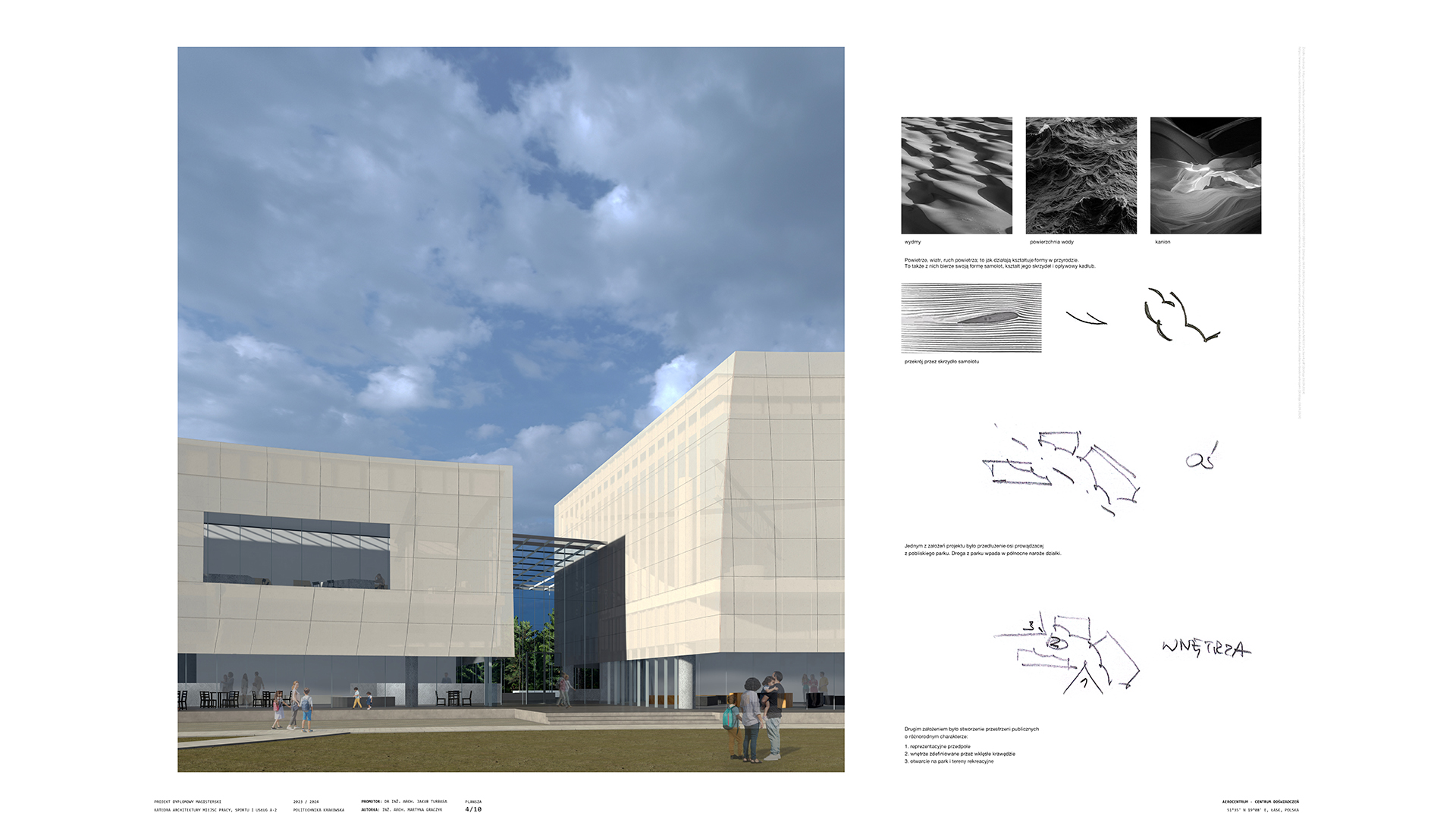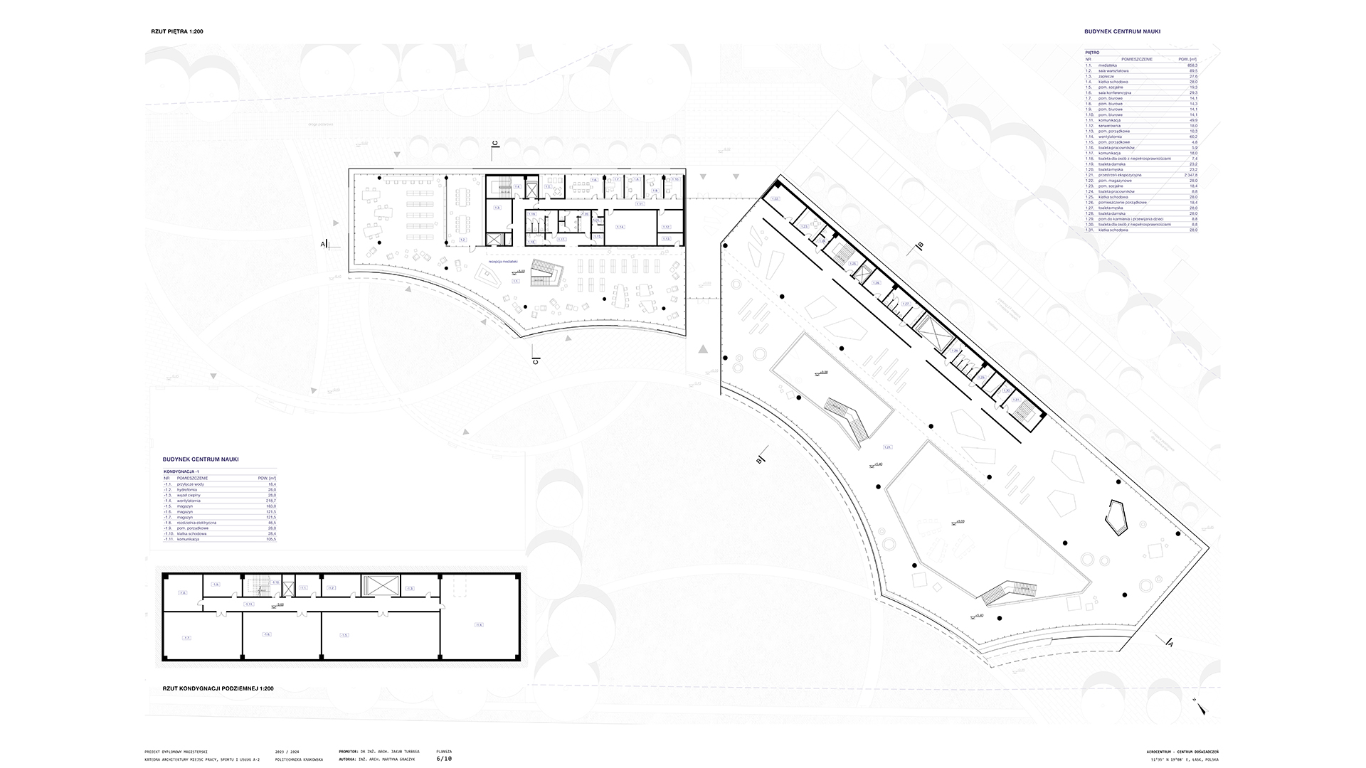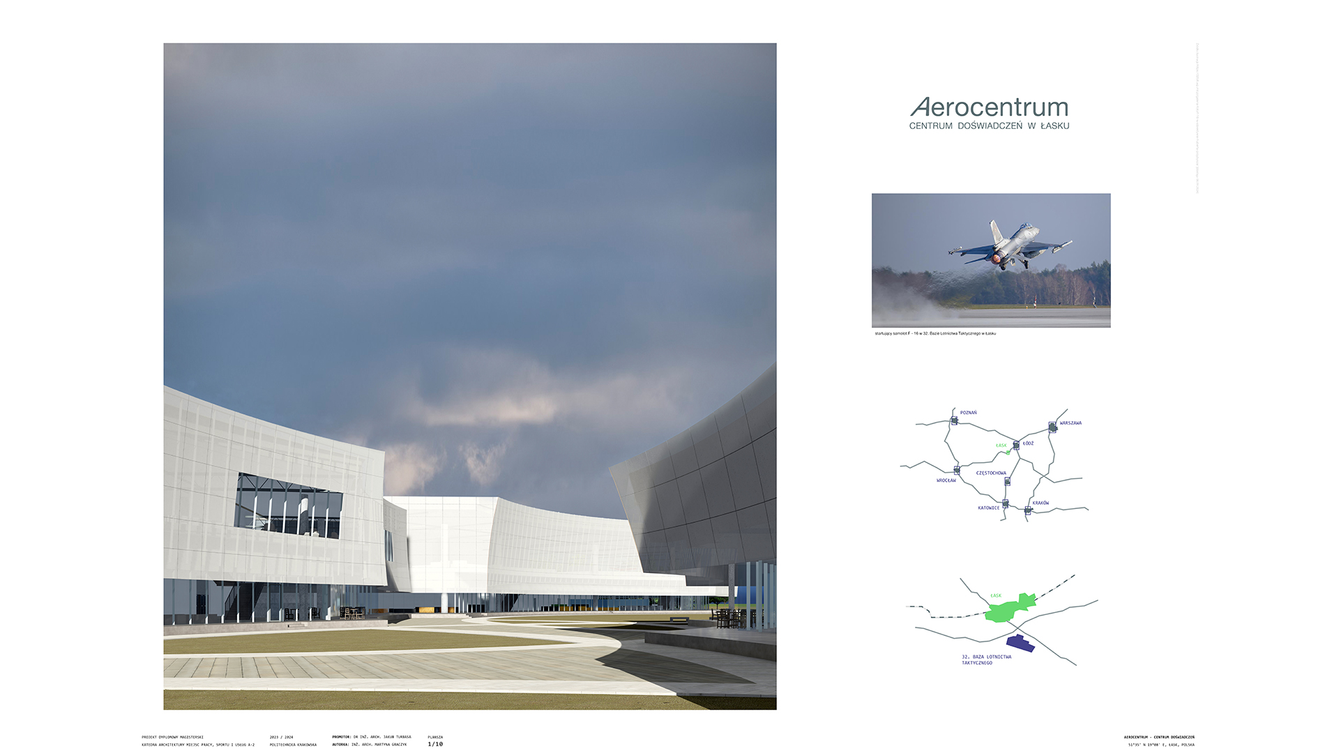 Projektowany obiekt znajduje się w Łasku, niewielkiej miejscowości pod Łodzią. Miasto wyróżnia się obecnością wojskowej bazy lotniczej – jest to jedno z dwóch miejsc w Polsce, gdzie stacjonują samoloty F – 16. Projekt zakłada stworzenie centrum nauki nawiązującego do lokalnego dziedzictwa, rozpowszechniający wiedzę o aerodynamice, ale też innych prawach nauki. W założeniu ma służyć zarówno przyjezdnym jak i pozytywnie wpływać na mieszkańców, zapewniając im miejsce spotkań i rekreacji. Założenie składa się z trzech brył: największej z częścią ekspozycyjną, przyległej do niej mediateki oraz oddzielnego budynku z lokalem gastronomicznym. W centrum kompleksu znajduje się przestrzeń rekreacyjna zdefiniowana ścianami projektowanych budynków. Jest ona przedłużeniem drogi z pobliskiego parku i łączy tereny zielone z bardziej zurbanizowaną częścią miasta. Budynki charakteryzują się ekspresyjnymi fasadami od strony wnętrza założenia (nieliteralnie nawiązującymi do ruchu powietrza i lotnictwa) oraz przeszklonymi podcieniami w parterach. Poziom parteru znajduje się lekko ponad poziomem gruntu, co nadaje przestrzeni nieco amfiteatralny charakter.