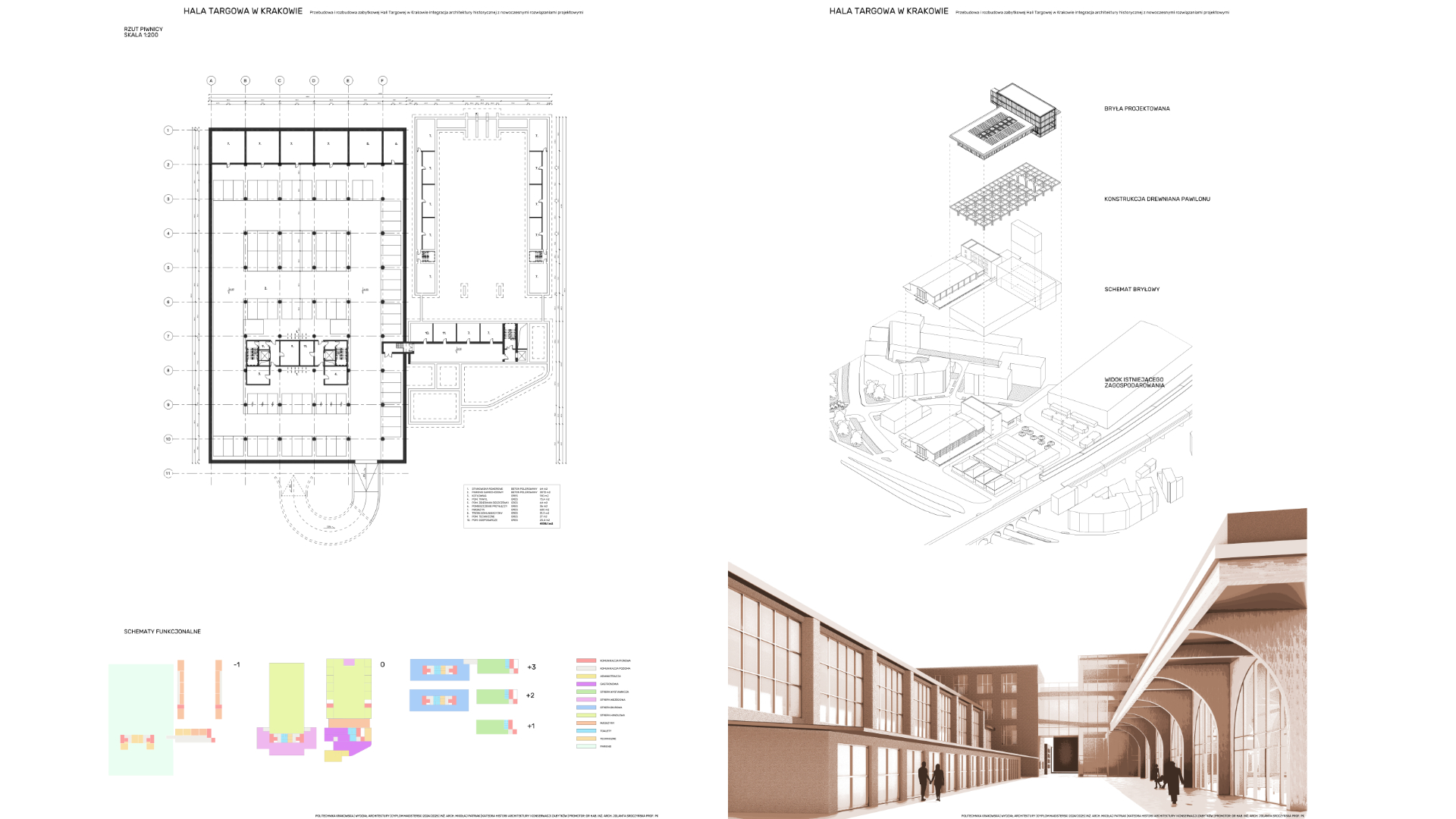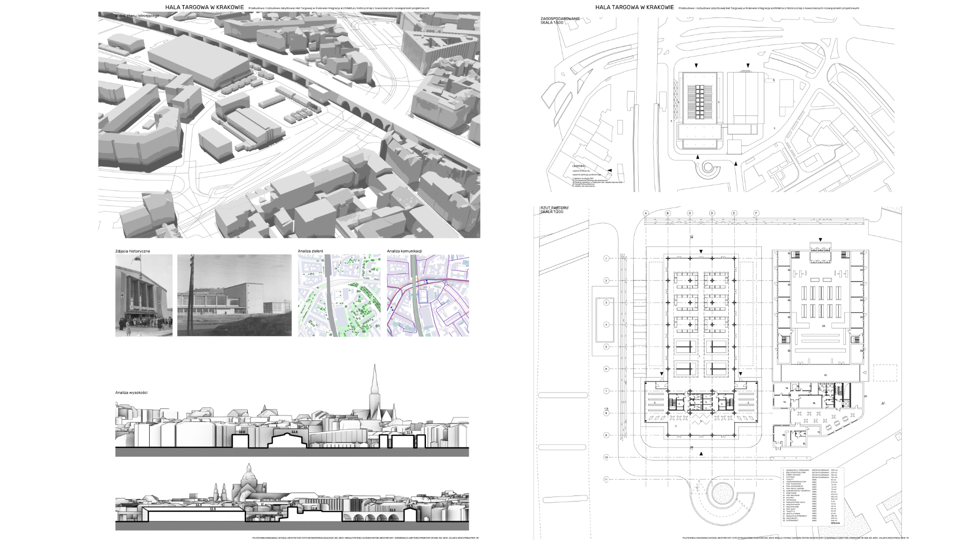 Przedmiotem opracowania jest projekt budowlany przekrycia placu targowego. Jest to hala o przemyślanym designie z nowo projektowanymi stanowiskami do sprzedaży sezonowej jak i stałej, będą dostosowane do różnorodnych potrzeb przy użyciu modułowych stanowisk handlowych, która jest połączona z częścią biurową w formie open-space, która umożliwi efektywną organizację pracy użytkownikom. Budynek posiada parterową strefą relaksu połączoną z otwartą publiczną biblioteką do darmowej wymiany książek oraz salę wystawienniczą. W części zabytkowej znajduje się restauracja. Wykorzystanie parkingu podziemnego pozostawia wolną przestrzeń nad ziemią. Lokalizacja budynku w pobliżu przystanku z wiaduktem kolejowym zapewnia doskonałą komunikację publiczną. Istniejący objazd drogi został usunięty na rzecz tymczasowej drogi dojazdowej tylko dla dostawców podczas weekendowych targów, dzięki temu ograniczona zostaje ilość pojazdów znajdująca się pomiędzy sklepami, ułatwiając przy tym korzystanie z placu pieszo.