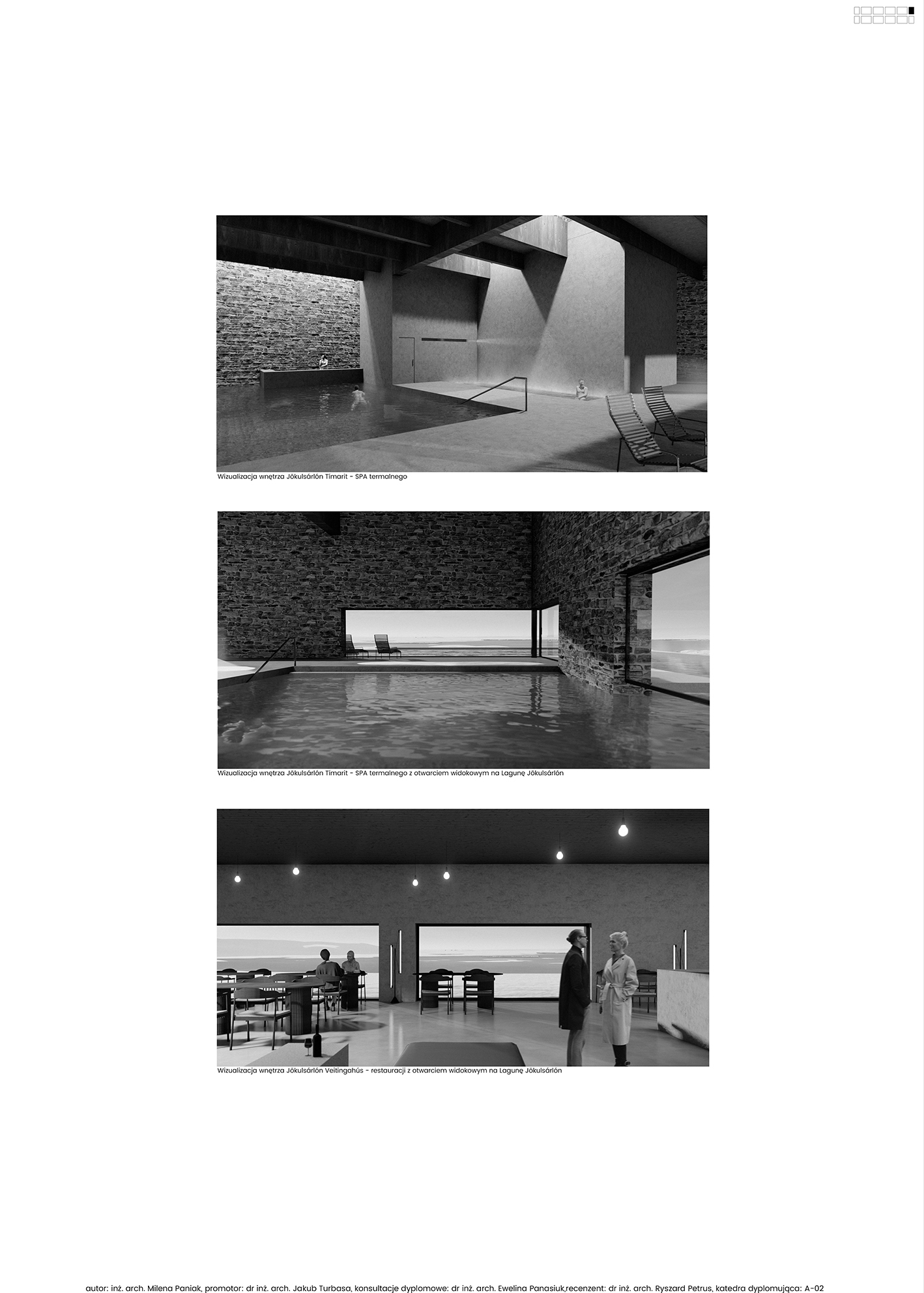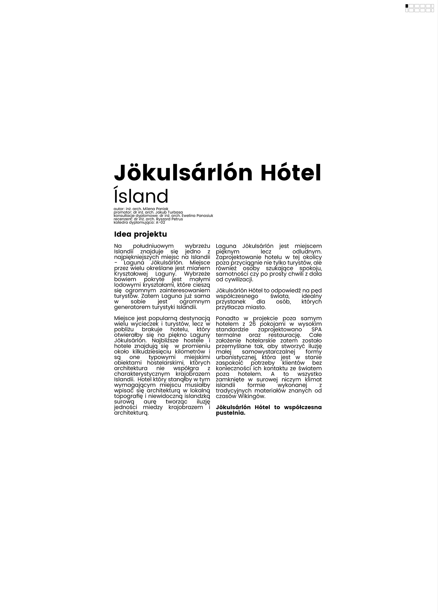 Na południowym wybrzeżu Islandii znajduje się jedno z najpiękniejszych miejsc na Islandii – Laguna Jökulsárlón. Miejsce jest popularną destynacją wielu wycieczek i turystów, lecz w pobliżu brakuje hotelu, który otwierałby się na piękno Laguny Jökulsárlón. Najbliższe hostele i hotele znajdują się w promieniu około kilkudziesięciu kilometrów i są one typowymi miejskimi obiektami hostelarskimi, których architektura nie współgra z charakterystycznym krajobrazem Islandii. Hotel który stanąłby w tym wymagającym miejscu musiałby wpisać się architekturą w lokalną topografię i niewidoczną islandzką surową aurę tworząc iluzję jedności miedzy krajobrazem i architekturą. Zaprojektowanie hotelu w tej okolicy przyciągnie nie tylko turystów, ale również osoby szukające spokoju, samotności czy po prosty chwili z dala od cywilizacji. Jökulsárlón Hótel to odpowiedź na pęd współczesnego świata, idealny przystanek dla osób, których przytłacza miasto. Jökulsárlón Hótel to współczesna pustelnia.