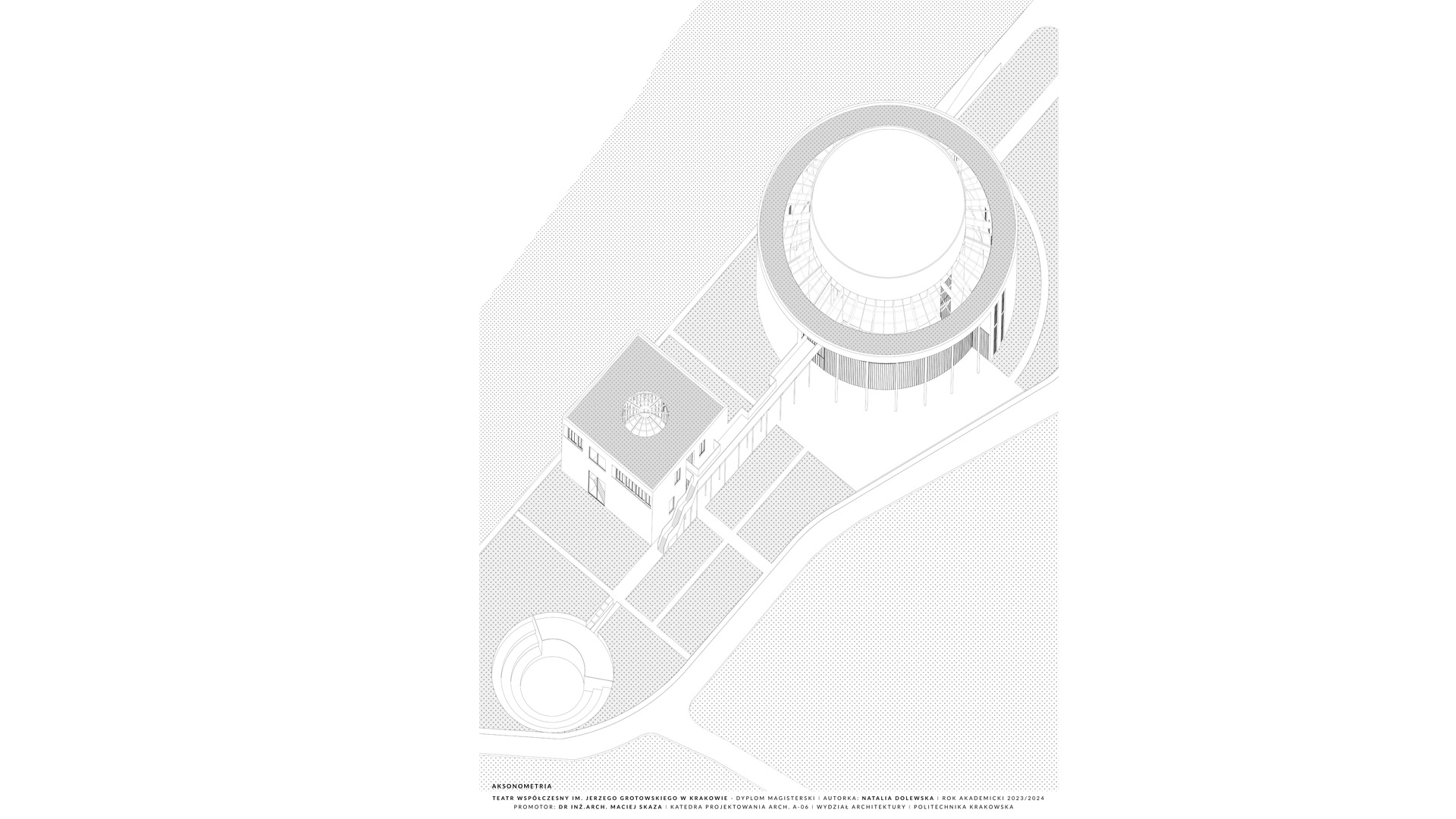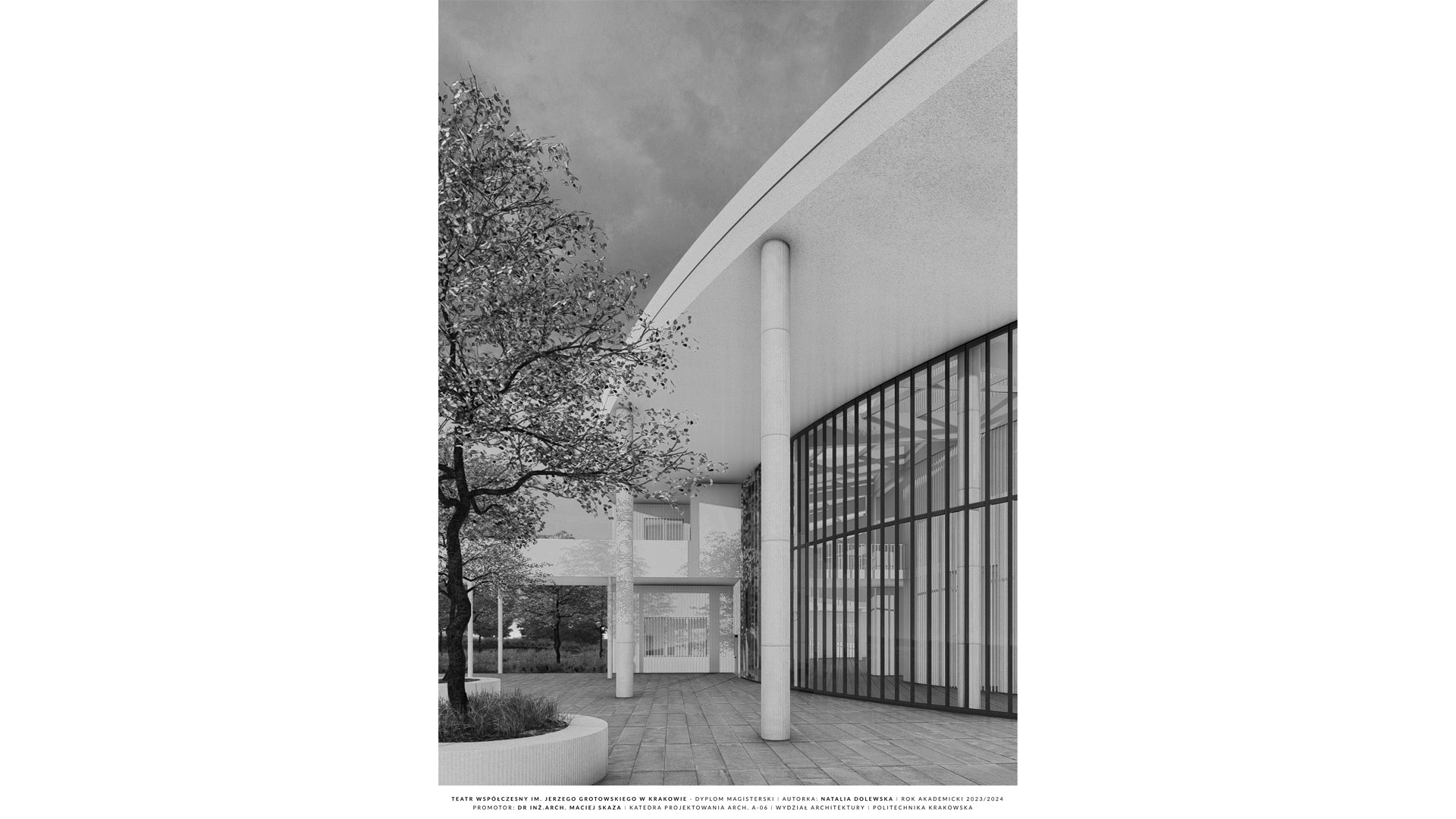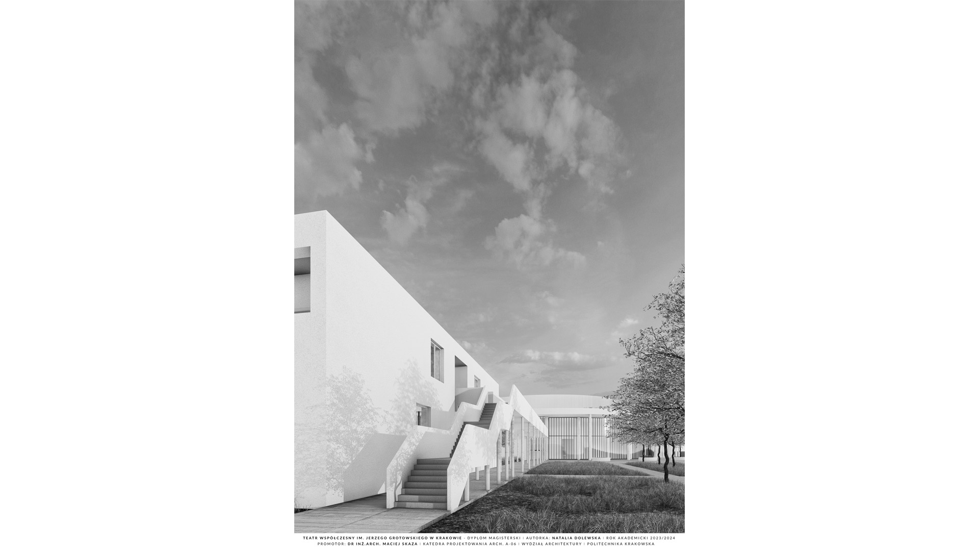 Tematem pracy magisterskiej jest projekt Teatru Współczesnego w Krakowie inspirowanego twórczością wybitnego polskiego twórcy teatralnego – Jerzego Grotowskiego. Budynek jako nowa przestrzeń kulturalno-rozrywkowa ma za zadanie zapełnić lukę funkcjonalną istniejącą w tej części Krakowa. Budynek teatru posiadać będzie zaawansowaną technicznie scenę, zapewniającą mnogą liczbę sposobów kreowania układu widowni i scenografii. Pozwoli to przybywającym do Teatru Współczesnego artystom na dowolne aranżowanie przestrzeni sceny i kreowanie doznań artystycznych, jakich nie mogli urzeczywistnić na standardowych scenach teatralnych w innych obiektach. Towarzyszący teatrowi budynek hotelu zlokalizowany obok na działce, jest dedykowany artystom, którzy mają pracować w Teatrze Współczesnym. Budynek hotelowy będzie pełnił funkcję nie tylko mieszkalną, znajdzie się tam także scena pomocnicza, pomyślana również jako sala prób, aby oprócz poczucia komfortu zapewnić twórcom jak najlepsze warunki pracy.