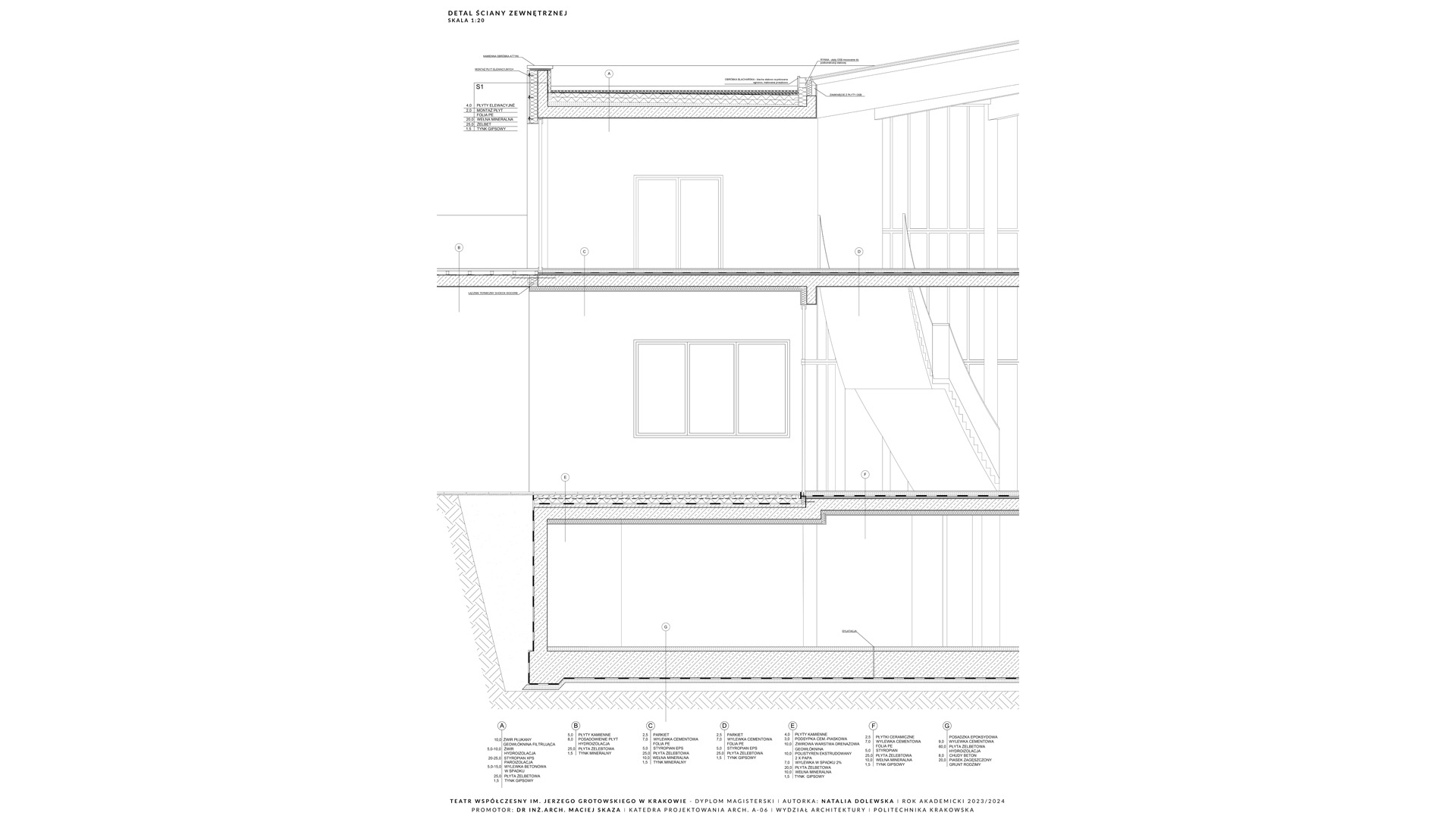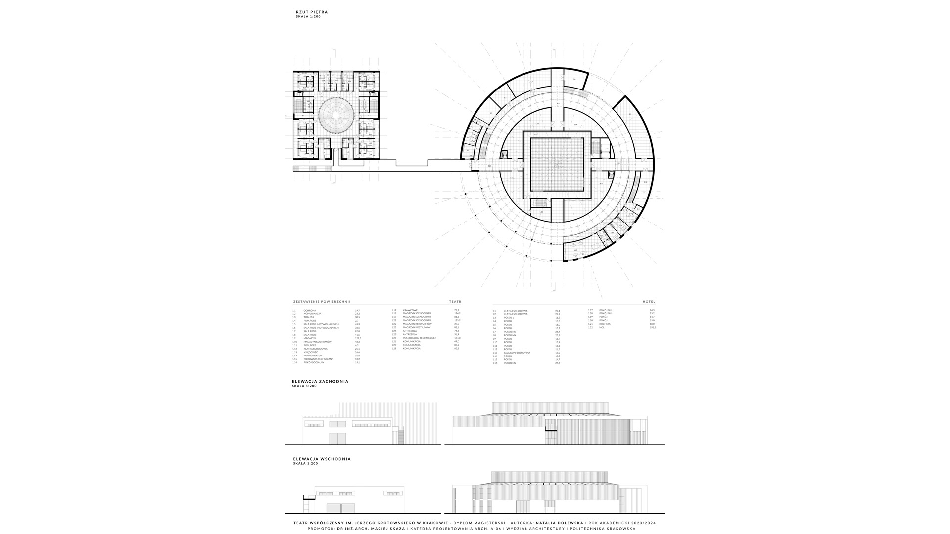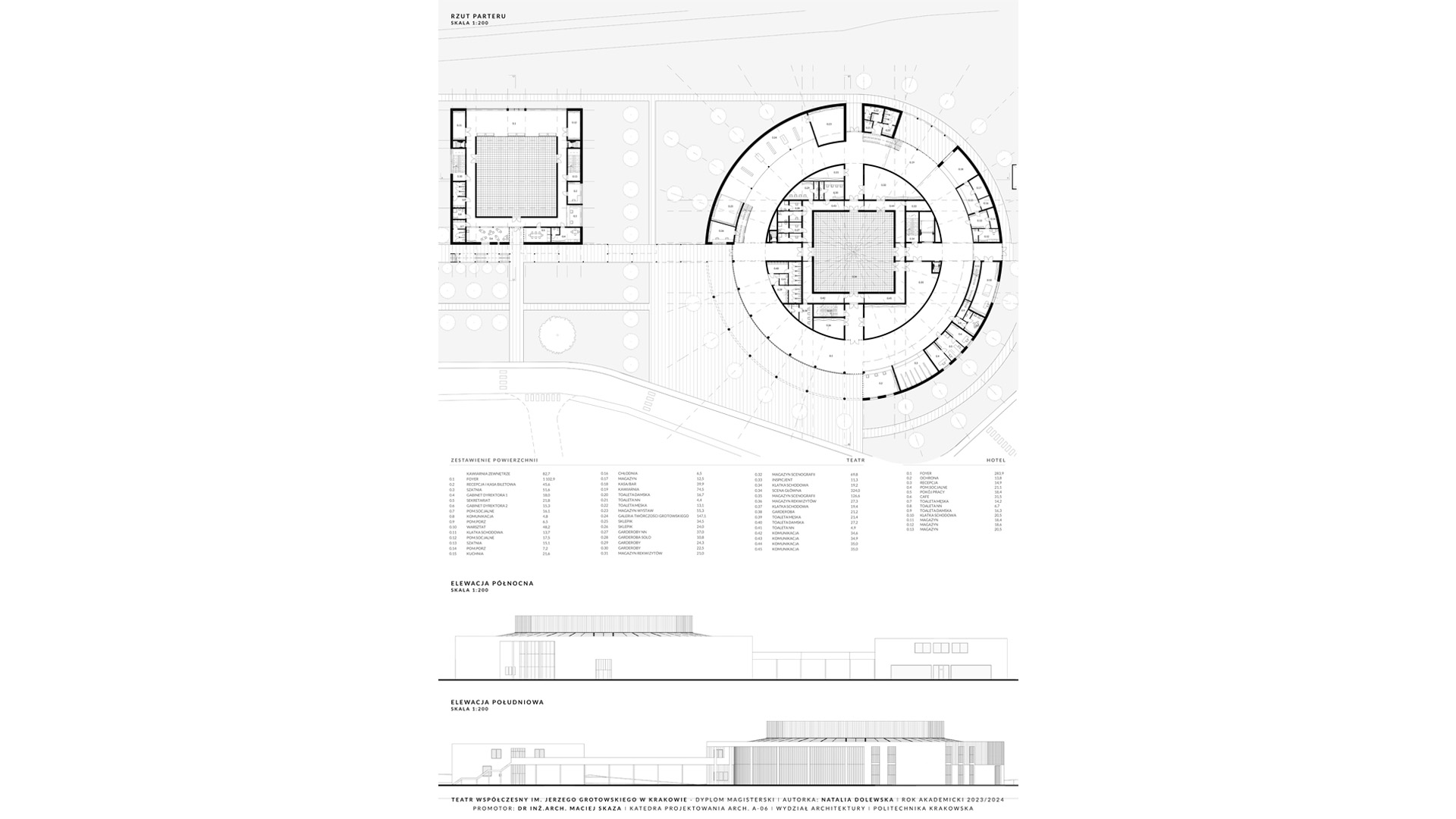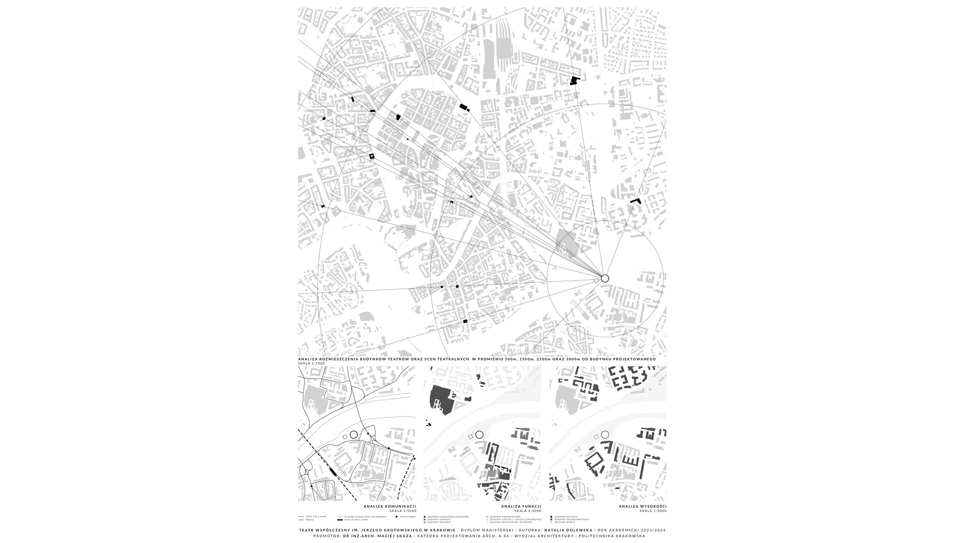 Tematem pracy magisterskiej jest projekt Teatru Współczesnego w Krakowie inspirowanego twórczością wybitnego polskiego twórcy teatralnego – Jerzego Grotowskiego. Budynek jako nowa przestrzeń kulturalno-rozrywkowa ma za zadanie zapełnić lukę funkcjonalną istniejącą w tej części Krakowa. Budynek teatru posiadać będzie zaawansowaną technicznie scenę, zapewniającą mnogą liczbę sposobów kreowania układu widowni i scenografii. Pozwoli to przybywającym do Teatru Współczesnego artystom na dowolne aranżowanie przestrzeni sceny i kreowanie doznań artystycznych, jakich nie mogli urzeczywistnić na standardowych scenach teatralnych w innych obiektach. Towarzyszący teatrowi budynek hotelu zlokalizowany obok na działce, jest dedykowany artystom, którzy mają pracować w Teatrze Współczesnym. Budynek hotelowy będzie pełnił funkcję nie tylko mieszkalną, znajdzie się tam także scena pomocnicza, pomyślana również jako sala prób, aby oprócz poczucia komfortu zapewnić twórcom jak najlepsze warunki pracy.