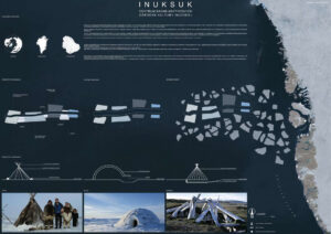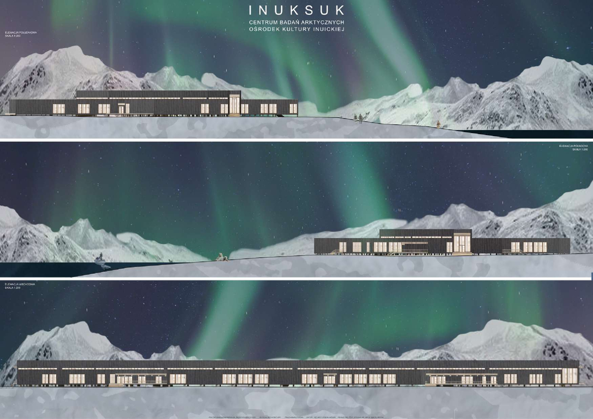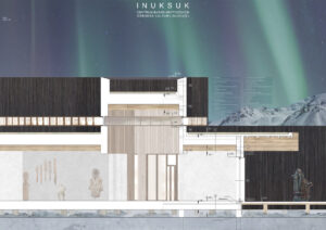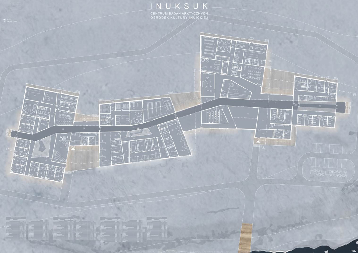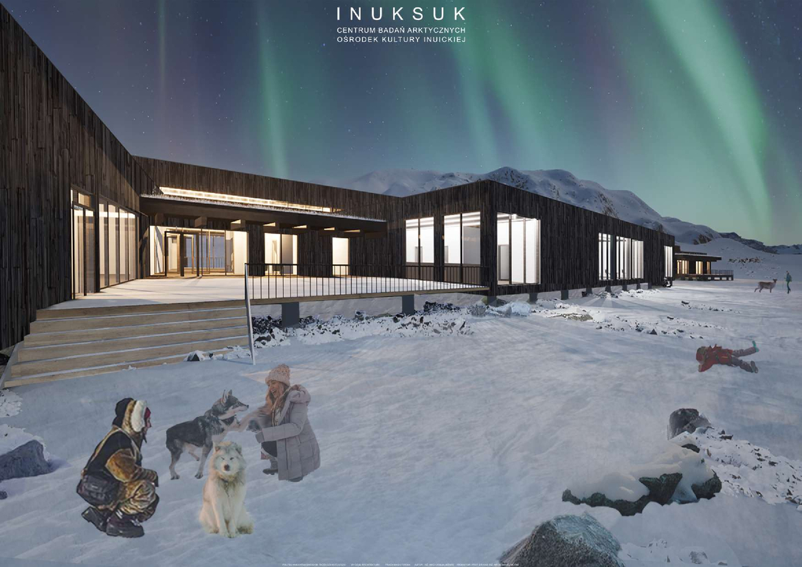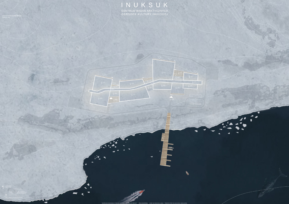 Inuksuk – w dosłownym znaczeniu oznacza „pełnić obowiązki człowieka. Jest to rodzaj znaku/ rzeźby tworzonej przez plemienia północne, które służyły jako drogowskazy, punkty orientacyjne, wskazanie wygodnego miejsca do obozowania czy terenu łowieckiego. Najbardziej popularnym znaczeniem słowa jest jednak „tu byłem” ,czyli że jest tu bezpiecznie. Inuici to rdzenni mieszkańcy obszarów arktycznych i subarktycznych– Grenlandii, kanady, alaski i Syberii. Potocznie zwani Eskimosami co dosłownie tłumaczy się na „jedzący surowe mięso” co w dzisiejszych czasach uznaje się za określenie obraźliwe. Tak mała społeczność nosi w sobie niezwykle długą i bolesną historię. Niestety na przestrzeniach lat to wszystko nie było pielęgnowane w odpowiedni sposób, a społeczność i jej ziemie były cały czas przywłaszczane przez różne narody, do tej pory w niektórych miejscach kolonizatorzy dalej nie mają do niej należytego szacunku, co doprowadziło tamtejszą ludność do wielu problemów społecznych, ekonomicznych i psychicznych. Największa z nich trauma pokoleniowa ma swoje źródło w zaniedbaniu i braku uznania wśród reszty świata. Można je jednak leczyć poprzez rozpowszechnianie ich kultury. Ciężko powiedzieć aby inspirować się regionalną architekturą inuicką, jako że taka już nie istnieje. Mieszkańcy mieszkają w kolorowych domkach po kolonizacjach. Igla i wcześniejsze schronienia zapędzały ludzi pod ziemię alby chronić przed wiatrem i zimnem. dlatego też głównymi inspiracjami do projektowanego budynku była sama natura. Malownicze krajobrazy otaczające całą wyspę tworzą niesamowitą harmonię i jednocześnie trudne warunki klimatyczne formują niesamowity i interesujący kontrast. Bryła nowo projektowanego budynku inspirowana jest oderwanymi bryłami lodowymi dryfującymi po zatoce disko. Każda funkcja jest oddzielnie pokazana posiadająca różne wysokości i najróżniejsze kształty czy gabaryty poruszając się korytarzami niczym kajak na wodzie wśród lodowych brył. Wybrana działka znajduje się na wyspie Disko od jej południowo – wschodniego wybrzeża. Po drugiej stronie zatoki idealnie rozpościera się widok na fiord lodowcowy Kagia, co sprawia iż jest to idealna lokalizacja do badań i obserwacji.
