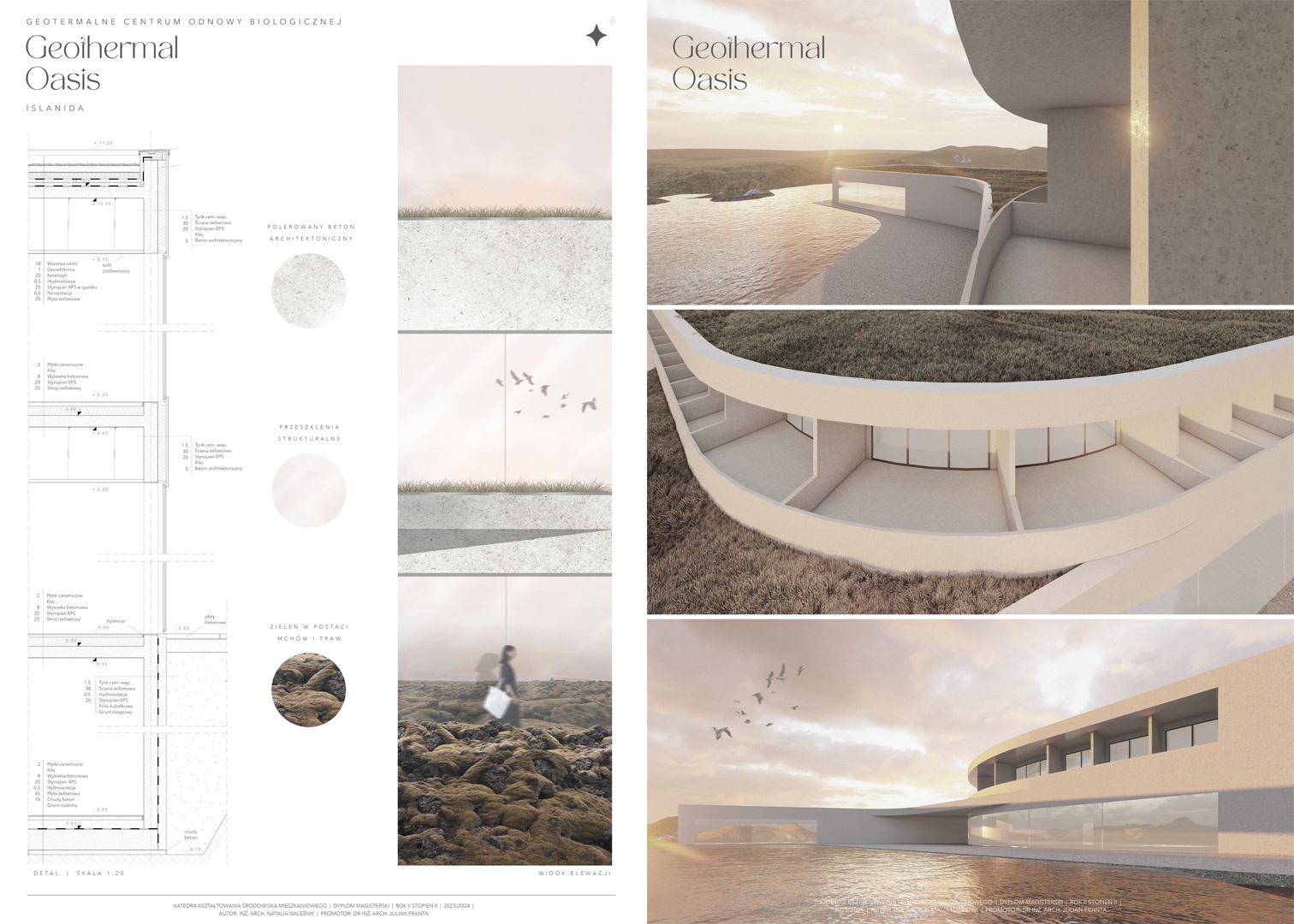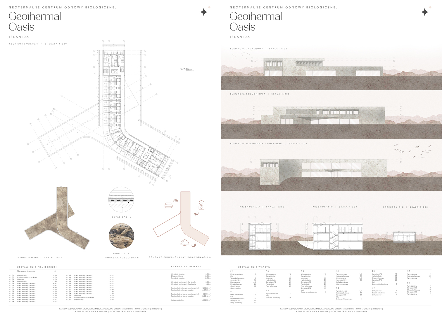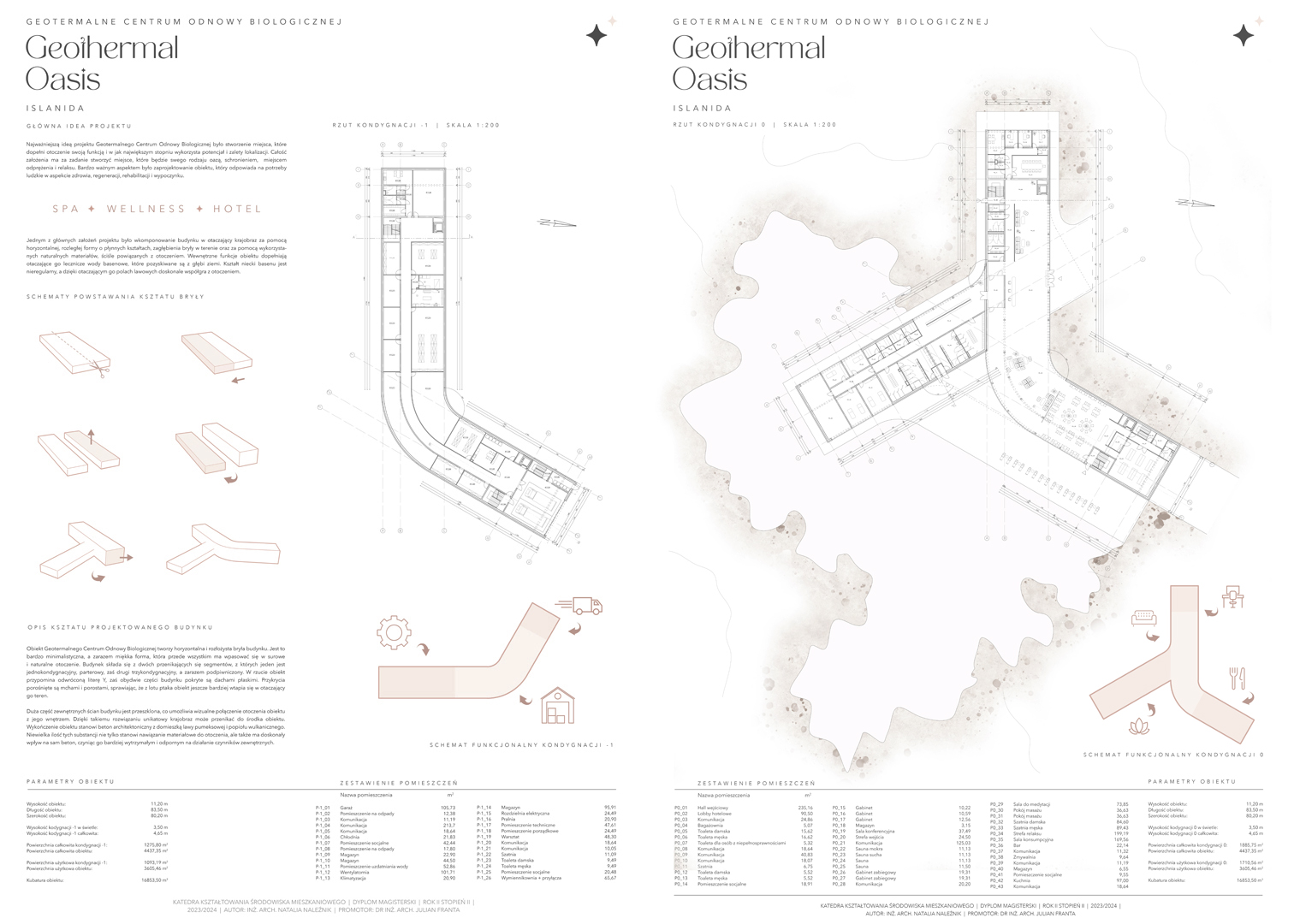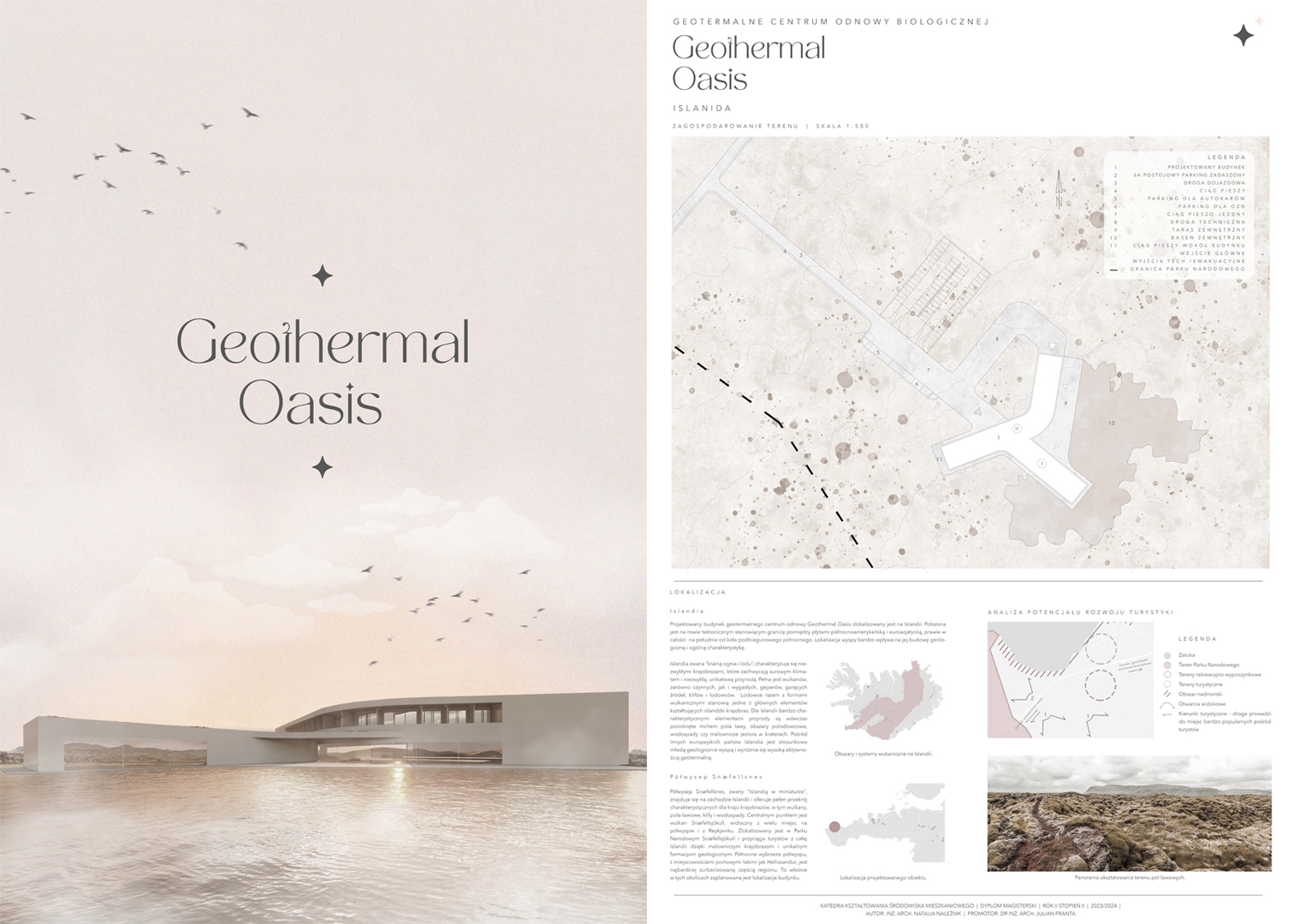 Najważniejszą ideą projektu budynku Geothermal Oasis było stworzenie miejsca, które dopełni otoczenie swoją funkcją i w jak największym stopniu wykorzysta potencjał i zalety lokalizacji. Całość założenia ma za zadanie stworzyć miejsce, które będzie swego rodzaju oazą, schronieniem, miejscem odprężenia i relaksu. Bardzo ważnym aspektem było zaprojektowanie obiektu, który odpowiada na potrzeby ludzkie w aspekcie zdrowia, regeneracji, rehabilitacji i wypoczynku. Jednym z głównych założeń projektu było wkomponowanie budynku w otaczający krajobraz za pomocą horyzontalnej, rozległej formy o płynnych kształtach, zagłębienia bryły w terenie oraz za pomocą wykorzystanych naturalnych materiałów, ściśle powiązanych z otoczeniem. Wewnętrzne funkcje obiektu dopełniają otaczające go lecznicze wody basenowe, które pozyskiwane są z głębi ziemi. Kształt niecki basenu jest nieregularny, a dzięki otaczającym go polach lawowych doskonale współgra z otoczeniem.