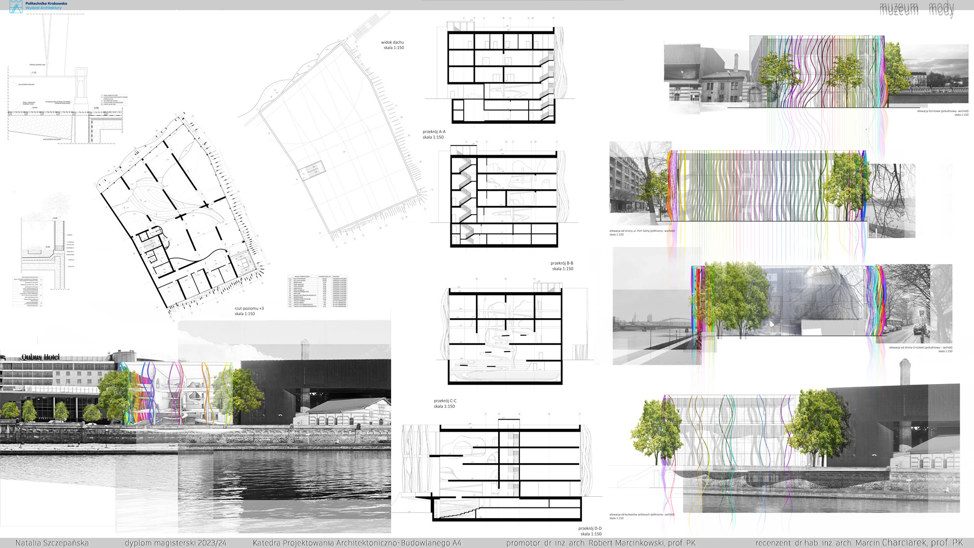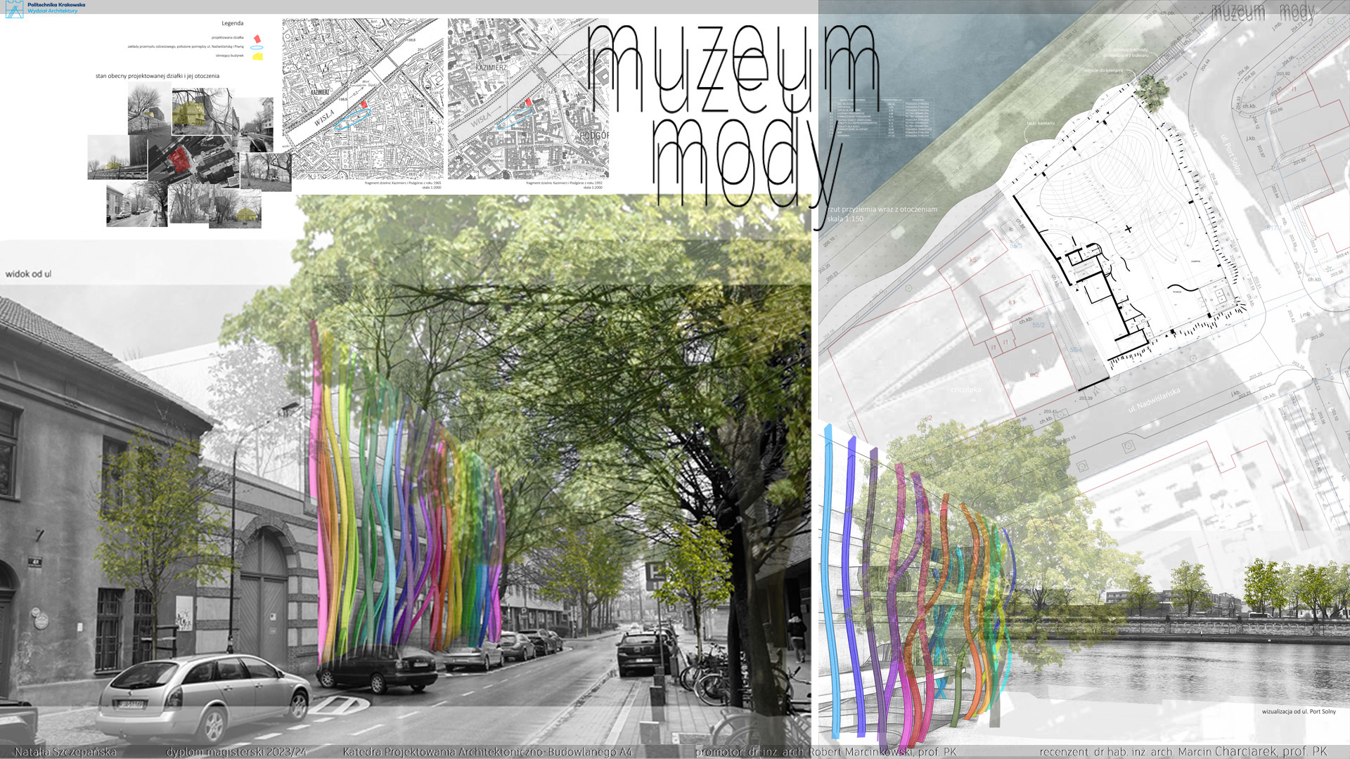 Tematem pracy dyplomowej jest koncepcyjny projekt architektoniczny Muzeum Mody na krakowskim Podgórzu. Obok projektowanej działki znajdowały się zakłady odzieżowe, skąd pomysł, żeby nowy budynek powiązać z historią miejsca. Sama forma nawiązuje z jednej strony do lekko opadającej po konstrukcji budynku tkaniny, z drugiej związana jest silnie z malowniczym położeniem działki nad wiślanym bulwarem. Widok na Kazimierz i krakowskie Stare Miasto jest integralną częścią wystroju wnętrz. Kolejnym ważnym elementem jest konstrukcja. Kondygnacje nadziemne zostały oparte na tarczach, dzielących wnętrza