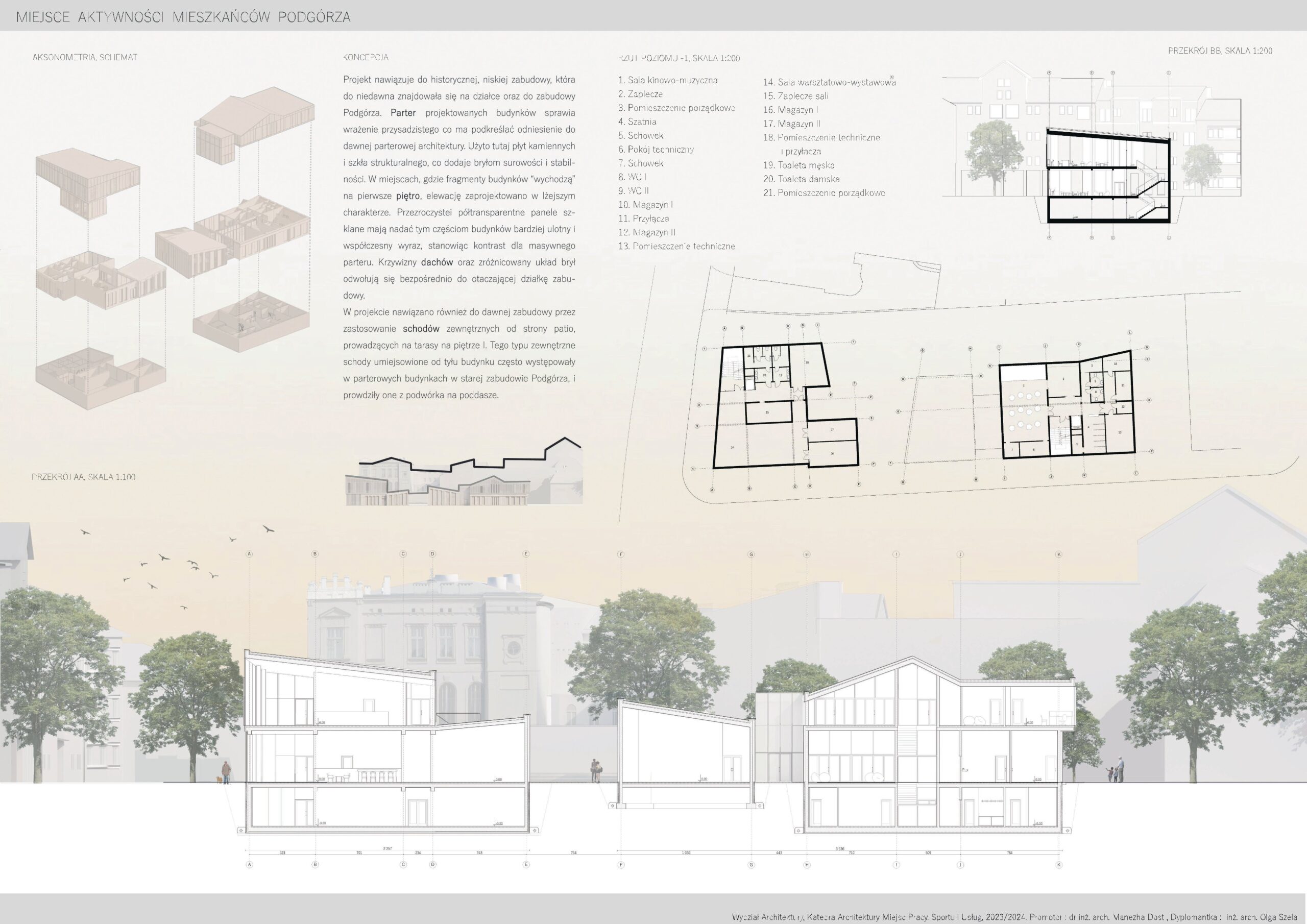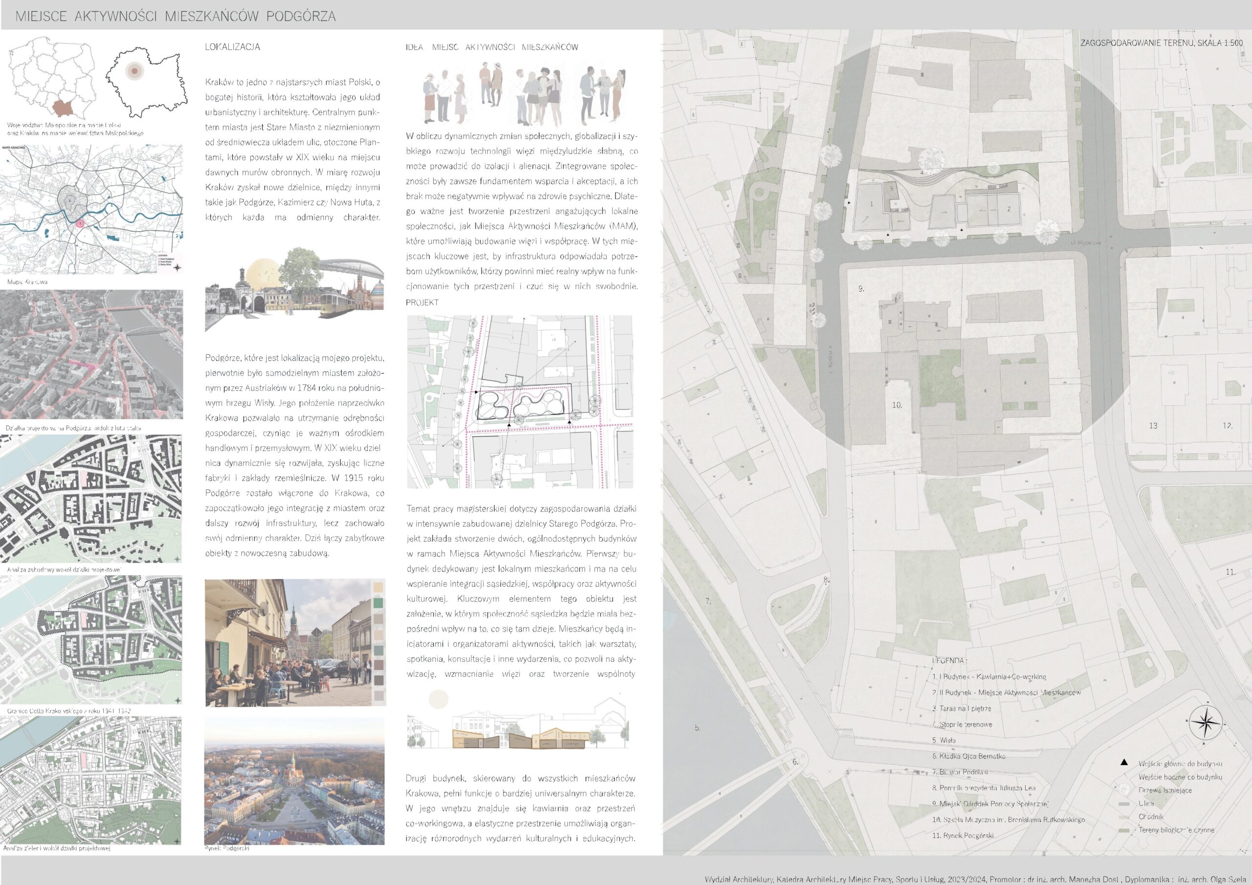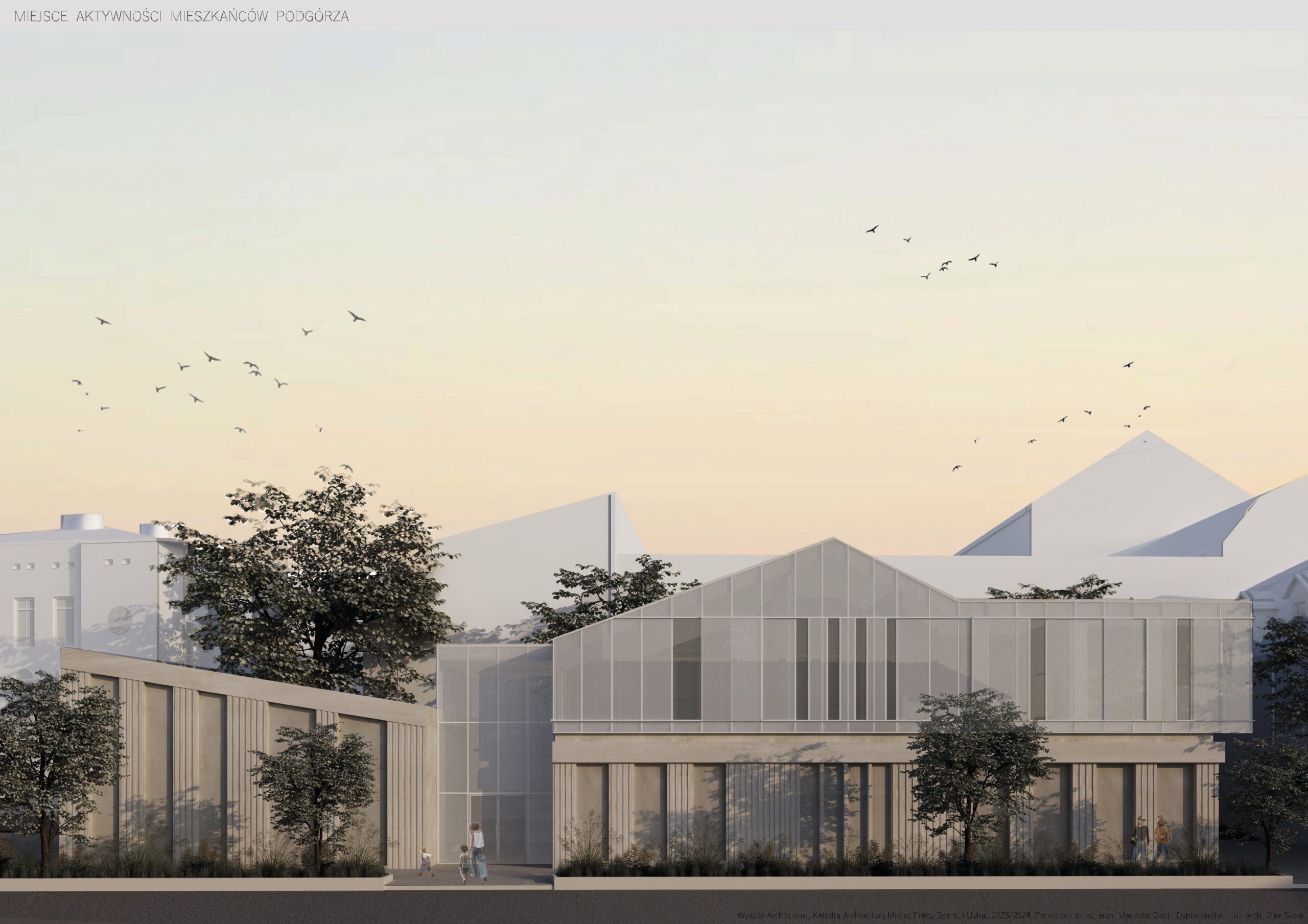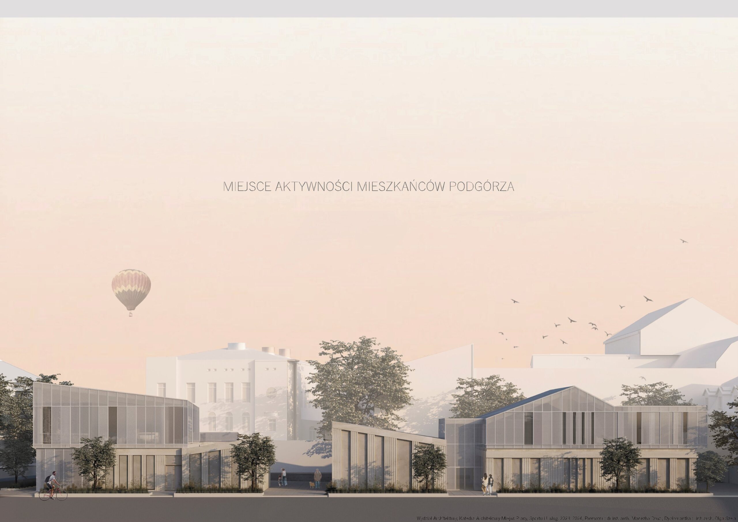 Współczesne miasta wymagają przestrzeni, które nie tylko odpowiadają na potrzeby mieszkańców, ale także sprzyjają ich integracji oraz aktywizacji. Projektowane Miejsce Aktywności Mieszkańców na Podgórzu w Krakowie, ma odpowiadać na te potrzeby, tworząc inspirującą przestrzeń, która wspiera rozwój więzi społecznych i kulturalnych. Głównym założeniem projektu jest stworzenie miejsca, które będzie dostępne przede wszystkim dla lokalnych mieszkańców, oferując elastyczne i funkcjonalne przestrzenie, przystosowane do organizacji różnorodnych wydarzeń. Budynek dedykowany społeczności Starego Podgórza ma na celu zacieśnianie relacji między mieszkańcami poprzez organizację warsztatów, spotkań i wydarzeń, które sprzyjają współpracy i wzajemnej integracji. Drugi obiekt, otwarty na szersze grono odbiorców, oferuje przestrzeń coworkingową oraz kawiarnię, która stwarza dogodne warunki do pracy i nauki. To miejsce ma sprzyjać kreatywności i skupieniu, jednocześnie będąc otwartym na organizację różnorodnych wydarzeń kulturalnych. Architektura projektu nawiązuje do lokalnej tożsamości i specyfiki Podgórza, czerpiąc z idei krytycznego regionalizmu.