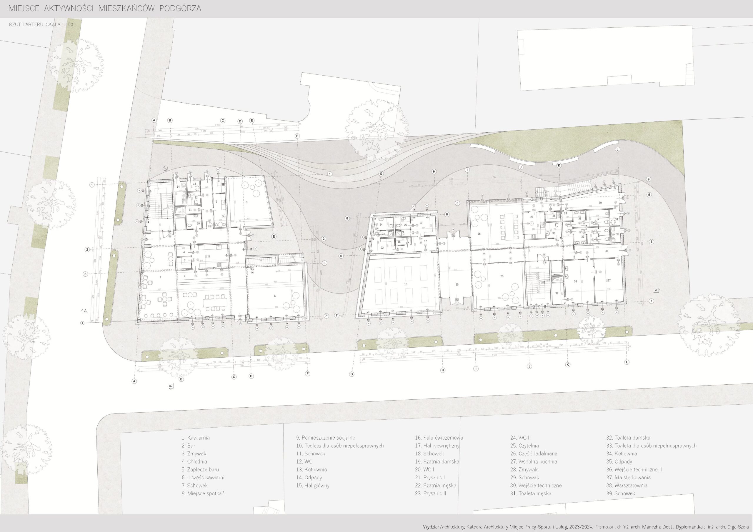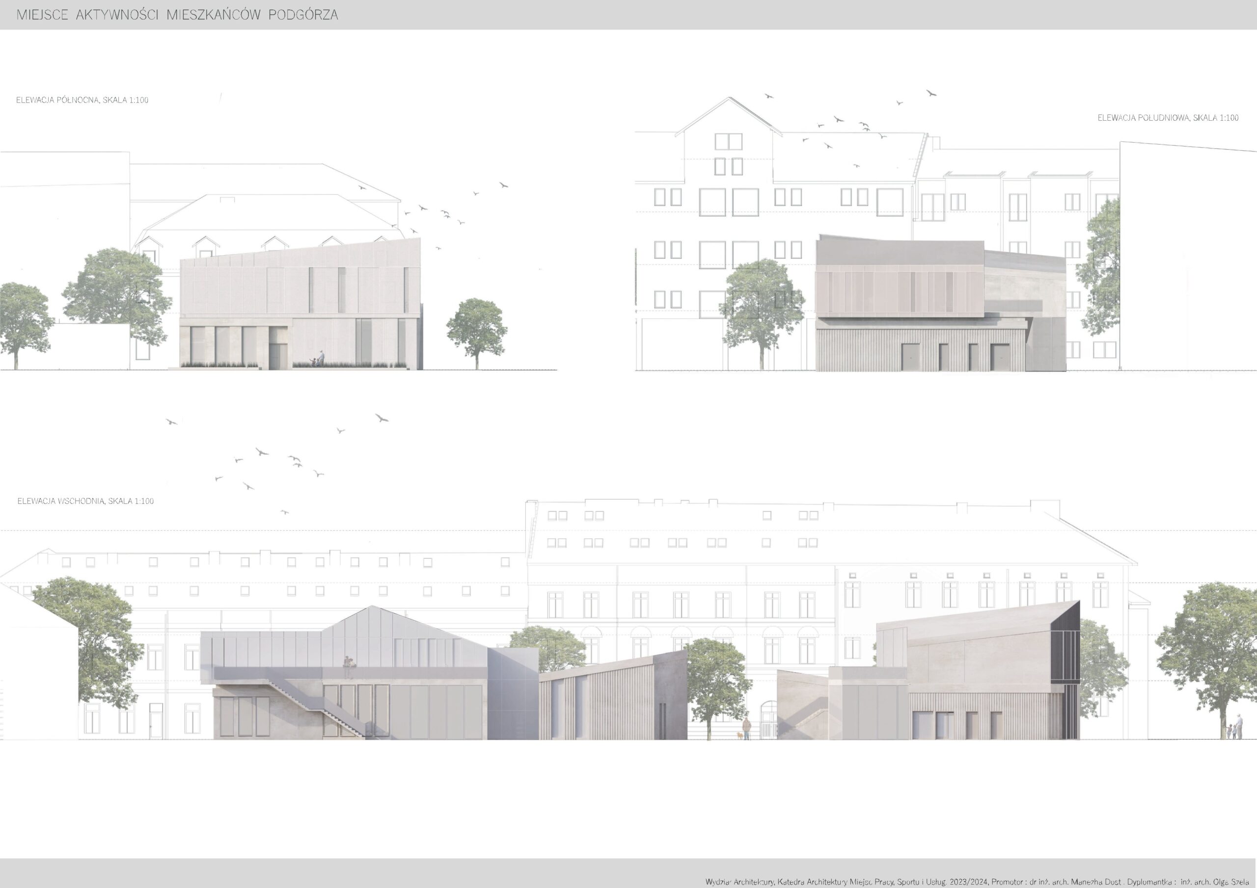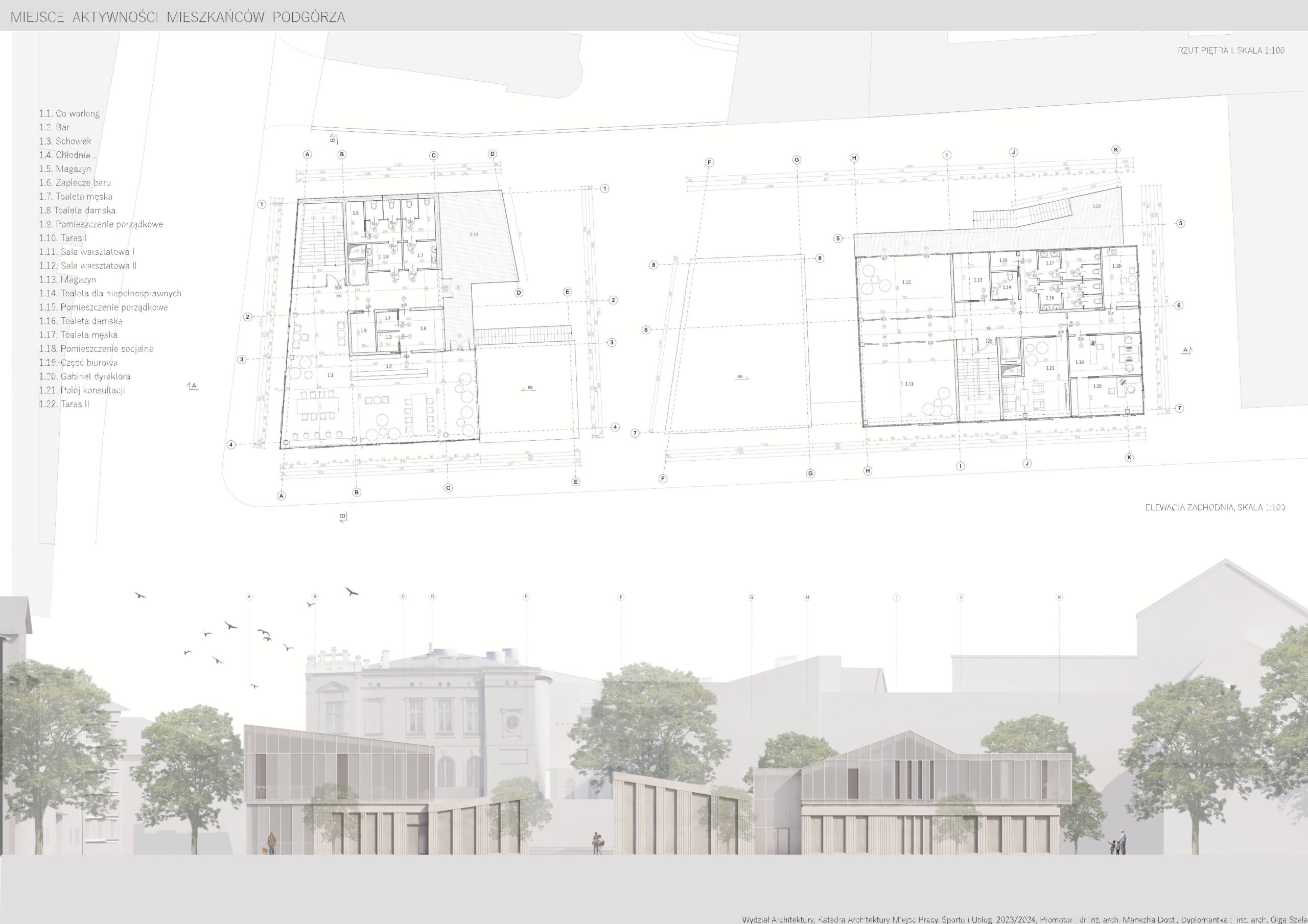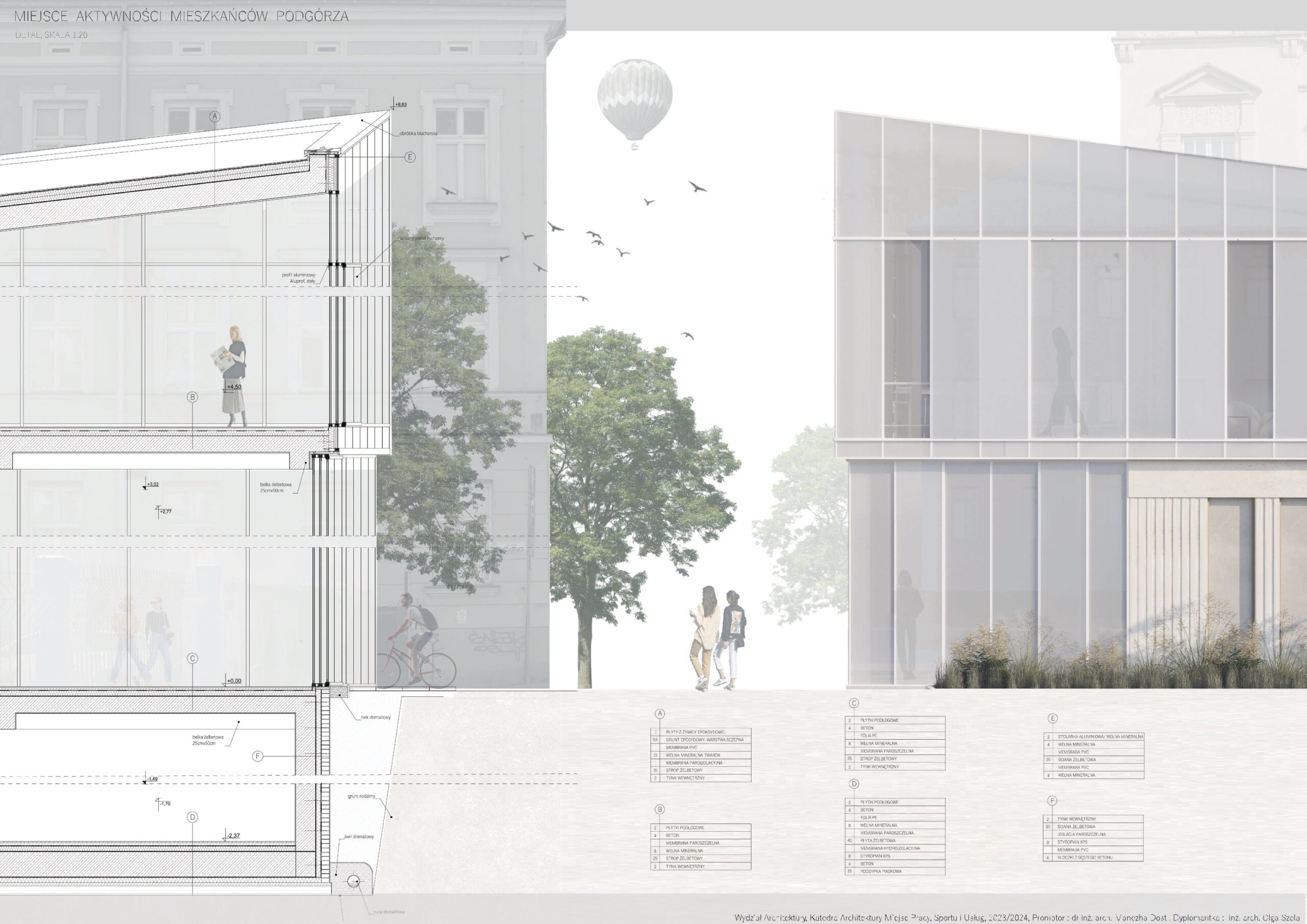 Współczesne miasta wymagają przestrzeni, które nie tylko odpowiadają na potrzeby mieszkańców, ale także sprzyjają ich integracji oraz aktywizacji. Projektowane Miejsce Aktywności Mieszkańców na Podgórzu w Krakowie, ma odpowiadać na te potrzeby, tworząc inspirującą przestrzeń, która wspiera rozwój więzi społecznych i kulturalnych. Głównym założeniem projektu jest stworzenie miejsca, które będzie dostępne przede wszystkim dla lokalnych mieszkańców, oferując elastyczne i funkcjonalne przestrzenie, przystosowane do organizacji różnorodnych wydarzeń. Budynek dedykowany społeczności Starego Podgórza ma na celu zacieśnianie relacji między mieszkańcami poprzez organizację warsztatów, spotkań i wydarzeń, które sprzyjają współpracy i wzajemnej integracji. Drugi obiekt, otwarty na szersze grono odbiorców, oferuje przestrzeń coworkingową oraz kawiarnię, która stwarza dogodne warunki do pracy i nauki. To miejsce ma sprzyjać kreatywności i skupieniu, jednocześnie będąc otwartym na organizację różnorodnych wydarzeń kulturalnych. Architektura projektu nawiązuje do lokalnej tożsamości i specyfiki Podgórza, czerpiąc z idei krytycznego regionalizmu.