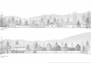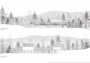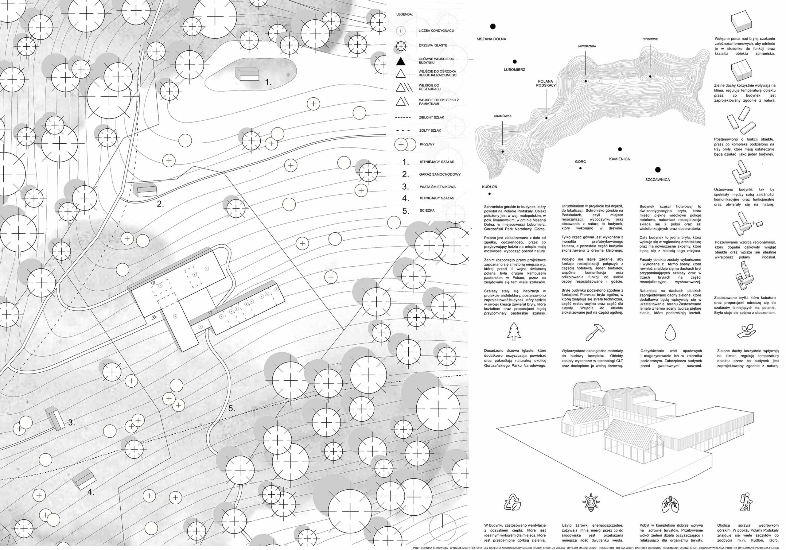 Schronisko Górskie na polanie Podskały to kompleks, który został zaprojektowany w odpowiedzi na zapotrzebowanie turystyczne. Główną ideą było skonstruowanie ekologicznej przestrzeni dla miłośników górskich wędrówek oraz osób, które szukają wyciszenia. Budynek składa się z trzech części: głównego obiektu, części hotelowej oraz resocjalizacyjnej. Zaprojektowany kompleks zawiera w swojej konstrukcji elementy, które kształtem oraz proporcjami odnoszą się do szałasów znajdujących się na wybranej lokalizacji. Położenie projektu umożliwia wiele wędrówek, przez samą polanę prowadzą dwa szlaki turystyczne oraz ścieżka edukacyjna. W projekcie wykorzystano wiele rozwiązań ekologicznych, które idealnie pasują do projektowanej lokalizacji.