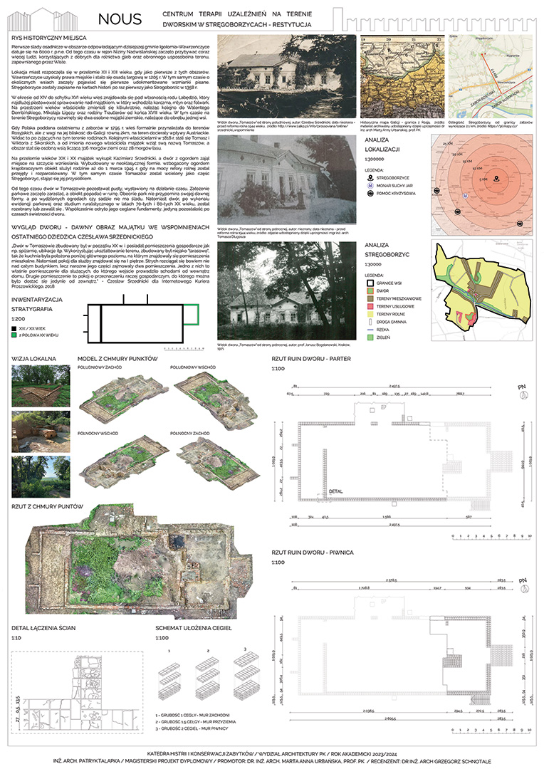 Głównym z założeń projektowych podczas pracy nad restytucją terenu dworskiego w Stręgoborzycach było przywrócenie mu jego dawnego charakteru, pełnego otwartości docierającej z otaczającego go krajobrazu, piękna płynącego z parkowego zagospodarowania terenu oraz spokoju i otwartości wychodzących z dworu. Dążąc do jego realizacji autor chciał zapewnić integralność zabytkowej struktury z nową funkcją planowaną dla tego obszaru, jaką jest centrum terapii uzależnień. Aby osiągnąć zamierzony cel postanowiono zrekonstruować dwór, a otaczające go tereny zielone, poddać rewaloryzacji. Następnie na zagospodarowanym jak dawniej terenie zaprojektowano addycje poszerzające zakres funkcjonalny obszaru, przy jednoczesnym nawiązaniu do kształtującej się wokół dworu osi widokowych. Obierając tę drogę działań projektowych powstała przestrzeń szanująca genius loci oraz napełniająca nim, wraz z nową siłą do życia, przebywające w zespole terapeutycznym osoby.