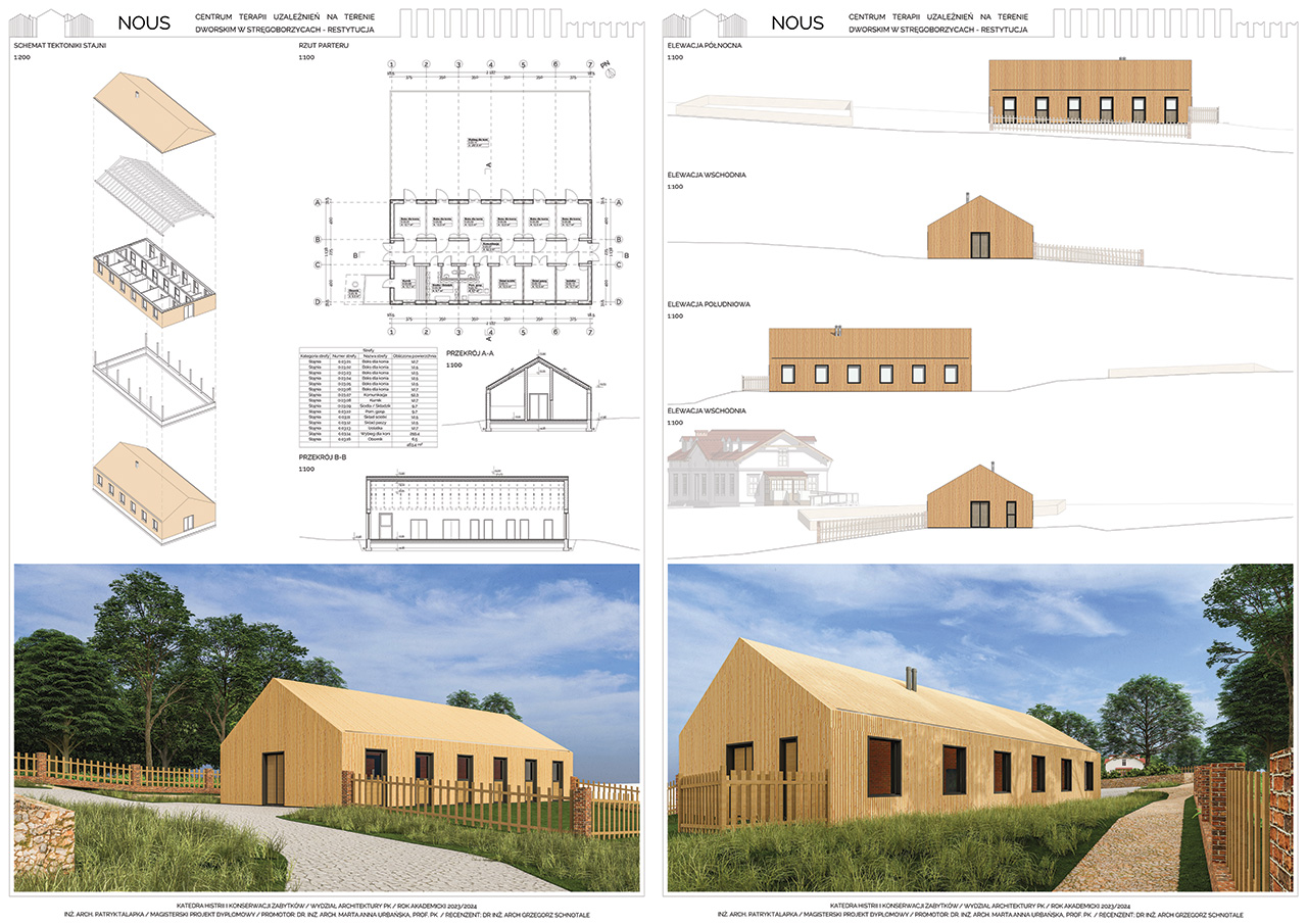 Rekonstrukcja dawnego dworu oraz rewaloryzacja otaczającego go parku krajobrazowego jest działaniem konserwatorskim. Podjęte kroki w celu przywrócenia, niemal utraconego, dziedzictwa zostały obrane z uwagi na szczególne, korzystne właściwości, jakie niesie w sobie całość założenia dla zdrowia psychicznego pacjentów. Równie ważną częścią projektu jest addycja nowych obiektów, czerpiąca swój zamysł z dawnej struktury majątków ziemskich. Budynki zostały zaprojektowane w spójnym minimalistycznym stylu, nadając im kształt prostopadłościanów zwieńczonych dwuspadowym dachem, który nawiązuje do dachu dworu. Jednolicie wykończone drewnem elewacje mają tworzyć dialog z naturalnym otoczeniem. Natomiast ceglany cokół powstały z wykorzystaniem materiału ze znajdujących się na działce ruin, ma być upamiętnieniem oryginalnego dworu oraz metaforą szansy na nowe życie, opartej na silnych fundamentach, jakie mogą zyskać pacjenci podczas leczenia.