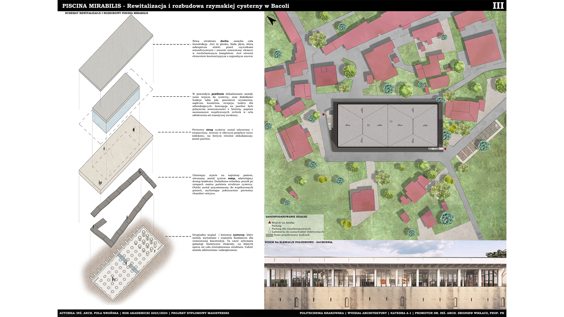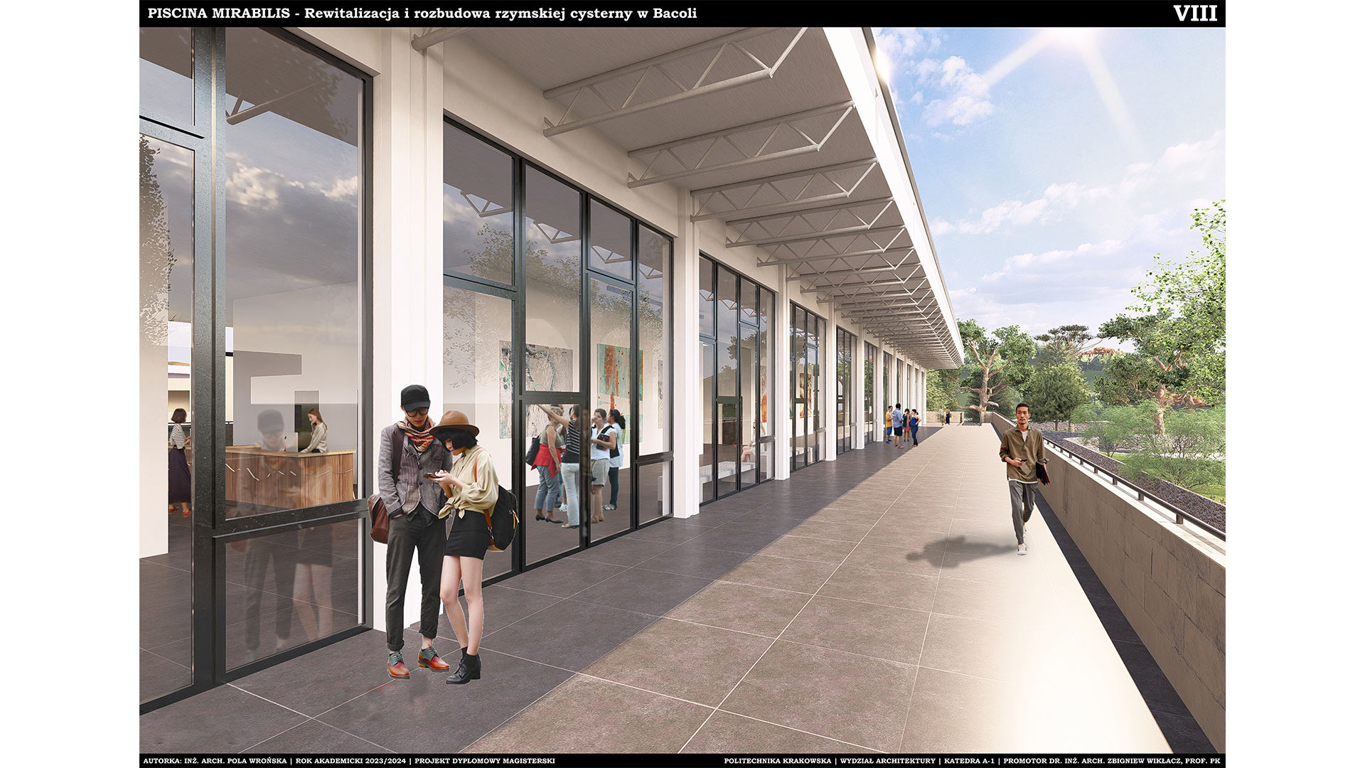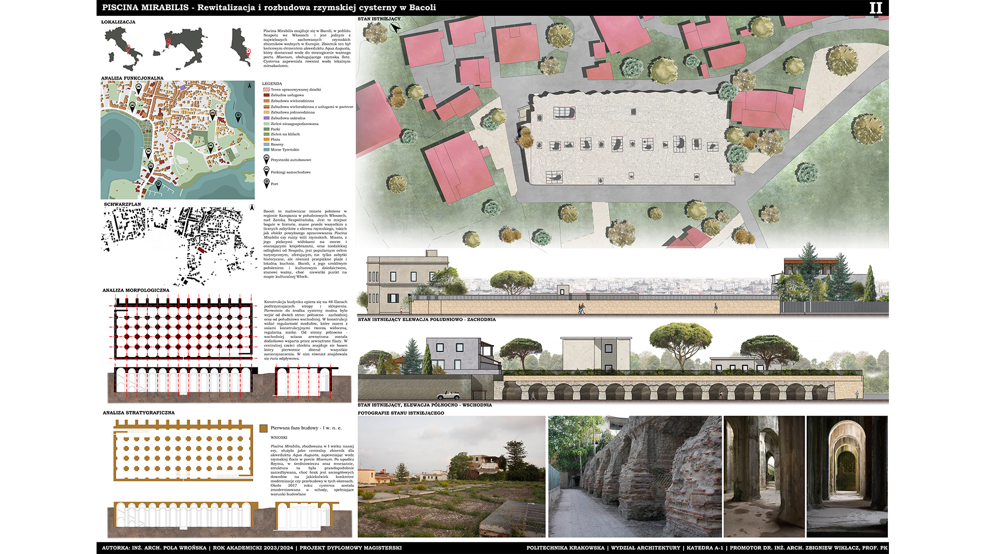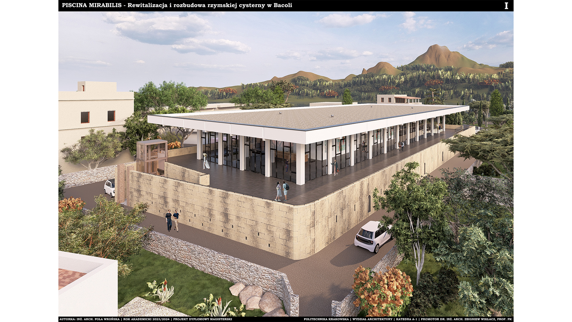 Przedmiotem niniejszej pracy dyplomowej jest rewitalizacja i rozbudowa rzymskiej cysterny Piscina Mirabilis znającej się w miejscowości Bacoli, we Włoszech. Ideą projektu było przywrócenie starożytnego obiektu do świetności, jak i dostosowanie go do nowoczesnych potrzeb, tworząc przestrzeń rozwijająca możliwości ekspozycyjne i turystyczne obiektu. W skład opracowywanego kompleksu wchodzi zabytkowa cysterna, rozbudowana o pawilon na istniejącym stropie, rozszerzając i porządkując wejścia do podziemnej części oraz oferując odwiedzającym przestrzeń rekreacyjną. By podkreślić obecność zabytku w otoczeniu, ze względu na to że jego główna część znajduje się pod ziemią, wykorzystano kontrast między starym, kamiennym murem okalającym cysternę, a nowoczesną prostą jasną formą pawilonu znajdującego się nad zabytkiem. By nie zaburzać monumentalności wnętrza cysterny komunikacja została poprowadzona bocznymi nawami. To samo tyczy się funkcji ekspozycyjnej, która ma za zadanie współgrać z zabytkiem.