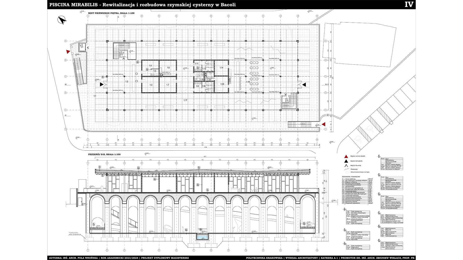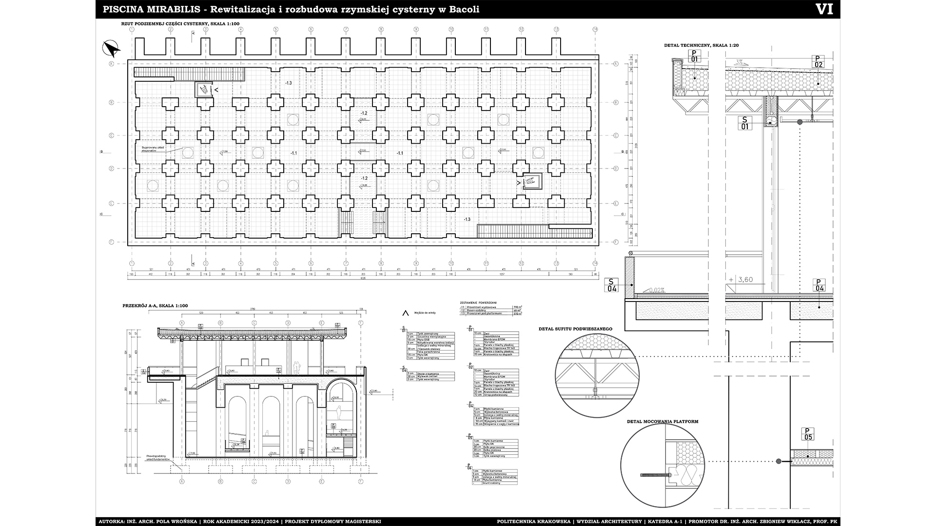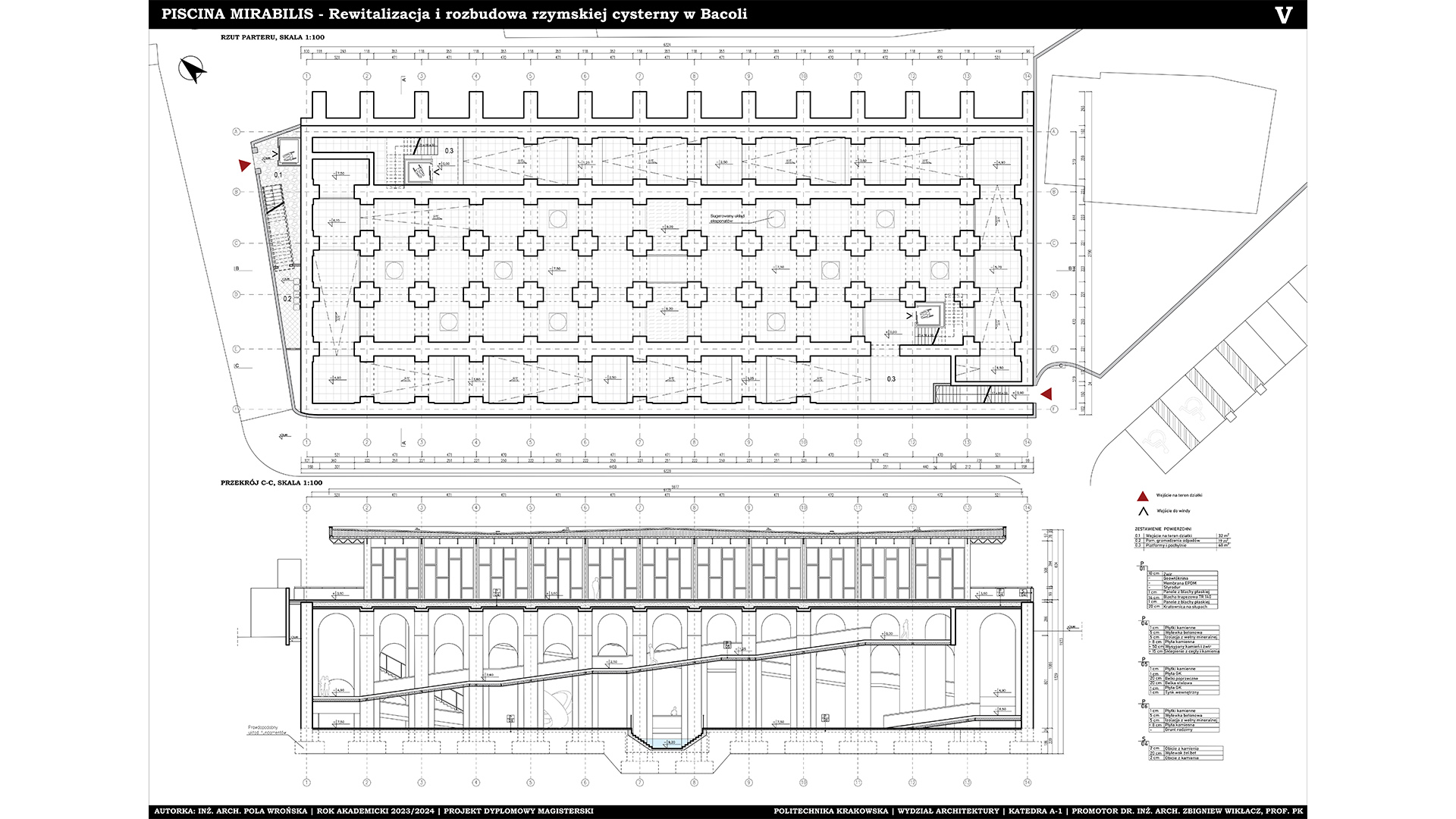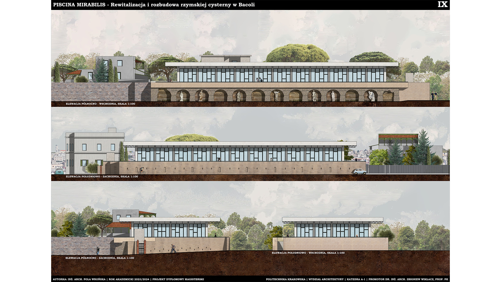 Przedmiotem niniejszej pracy dyplomowej jest rewitalizacja i rozbudowa rzymskiej cysterny Piscina Mirabilis znającej się w miejscowości Bacoli, we Włoszech. Ideą projektu było przywrócenie starożytnego obiektu do świetności, jak i dostosowanie go do nowoczesnych potrzeb, tworząc przestrzeń rozwijająca możliwości ekspozycyjne i turystyczne obiektu. W skład opracowywanego kompleksu wchodzi zabytkowa cysterna, rozbudowana o pawilon na istniejącym stropie, rozszerzając i porządkując wejścia do podziemnej części oraz oferując odwiedzającym przestrzeń rekreacyjną. By podkreślić obecność zabytku w otoczeniu, ze względu na to że jego główna część znajduje się pod ziemią, wykorzystano kontrast między starym, kamiennym murem okalającym cysternę, a nowoczesną prostą jasną formą pawilonu znajdującego się nad zabytkiem. By nie zaburzać monumentalności wnętrza cysterny komunikacja została poprowadzona bocznymi nawami. To samo tyczy się funkcji ekspozycyjnej, która ma za zadanie współgrać z zabytkiem.