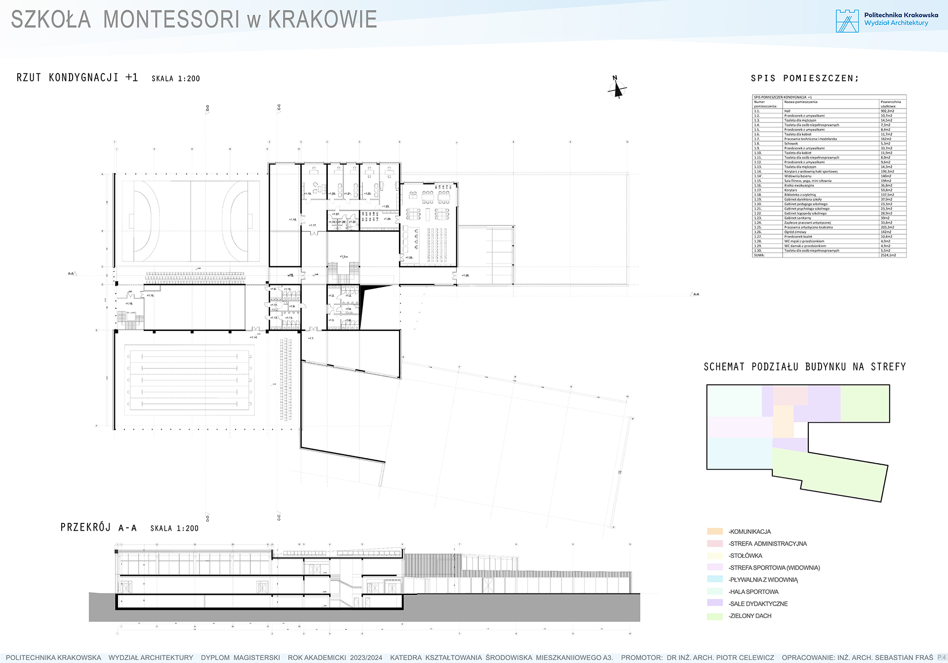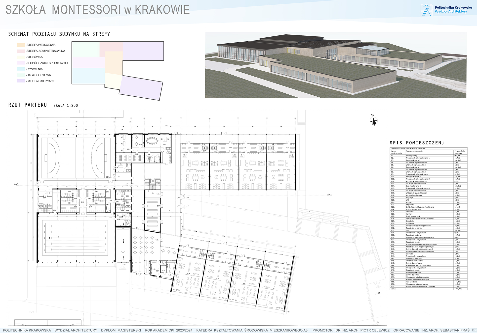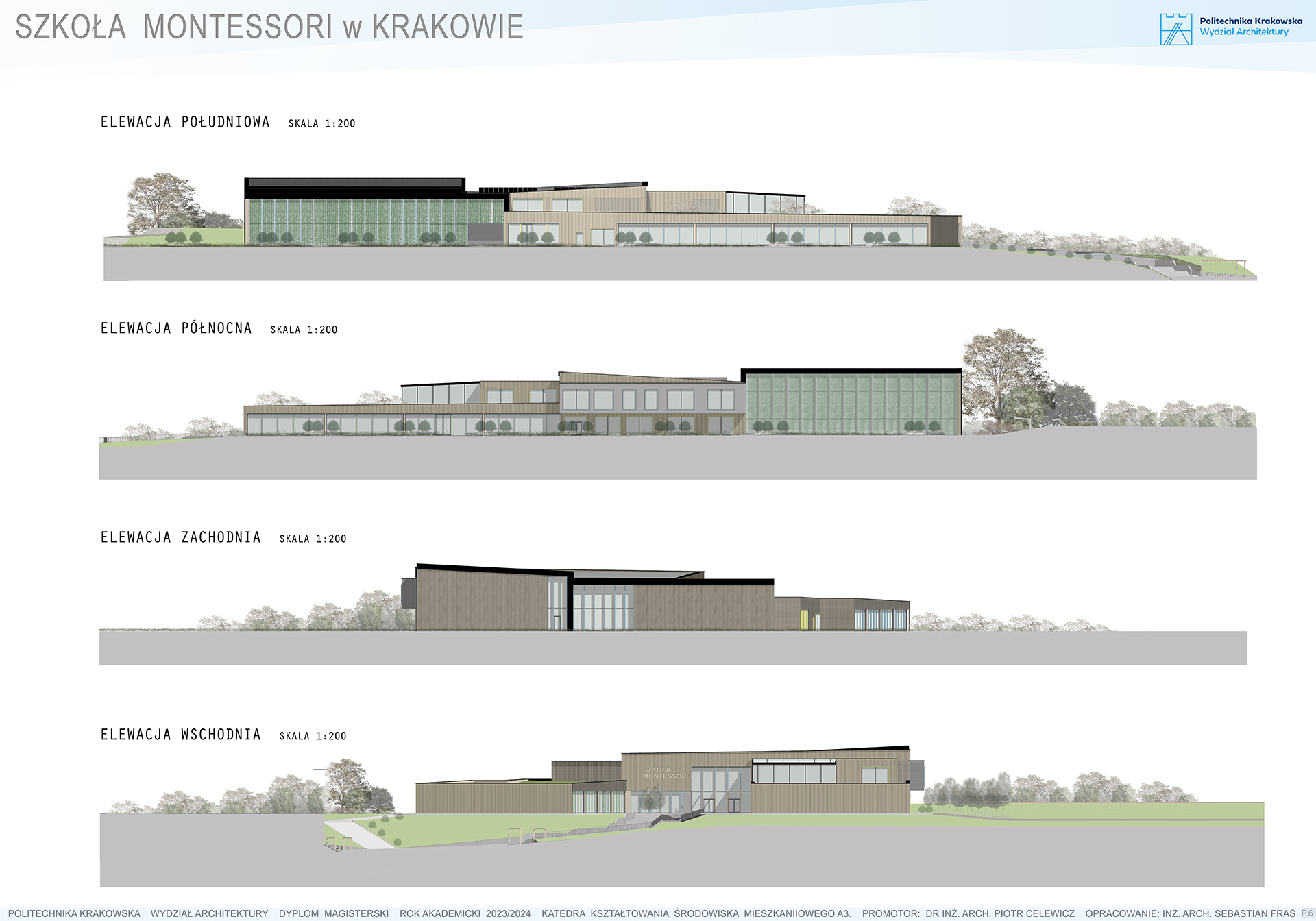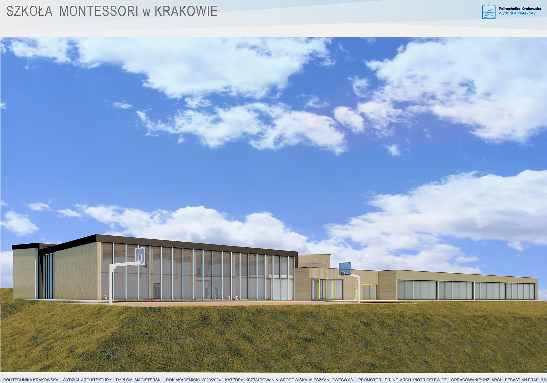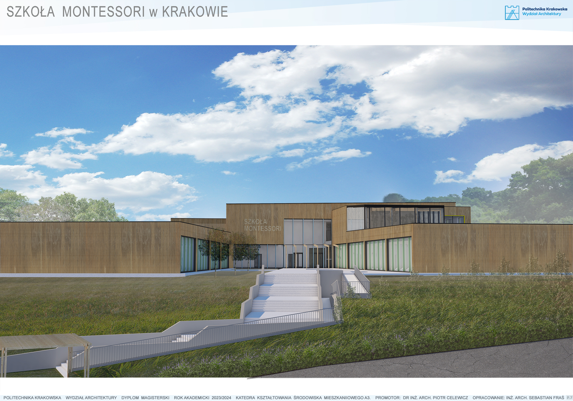 Projekt architektoniczny szkoły na Górce Narodowej w Krakowie zakłada stworzenie przestrzeni edukacyjnej, która odpowiada na współczesne potrzeby edukacyjne i społeczne, jednocześnie harmonijnie łącząc zasady edukacji z naturalnym środowiskiem. Kluczowym elementem projektu jest integracja założeń nowoczesnej architektury z filozofią indywidualnego podejścia do ucznia, jak i z myślą o odpowiedzialności środowiskowej. Budynek szkoły został zaprojektowany w sposób, który podkreśla znaczenie przestrzeni otwartej, wspierającej współpracę i kreatywność odbiorców. Przestrzenie edukacyjne są jasne, przestronne i elastyczne, co umożliwia ich wielofunkcyjne wykorzystanie. Duże okna wpuszczają naturalne światło, tworząc zdrowe, sprzyjające koncentracji otoczenie. Swobodny dostęp do naturalnego światła wpływa pozytywnie na samopoczucie uczniów i personelu oraz poprawia efektywność nauki.Jednym z fundamentalnych założeń architektonicznych jest również otwarcie budynku na kontakt z naturą. Projekt przewiduje ogrody edukacyjne oraz przestrzenie rekreacyjne, które są integralną częścią szkolnego kampusu. Tereny zielone nie tylko sprzyjają relaksowi, ale również umożliwiają realizację zajęć na świeżym powietrzu, co wzbogaca proces edukacyjny. Przestrzeń wokół szkoły staje się aktywnym elementem edukacji, wspierając rozwój sensoryczny dzieci poprzez bezpośredni kontakt z naturą. W projekcie uwzględniono także strefy ciszy – przestrzenie przeznaczone do indywidualnej pracy i refleksji. Materiałami dominującymi w budynku są drewno, beton, kamień oraz szkło, co podkreśla ekologiczny charakter szkoły. Zastosowanie takich materiałów nie tylko wprowadza ciepłą i przyjazną atmosferę, ale także wzmacnia trwałość konstrukcji oraz tworzy zdrowe środowisko wewnętrzne.Harmonijne połączenie przestrzeni edukacyjnych, rekreacyjnych i naturalnych tworzy dynamiczną przestrzeń, która sprzyja wszechstronnemu rozwojowi dzieci. Architektura budynku wspiera proces edukacyjny, integrując elementy natury, otwartych przestrzeni i zrównoważonych rozwiązań, co czyni ten projekt nowoczesną odpowiedzią na potrzeby współczesnych rodzin szukających innowacyjnych form edukacji.