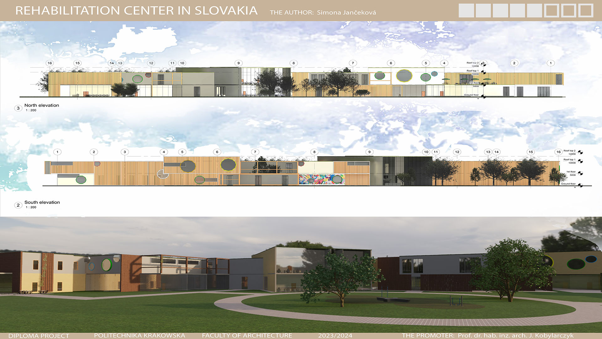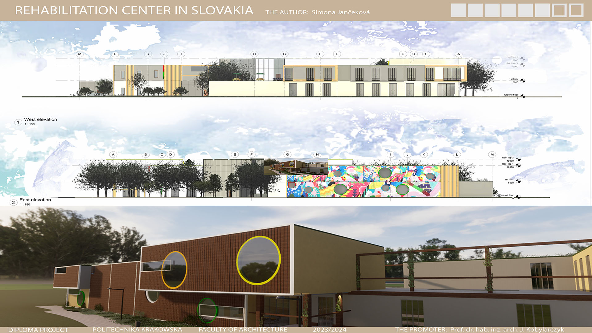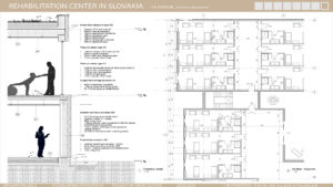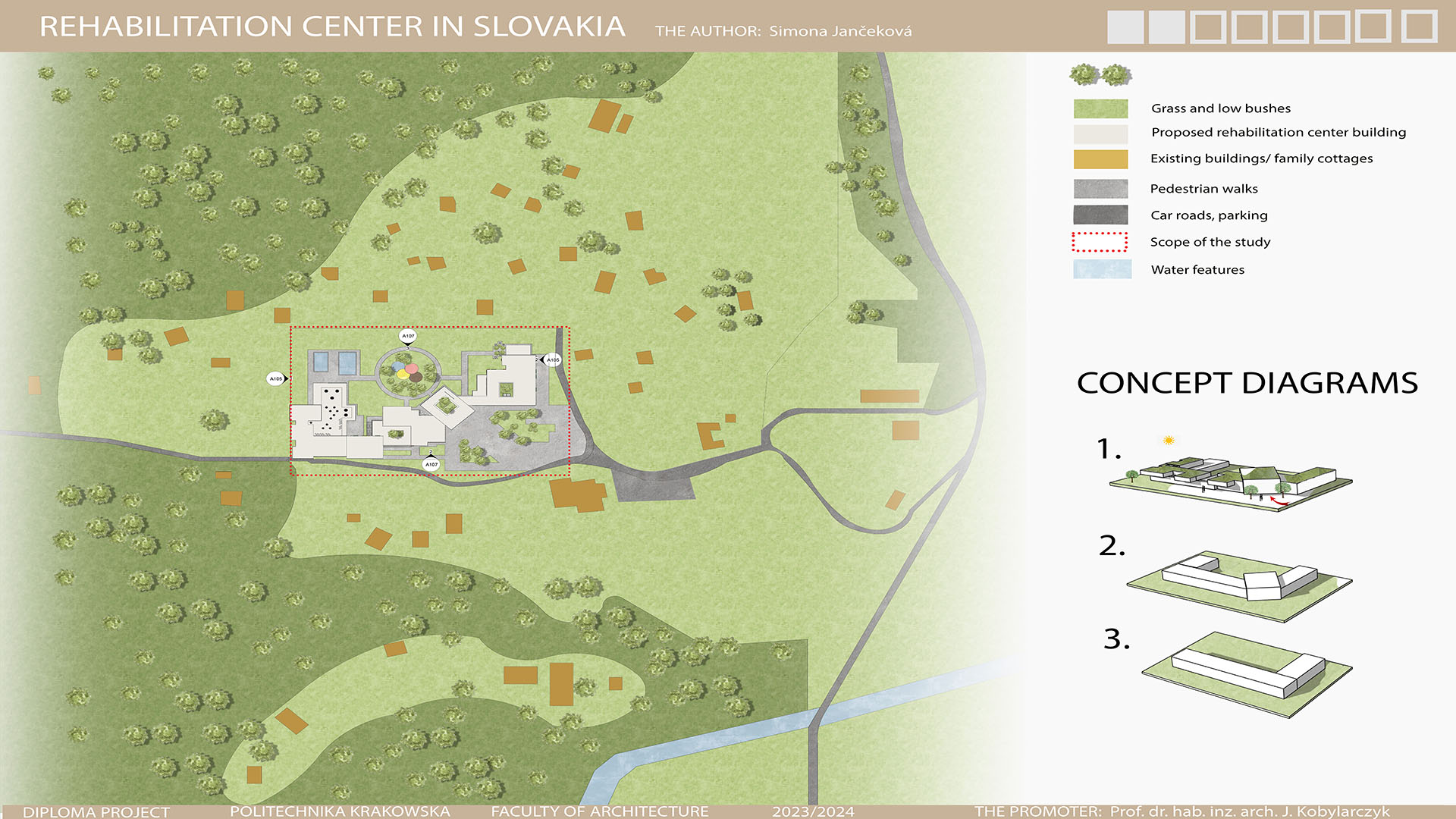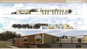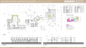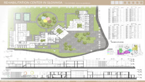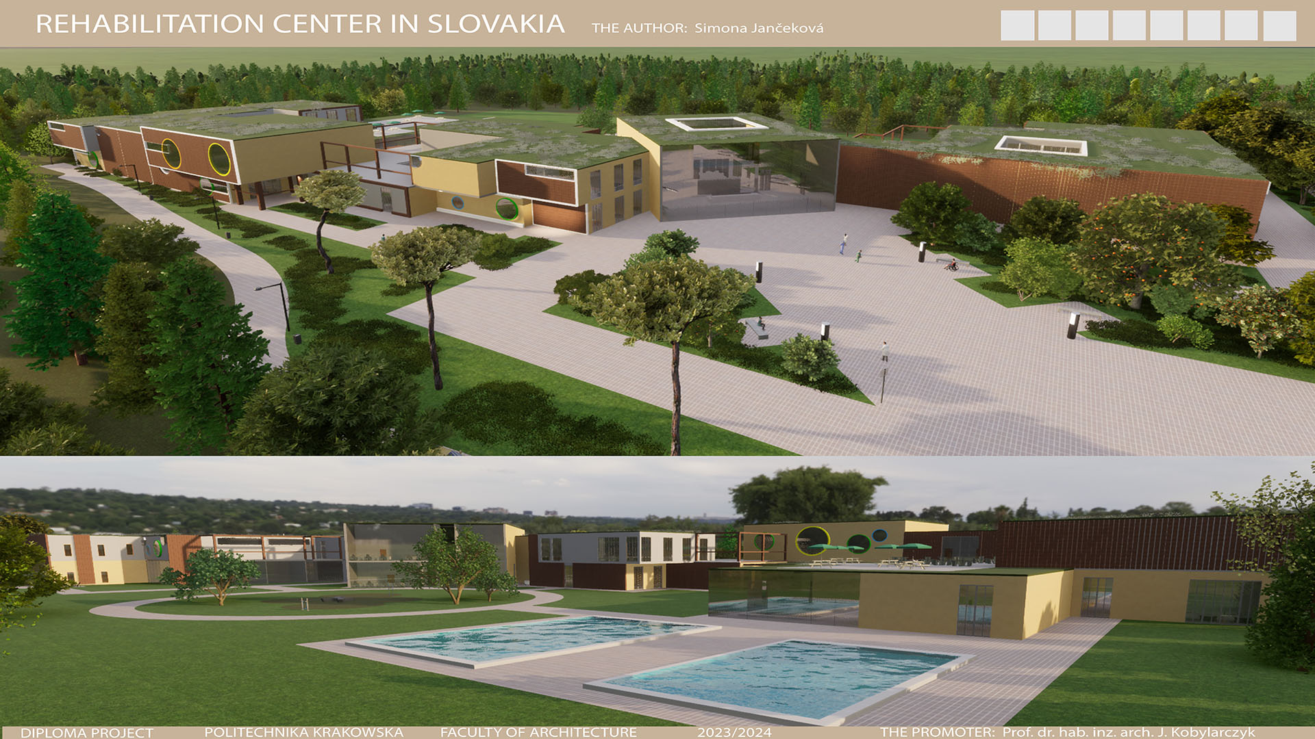 The subject of my investigation is a building with contemporary rehabilitation space connected  to the natural environment. The main motive in the selection of the diploma project was primarily to take into account various aspects, for example, broadening my range of experience and enriching myself with information related to the design development of health centers, since currently many people suffer from various health problems caused by the covid situation or difficulties caused by the age of the person in question. The main goal of this project was the creation of a rehabilitation center that meets various requirements, such as functionality, sustainable solutions, easy accessibility, whether for health-impaired people with various mental or physical disabilities and of course taking  into account  the patients’ comfort and adequate medical care.The geographical localization of the proposed project is in Oravice which is a settlement in the north of Slovakia, within close range of the Polish border.Oravice is special in that there is a high occurrence of thermal springs, whichcontributed to building a fully functional rehabilitation center in this location.The rehabilitation center consists of two floors. The ground and first floors are divided into three main zones, namely the healthcare zone, administration zone, accommodation zone together with SPA zone.
