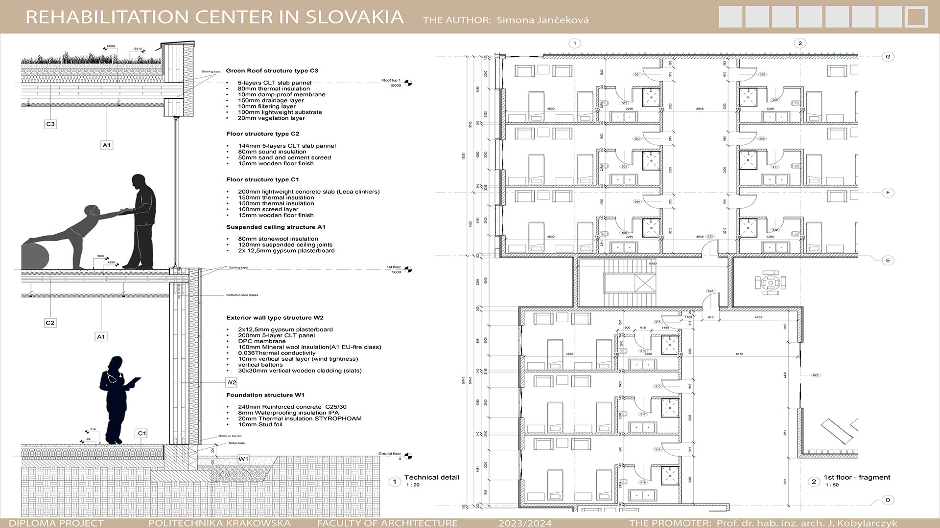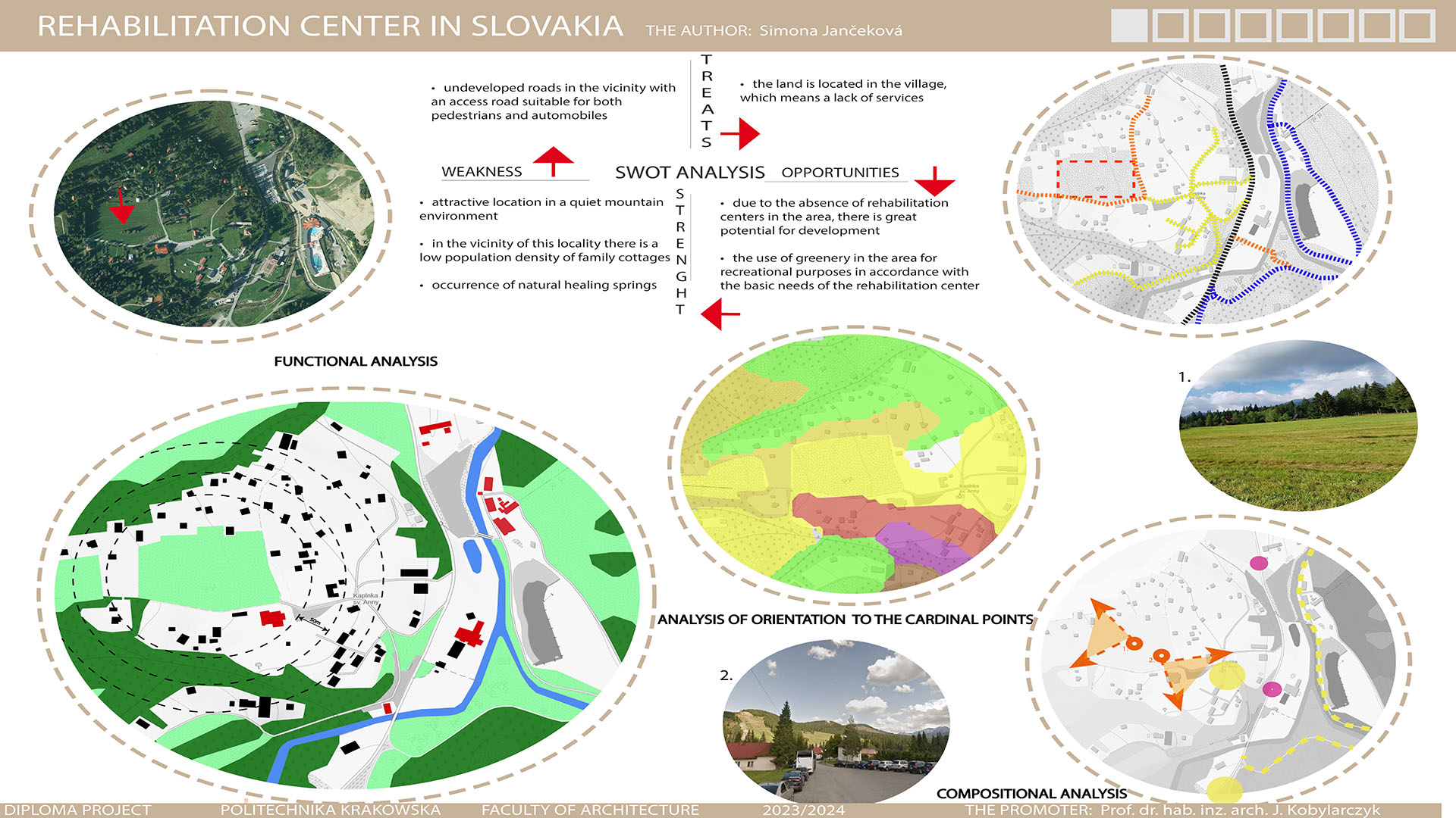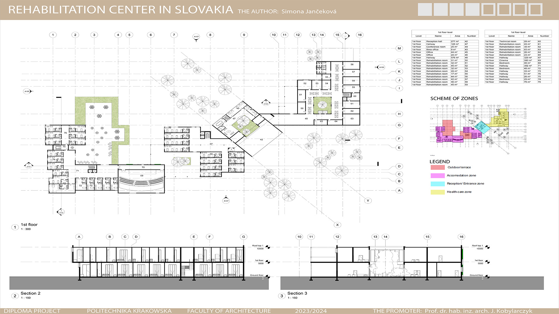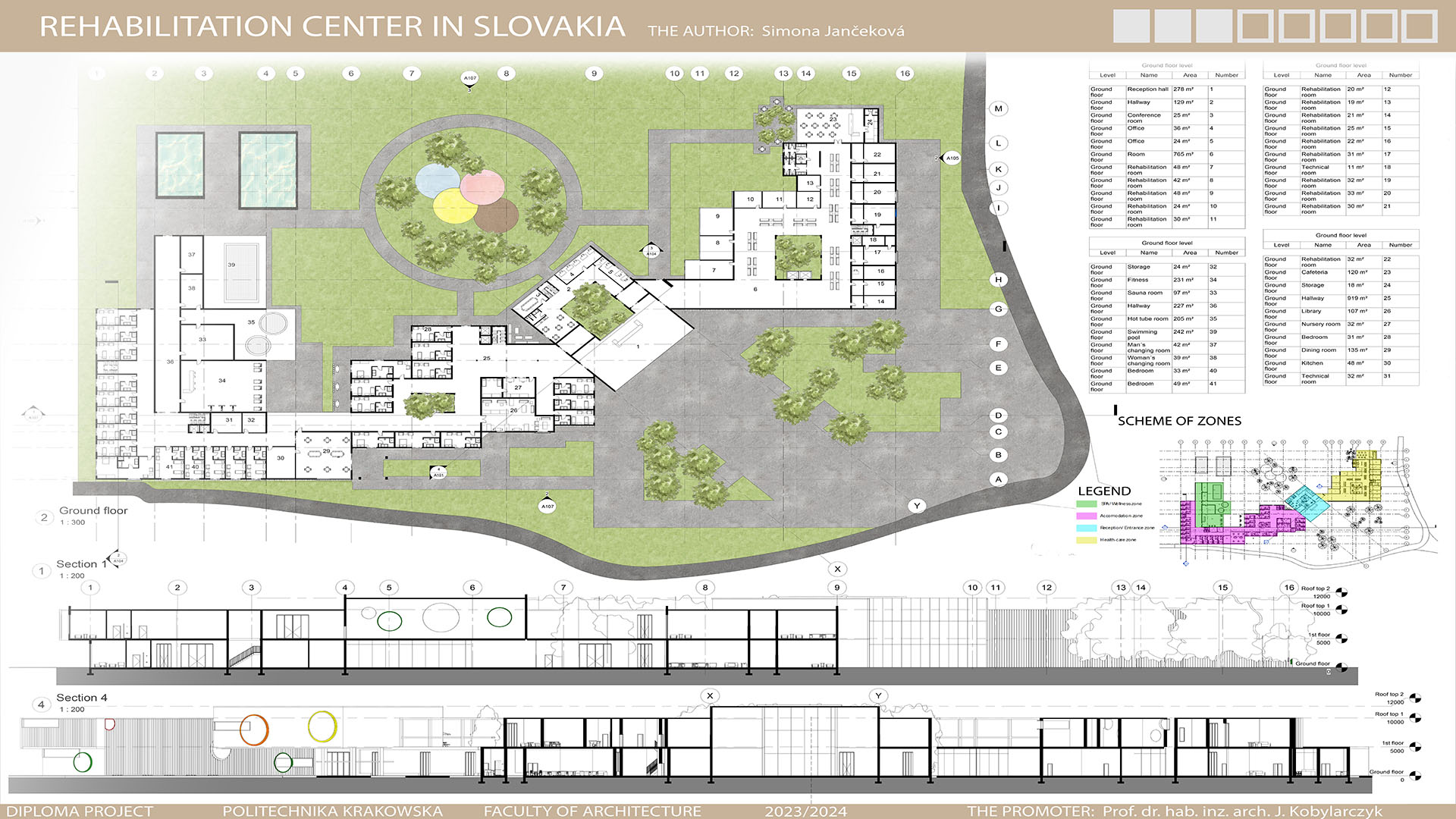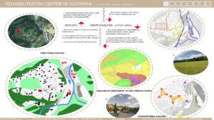 The subject of my investigation is a building with contemporary rehabilitation space connected  to the natural environment. The main motive in the selection of the diploma project was primarily to take into account various aspects, for example, broadening my range of experience and enriching myself with information related to the design development of health centers, since currently many people suffer from various health problems caused by the covid situation or difficulties caused by the age of the person in question. The main goal of this project was the creation of a rehabilitation center that meets various requirements, such as functionality, sustainable solutions, easy accessibility, whether for health-impaired people with various mental or physical disabilities and of course taking  into account  the patients’ comfort and adequate medical care.The geographical localization of the proposed project is in Oravice which is a settlement in the north of Slovakia, within close range of the Polish border.Oravice is special in that there is a high occurrence of thermal springs, whichcontributed to building a fully functional rehabilitation center in this location.The rehabilitation center consists of two floors. The ground and first floors are divided into three main zones, namely the healthcare zone, administration zone, accommodation zone together with SPA zone.