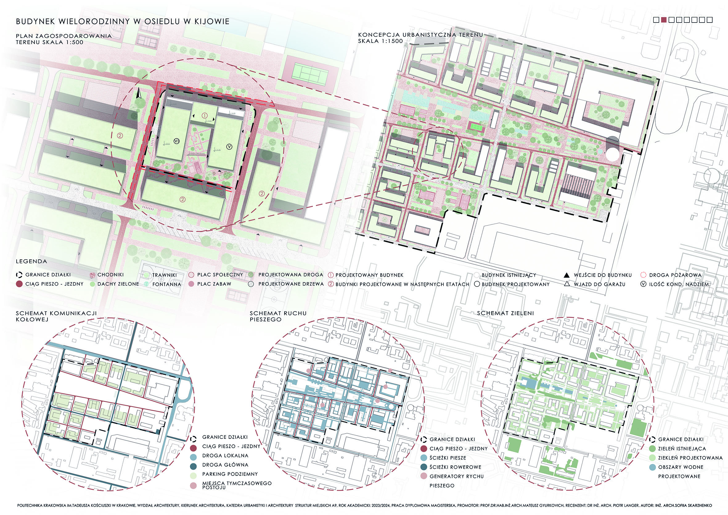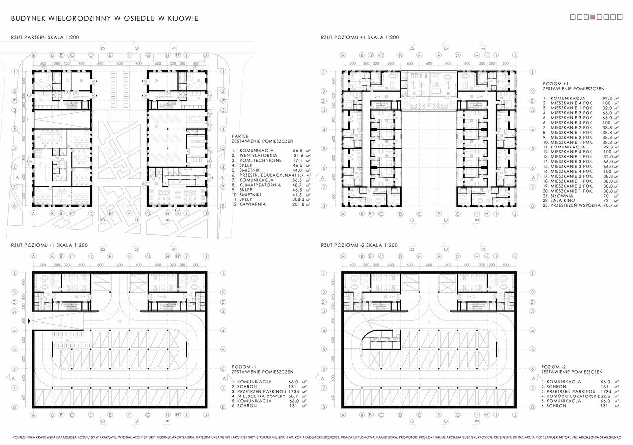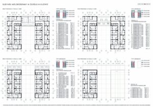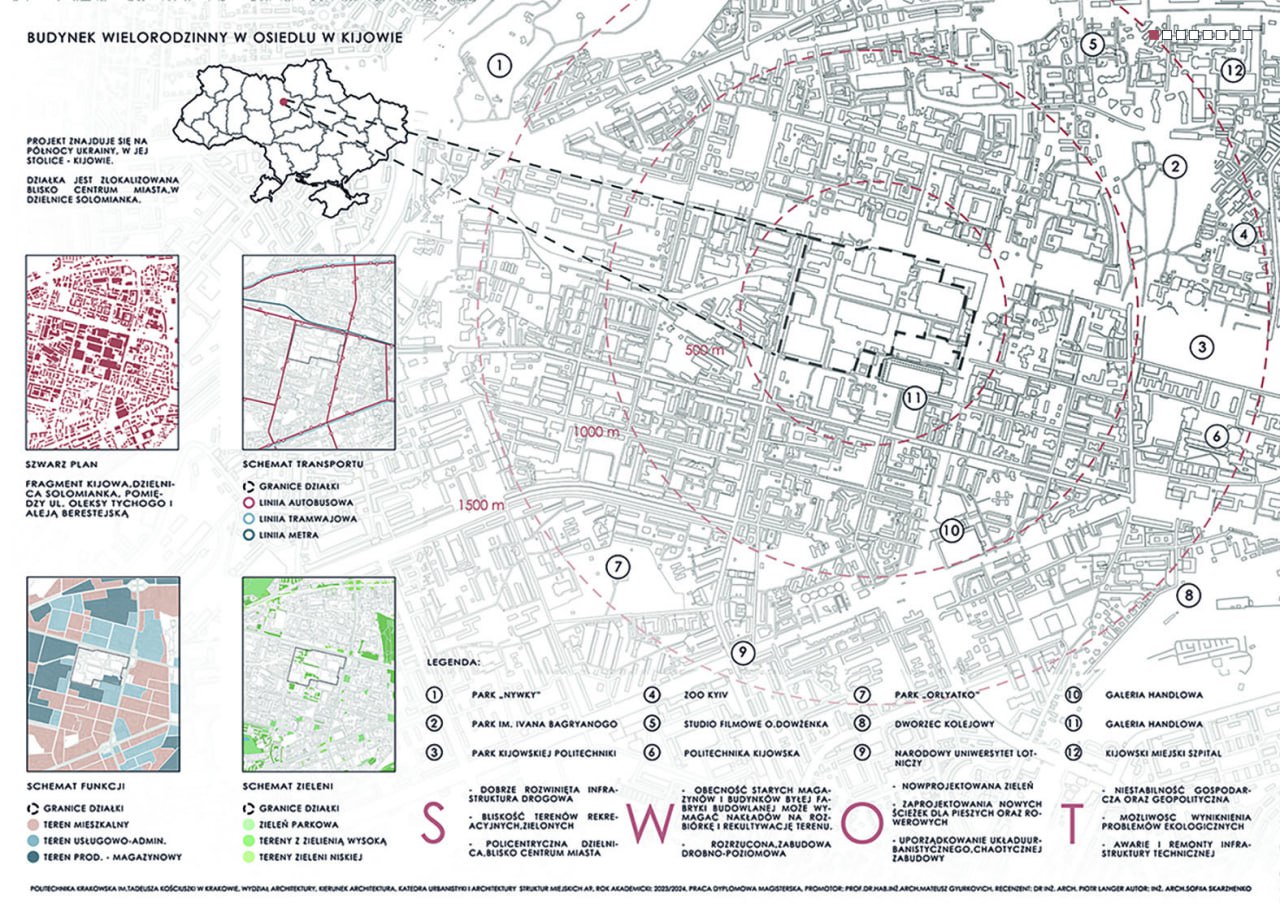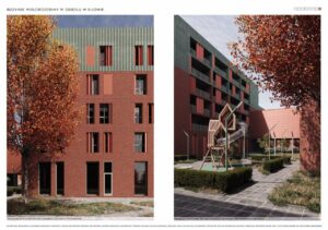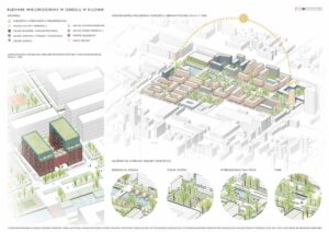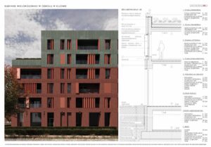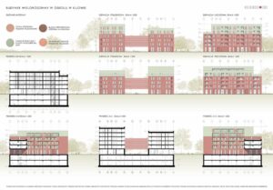 W czasach wojny, kiedy wszystko zdaje się niszczeć, to właśnie tworzenie piękna i trwanie przy życiu jest naszą najpotężniejszą formą oporu i nadziei. Projekt zakłada przekształcenie terenu dawnej, nieczynnej fabryki w nowoczesną przestrzeń mieszkalną, która będzie odpowiadać na współczesne potrzeby społeczności, ze szczególnym uwzględnieniem bezpieczeństwa i integracji społecznej. Koncepcja urbanistyczna opiera się na stworzeniu półotwartych kwartałów, które umożliwiają mieszkańcom łatwą komunikację i integrację. Układ ten pozwala na wykształcenie kameralnych przestrzeni wewnętrznych, które płynnie przenikają w inne otwarte przestrzenie, sprzyjając budowaniu więzi sąsiedzkich. Przestrzeń była stworzona z myślą o dostępie dla wszystkich warstw społeczeństwa również dla osób z niepełnosprawnościami. Zróżnicowanie wysokości zabudowy – wyższe budynki od strony północnej i niższe od strony południowej – mają na celu zapewnienie jak najlepszego oświetlenia całej przestrzeni, co pozytywnie wpływa na komfort życia mieszkańców. Projektowany obszar został podzielony na dwie części pasem zielonym – parkiem, na osie parku znajduje się dominanta – wysoki budynek w kształcie cylindra. Bezpieczeństwo mieszkańców jest kluczowym założeniem projektu, szczególnie w kontekście obecnej sytuacji wojennej na Ukrainie. W odpowiedzi na te wyzwania budynek został zaprojektowany z myślą o maksymalnej ochronie. Konstrukcja z żelbetu, wzmocnione ściany na poziomie podziemnym oraz parterowym, a także przewidziane schrony, gwarantują mieszkańcom bezpieczne schronienie w razie zagrożenia. Budynek składa się z trzech części: dwóch mieszkalnych oraz łącznika o funkcji społecznej. Przestrzenie wspólne są integralnym elementem projektu, z uwagi na konieczność utrzymania relacji społecznych nawet w trudnych warunkach, takich jak godzina policyjna czy kwarantanna. W celu zapewnienia dodatkowej ochrony każde okno i balkon zostały wyposażone w aluminiowe żaluzje, które nie tylko ochronią przed nadmiernym słońcem, ale również zwiększą bezpieczeństwo w przypadku eksplozji.