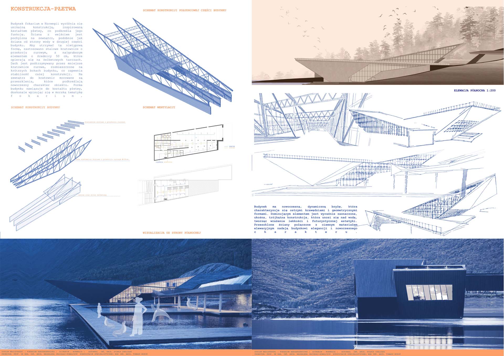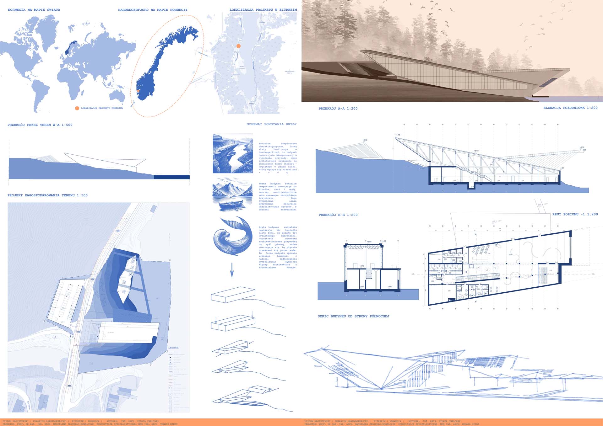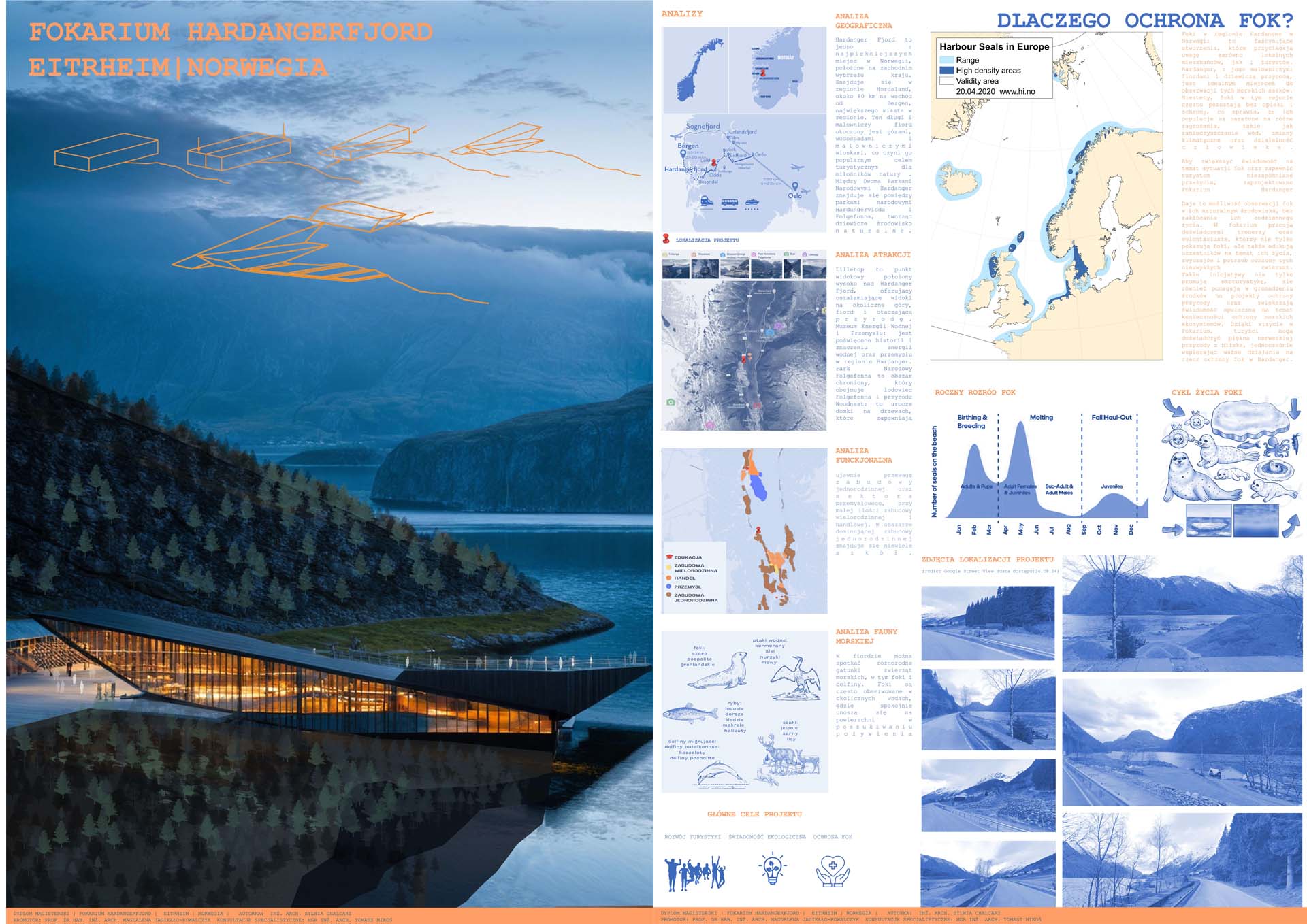 Fokarium Hardangerfjord to nowoczesny obiekt edukacyjny – powstał w odpowiedzi na dotychczasowe zaniedbania i brak uwagi poświęconej fokom, które często są pomijane w działaniach ochronnych. Miejsce to oferuje wsparcie dla chorych, osłabionych, starszych osobników oraz dla młodych fok, które straciły matkę i zgubiły drogę. Fokarium ma na celu edukację i podnoszenie świadomości na temat tych zwierząt oraz całego świata morskiego, a także zrzeszanie wolontariuszy i naukowców pracujących nad ich ochroną. Obiekt pełni również funkcję turystyczną, przyciągając odwiedzających i wspierając rozwój lokalnej turystyki, w której dotychczas brakowało informacji o tych wyjątkowych zwierzętach.Budynek ma nowoczesną, dynamiczną bryłę, która charakteryzuje się ostrymi krawędziami i geometrycznymi formami. Dominującym elementem jest wyraźnie zaznaczona, ukośna, trójkątna konstrukcja, która unosi się nad wodą, tworząc wrażenie lekkości i futurystycznej estetyki. Skośna forma budynku tworzy wizualne połączenie z otaczającą naturą, w tym pobliskim wzgórzem i fiordem w który wbija się budowla.