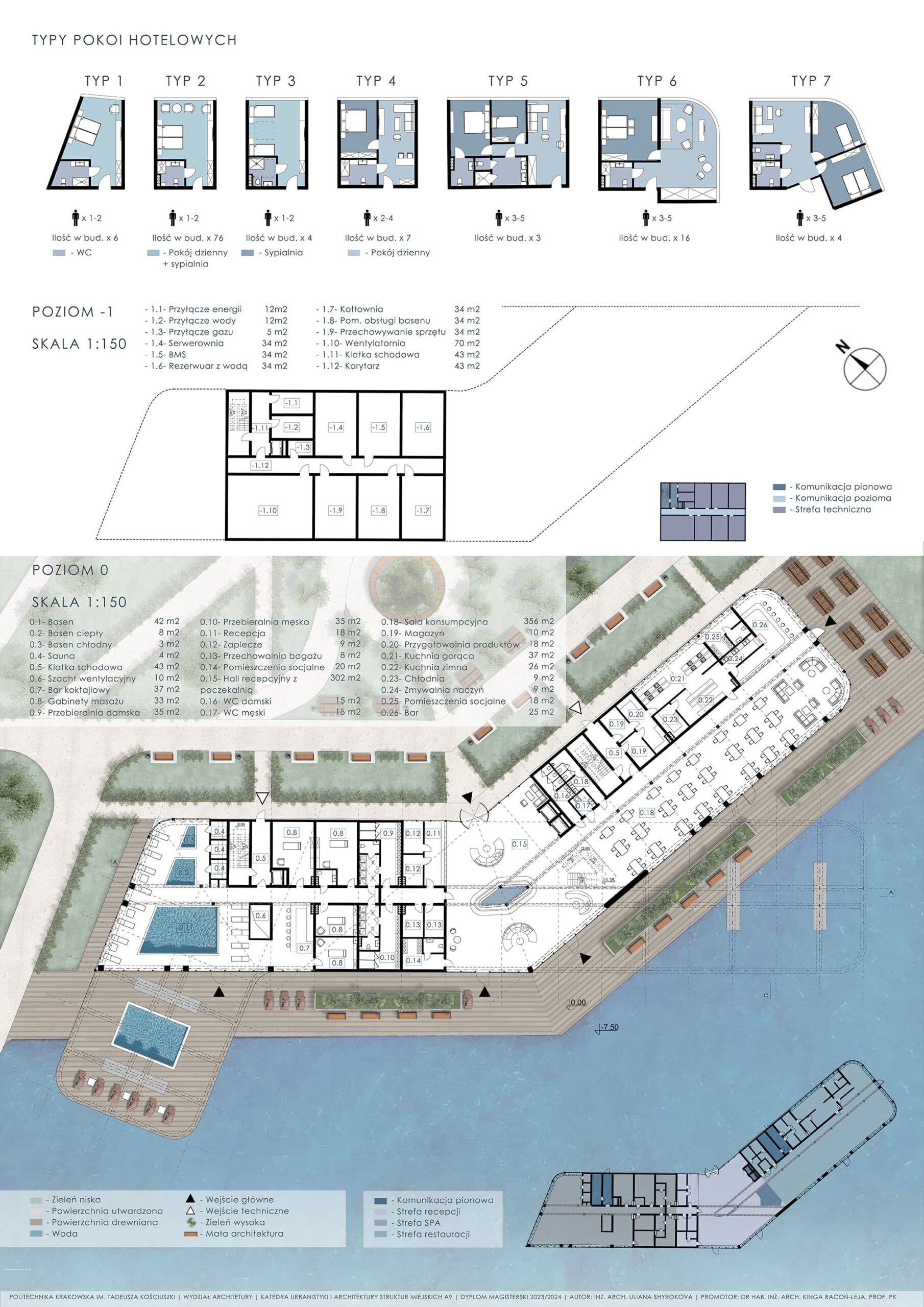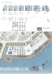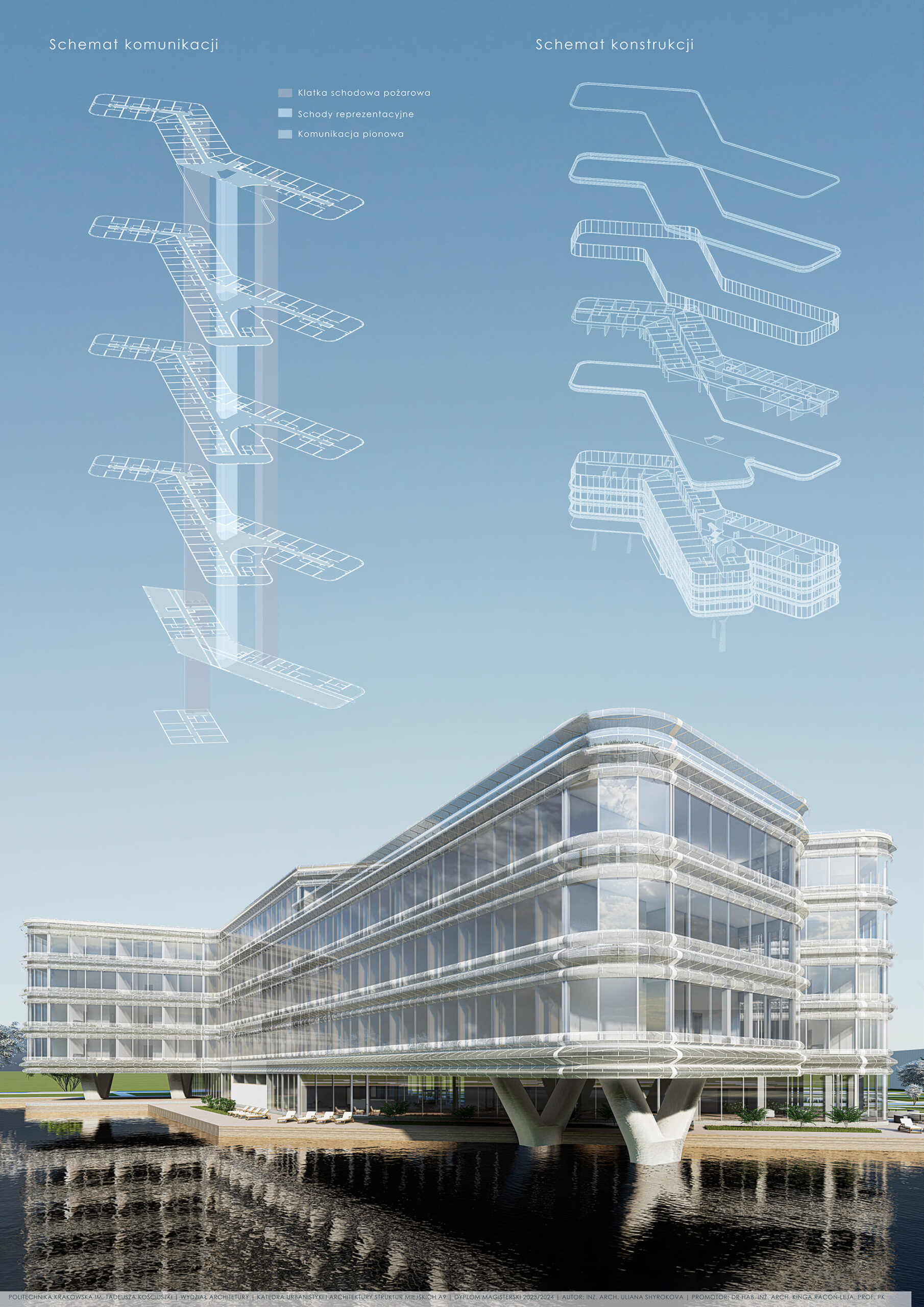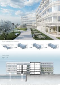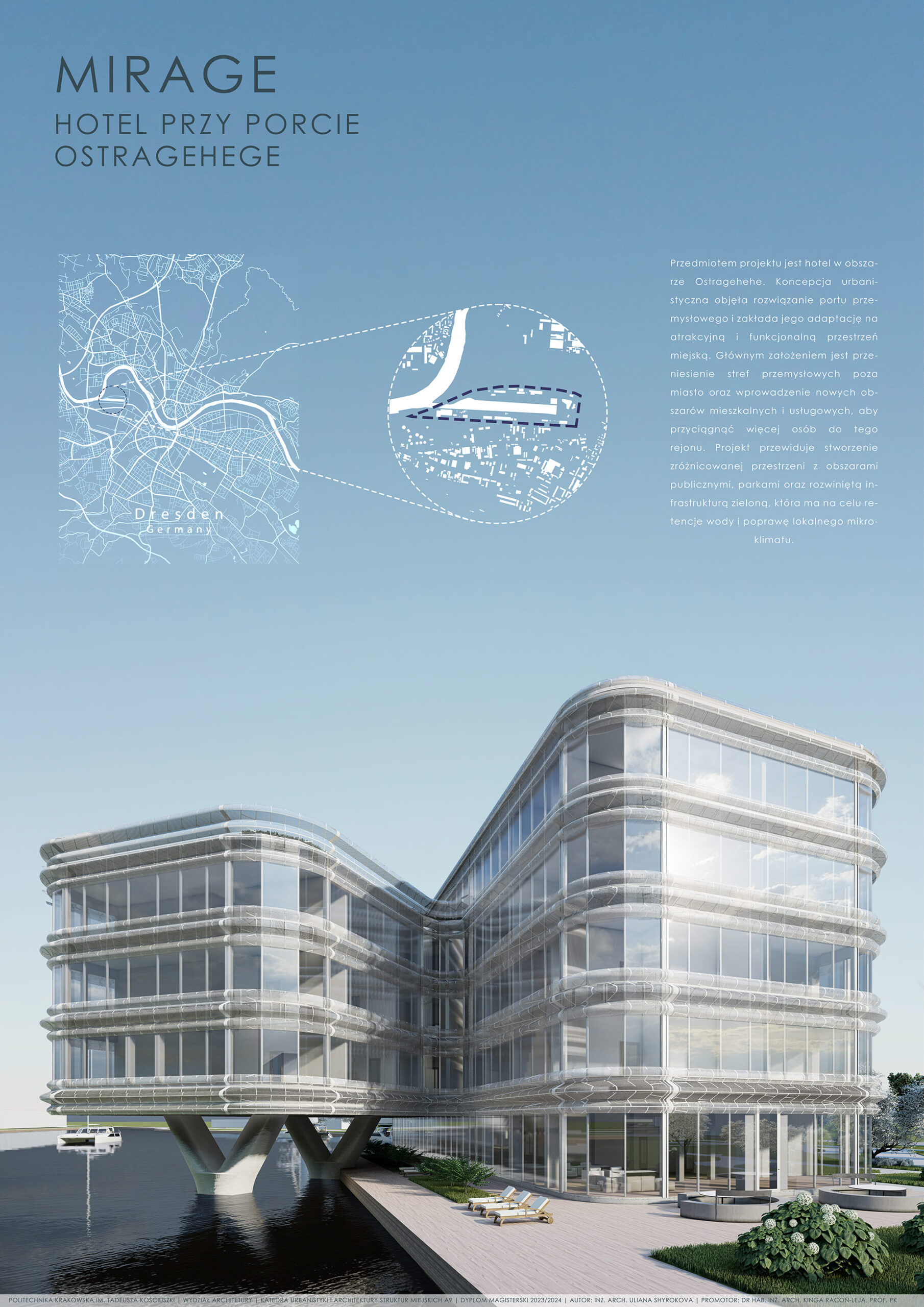 Przedmiotem projektu jest hotel w obszarze Ostragehehe. Koncepcja urbanistyczna objęła rozwiązanie portu przemysłowego i zakłada jego adaptację na atrakcyjną i funkcjonalną przestrzeń miejską. Głównym założeniem jest przeniesienie stref przemysłowych poza miasto oraz wprowadzenie nowych obszarów mieszkalnych i usługowych, aby przyciągnąć więcej osób do tego rejonu. Projekt przewiduje stworzenie zróżnicowanej przestrzeni z obszarami publicznymi, parkami oraz rozwiniętą infrastrukturą zieloną, która ma na celu retencje wody i poprawę lokalnego mikroklimatu. Koncepcja architektoniczna dotyczy budynku hotelowego i zakłada harmonijne połączenie nowoczesnej architektury z otaczającą przyrodą i wodą. Dzięki przeszklonym elewacjom hotel odbija powierzchnię wody, co tworzy wrażenie płynnego połączenia między ziemią a niebem. Przy projektowaniu budynku wykorzystano nowoczesne materiały, takie jak szkło, beton i stal, podkreślając jego trwałość i nowoczesny wygląd. W projekcie przewidziano różnorodne strefy użytkowe, w tym pokoje hotelowe, przestrzenie wspólne, strefę usługową oraz taras z zielenią na ostatnim piętrze. Hotel oferuje pokoje o różnych standardach i konfiguracjach.