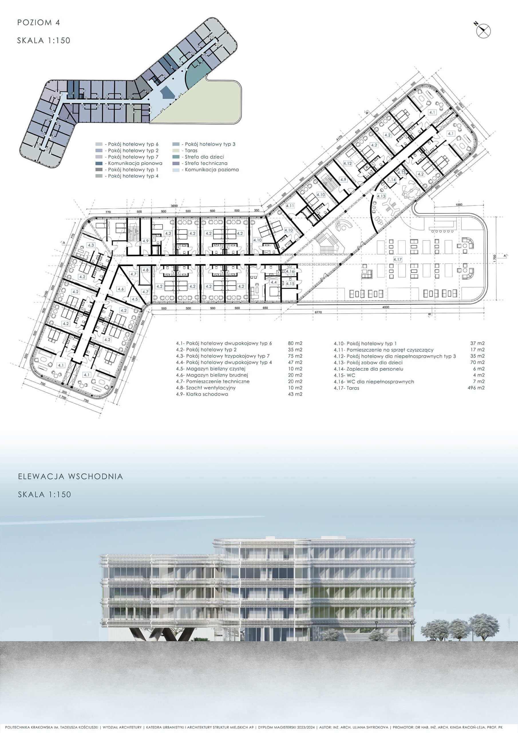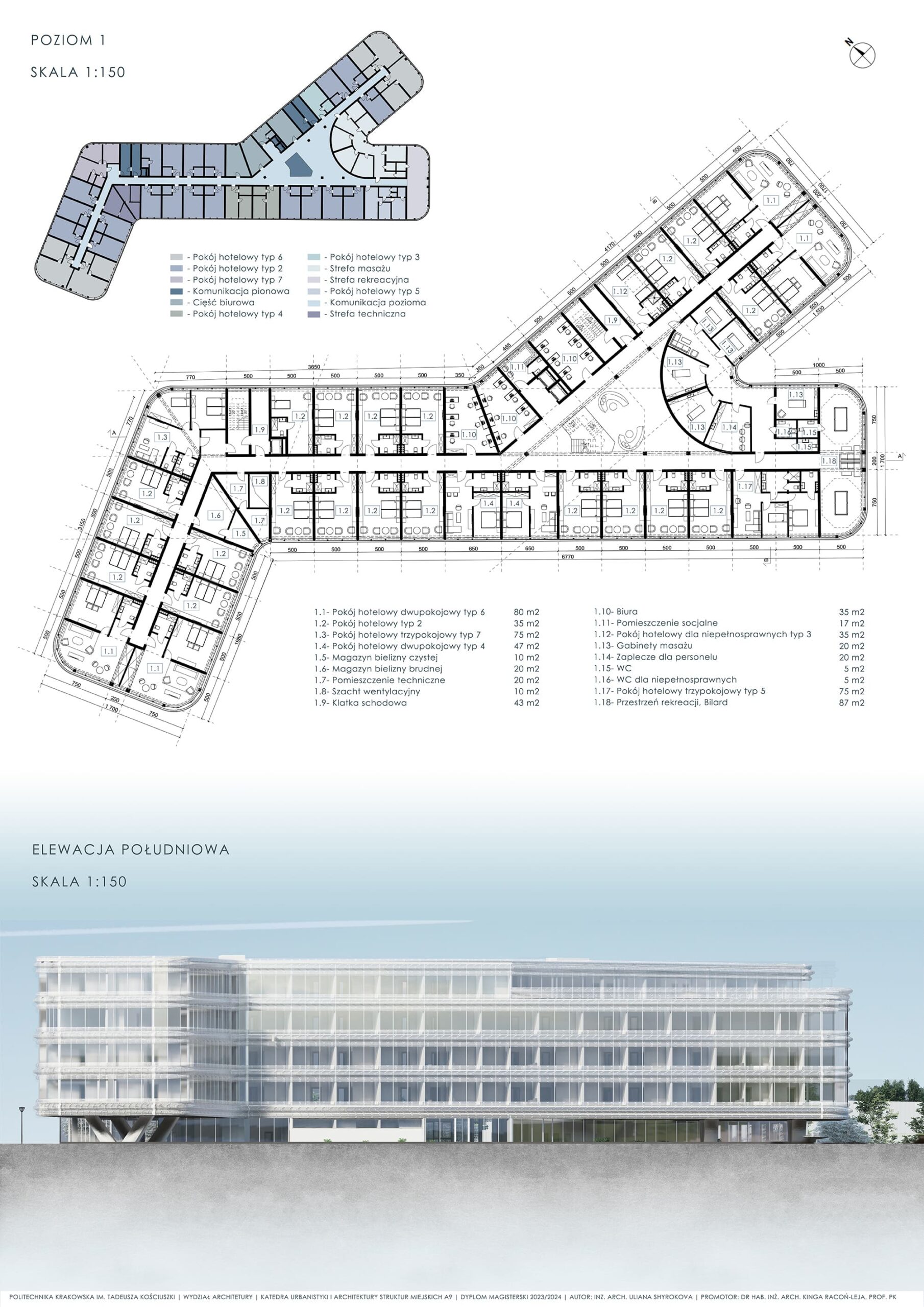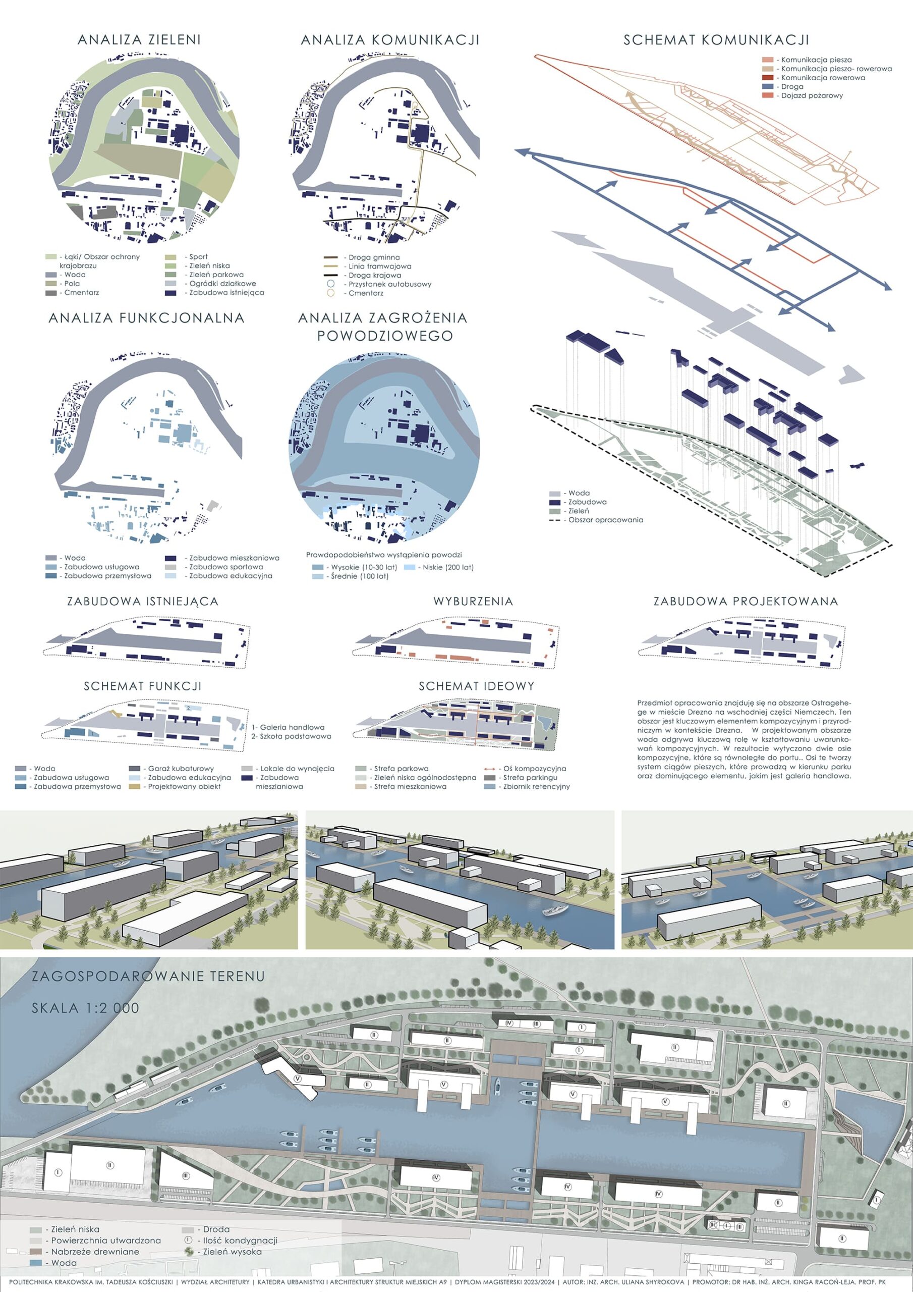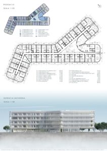 Przedmiotem projektu jest hotel w obszarze Ostragehehe. Koncepcja urbanistyczna objęła rozwiązanie portu przemysłowego i zakłada jego adaptację na atrakcyjną i funkcjonalną przestrzeń miejską. Głównym założeniem jest przeniesienie stref przemysłowych poza miasto oraz wprowadzenie nowych obszarów mieszkalnych i usługowych, aby przyciągnąć więcej osób do tego rejonu. Projekt przewiduje stworzenie zróżnicowanej przestrzeni z obszarami publicznymi, parkami oraz rozwiniętą infrastrukturą zieloną, która ma na celu retencje wody i poprawę lokalnego mikroklimatu. Koncepcja architektoniczna dotyczy budynku hotelowego i zakłada harmonijne połączenie nowoczesnej architektury z otaczającą przyrodą i wodą. Dzięki przeszklonym elewacjom hotel odbija powierzchnię wody, co tworzy wrażenie płynnego połączenia między ziemią a niebem. Przy projektowaniu budynku wykorzystano nowoczesne materiały, takie jak szkło, beton i stal, podkreślając jego trwałość i nowoczesny wygląd. W projekcie przewidziano różnorodne strefy użytkowe, w tym pokoje hotelowe, przestrzenie wspólne, strefę usługową oraz taras z zielenią na ostatnim piętrze. Hotel oferuje pokoje o różnych standardach i konfiguracjach.