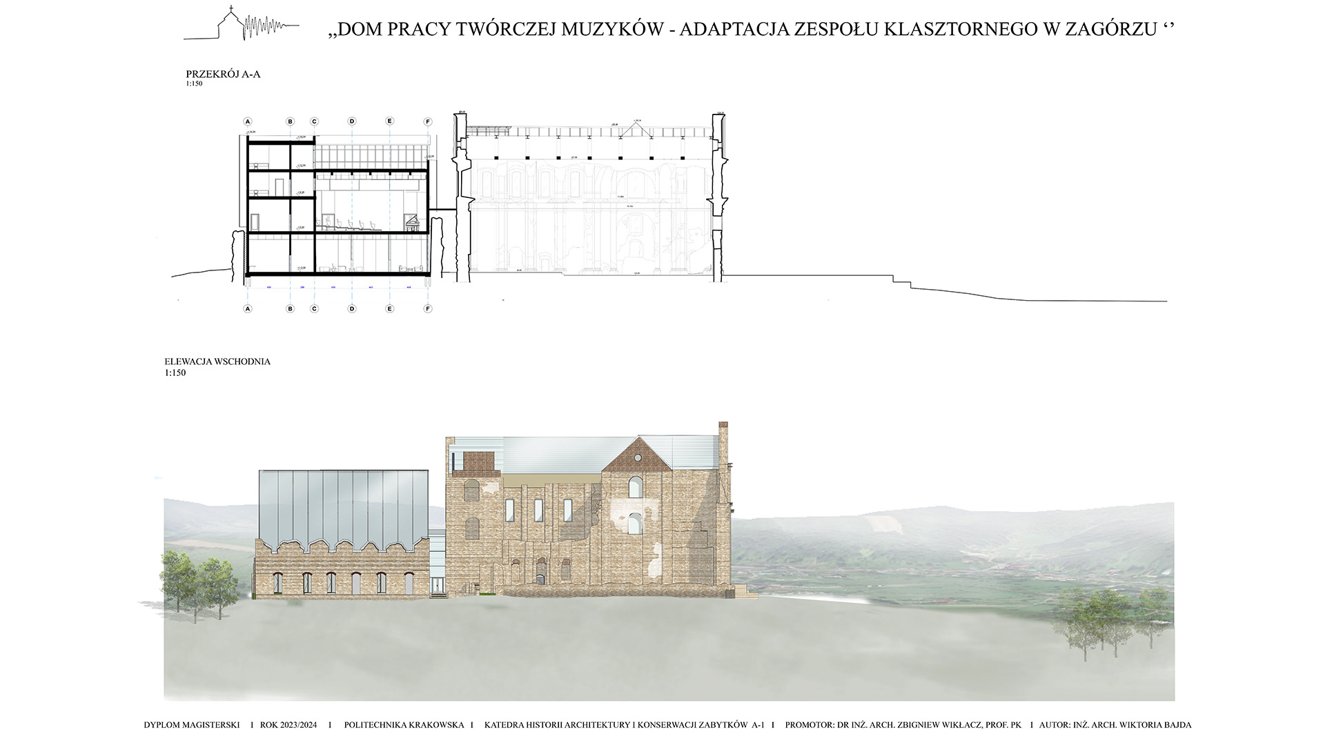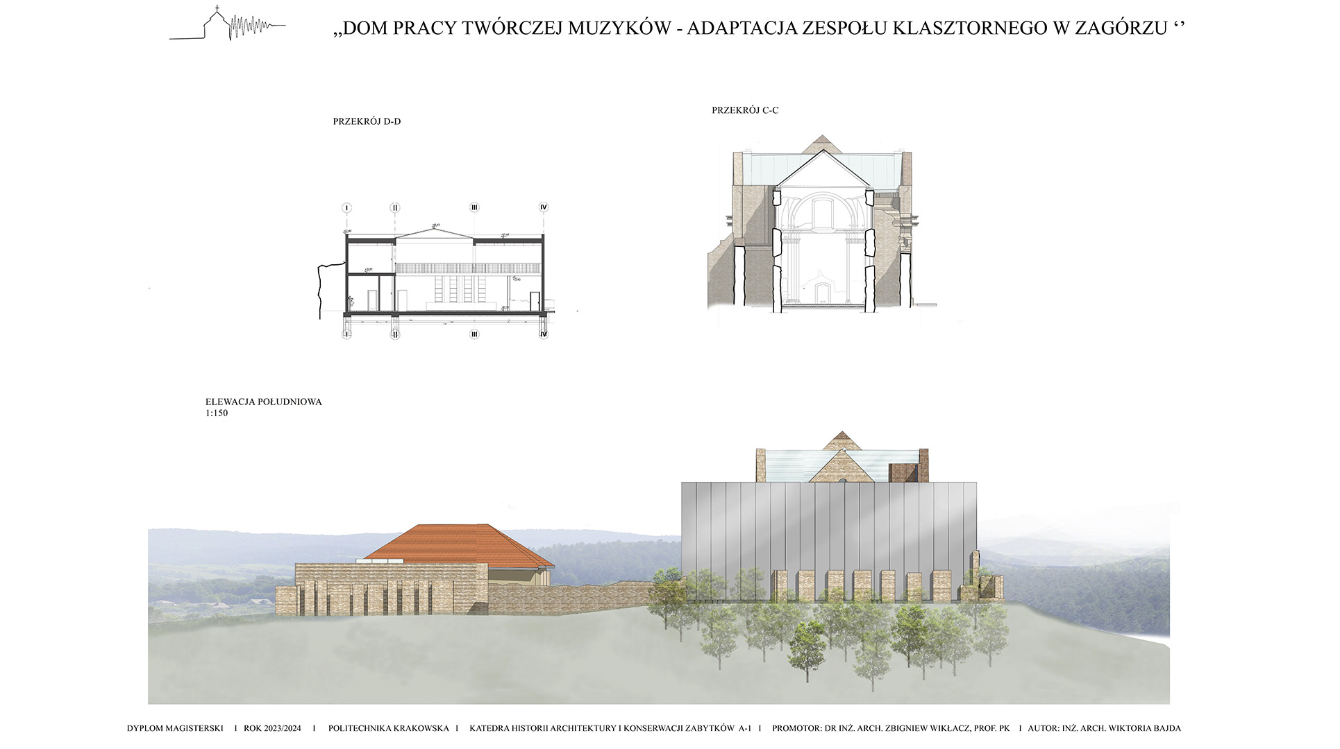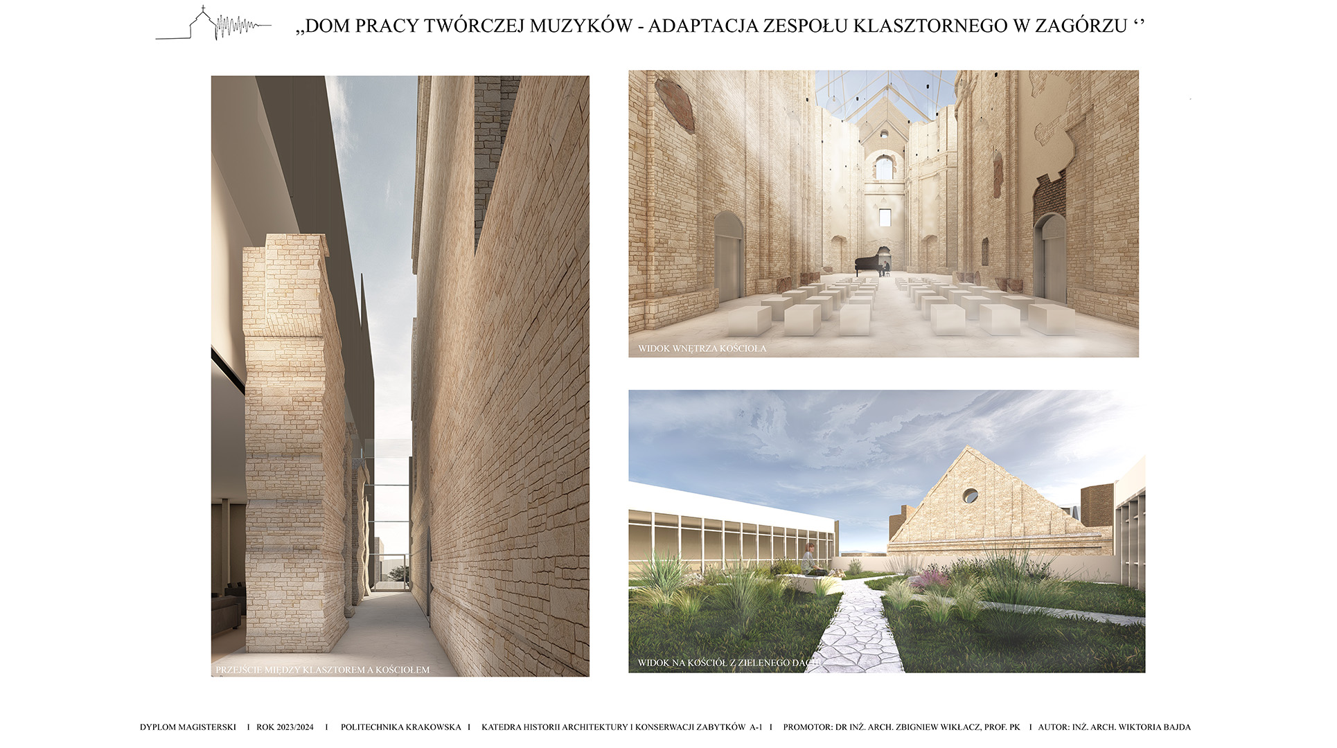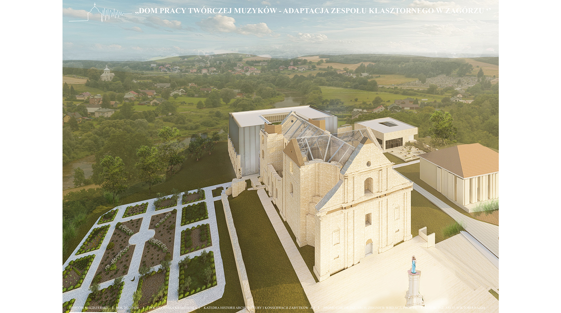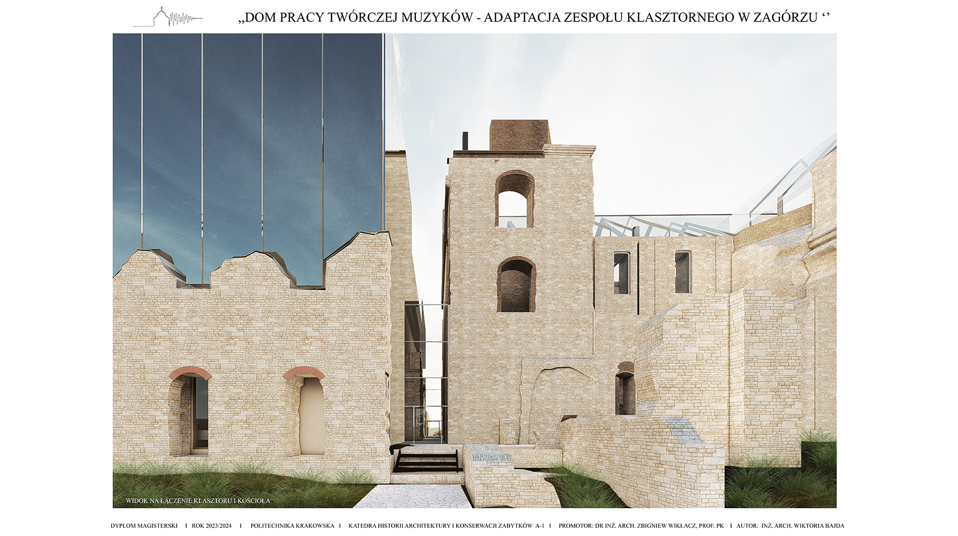 Koncepcja zakłada stworzenie projektu adaptacji zabytkowego zespołu klasztornego na Dom Pracy Twórczej Muzyków, który ma na celu połączenie ochrony dziedzictwa kulturowego z nowoczesnymi funkcjami użytkowymi. Przeznaczenie obiektu na cele artystyczne sprzyjać będzie zarówno zachowaniu jego unikalnego charakteru, jak i aktywizacji kulturalnej regionu. Poprzez uwydatnienie ruin i wyciągnięcie brył z murów klasztoru i budynków gospodarczych zakłada się powstanie kompleksu odsuniętego od granic hałasu miasta, pozwalającego na tworzenie muzyki w skupieniu przy akompaniamencie otaczającej natury. Celem projektu jest ponowne wprowadzenie w zabytek melodii, która kiedyś grała w świątyni, pozwalając na jej tworzenie, ekspresje i absorbcje. W tym celu zostały stworzone sale nagrań, sale prób i sala koncertowa. W projekcie znajduje się także funkcja noclegowa i gastronomiczna dla w pełni zaspokojenia potrzeb wizytujących muzyków.