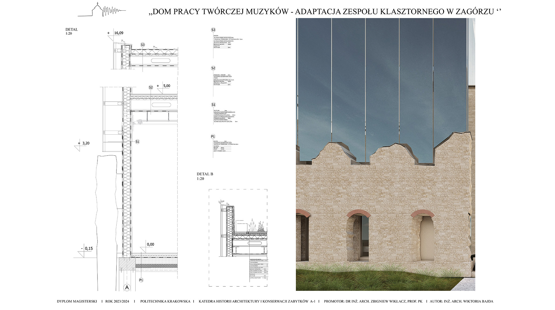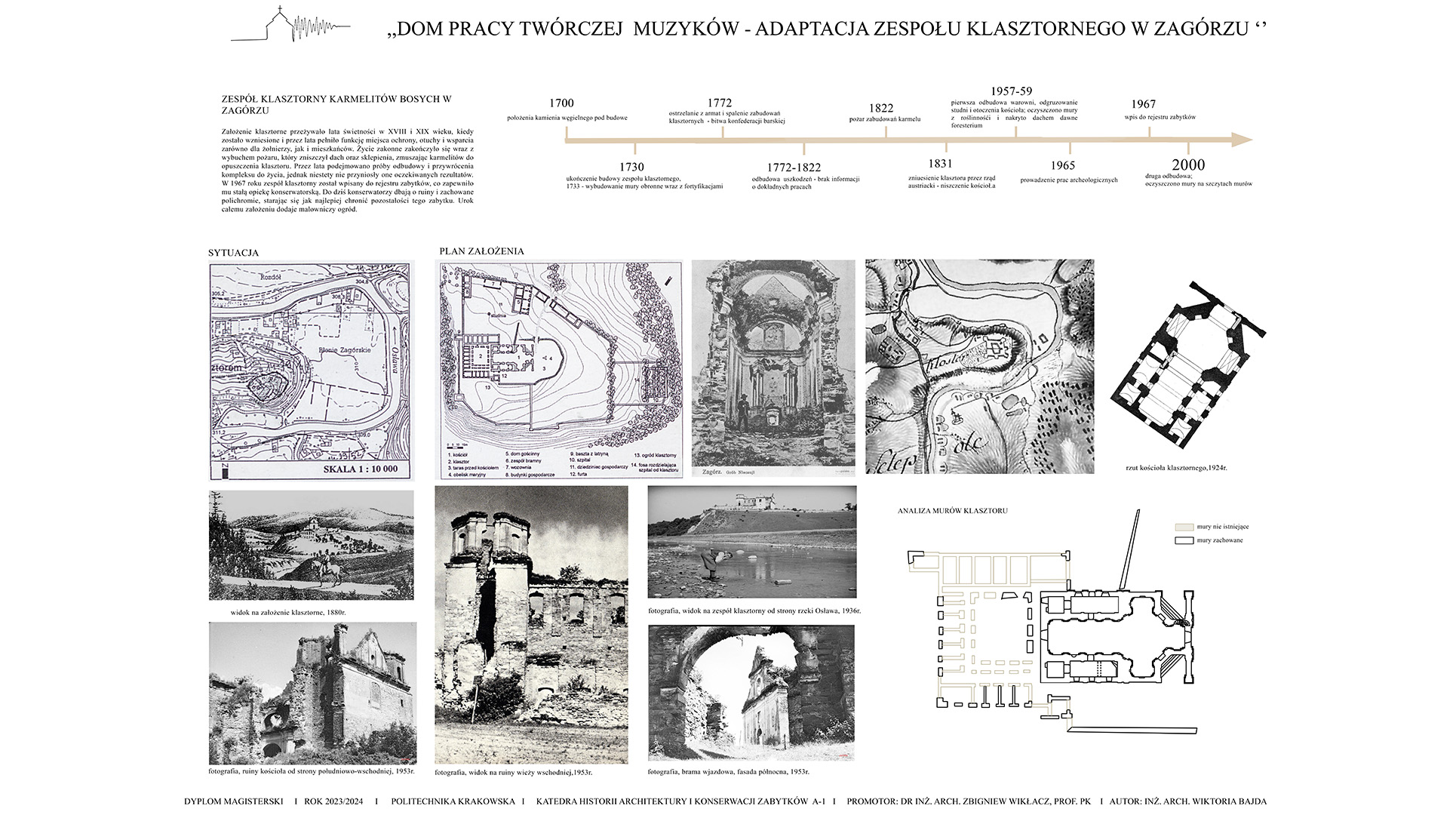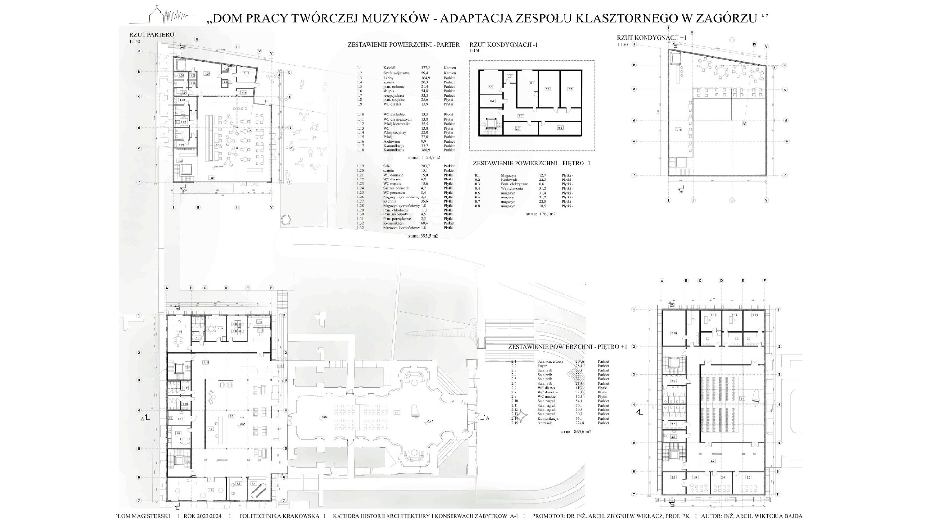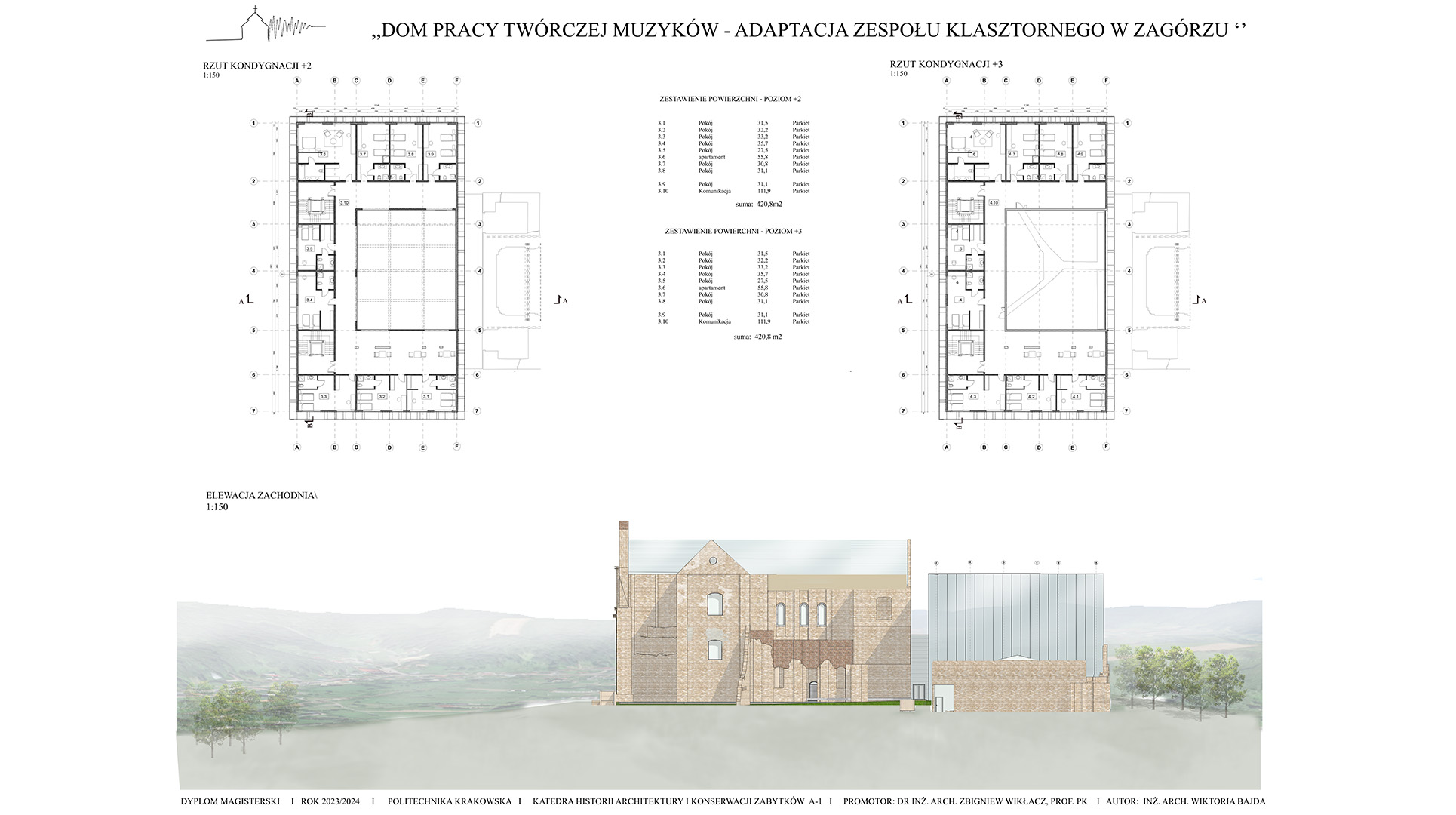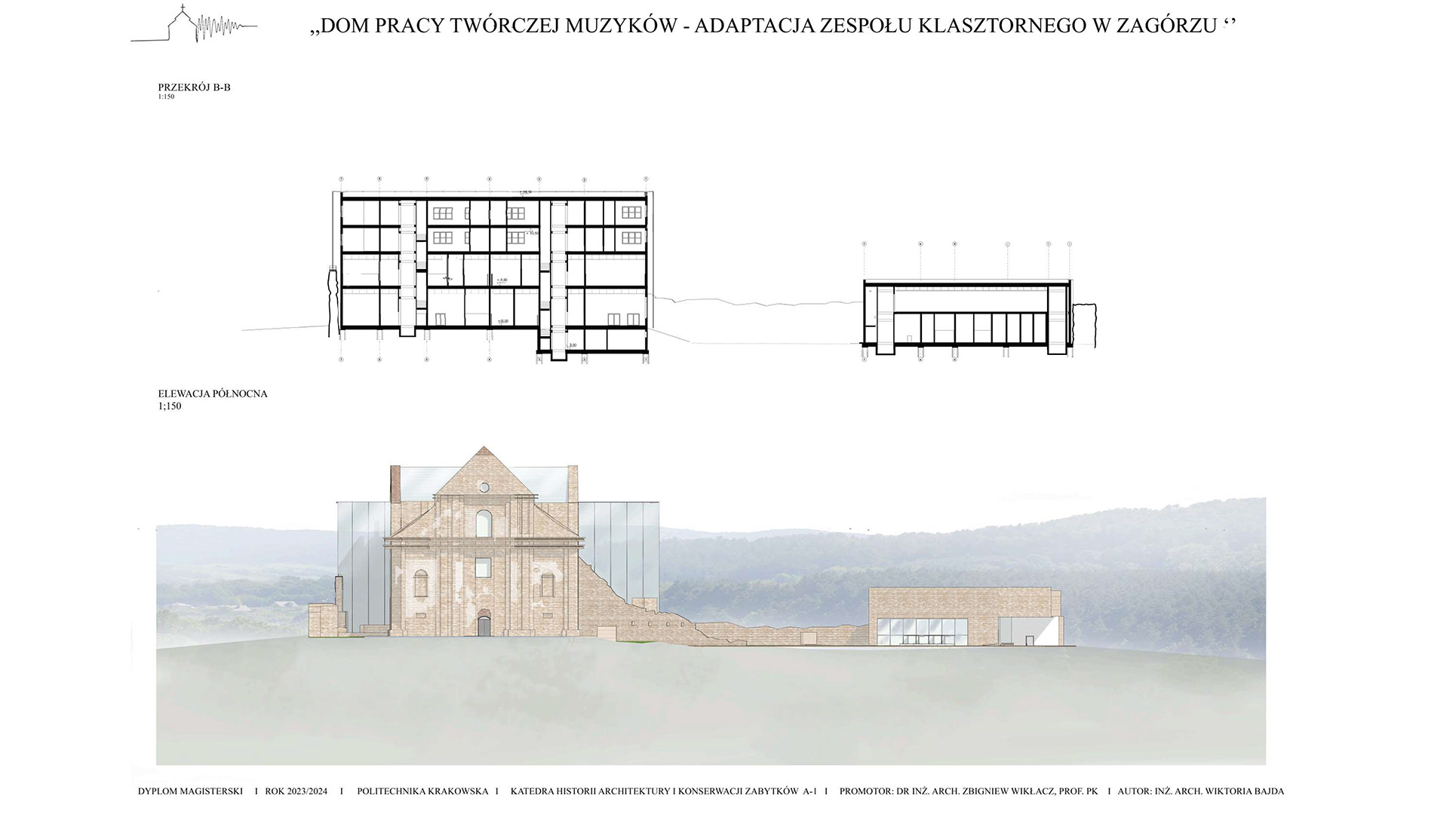 Koncepcja zakłada stworzenie projektu adaptacji zabytkowego zespołu klasztornego na Dom Pracy Twórczej Muzyków, który ma na celu połączenie ochrony dziedzictwa kulturowego z nowoczesnymi funkcjami użytkowymi. Przeznaczenie obiektu na cele artystyczne sprzyjać będzie zarówno zachowaniu jego unikalnego charakteru, jak i aktywizacji kulturalnej regionu. Poprzez uwydatnienie ruin i wyciągnięcie brył z murów klasztoru i budynków gospodarczych zakłada się powstanie kompleksu odsuniętego od granic hałasu miasta, pozwalającego na tworzenie muzyki w skupieniu przy akompaniamencie otaczającej natury. Celem projektu jest ponowne wprowadzenie w zabytek melodii, która kiedyś grała w świątyni, pozwalając na jej tworzenie, ekspresje i absorbcje. W tym celu zostały stworzone sale nagrań, sale prób i sala koncertowa. W projekcie znajduje się także funkcja noclegowa i gastronomiczna dla w pełni zaspokojenia potrzeb wizytujących muzyków.