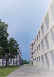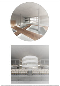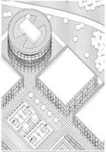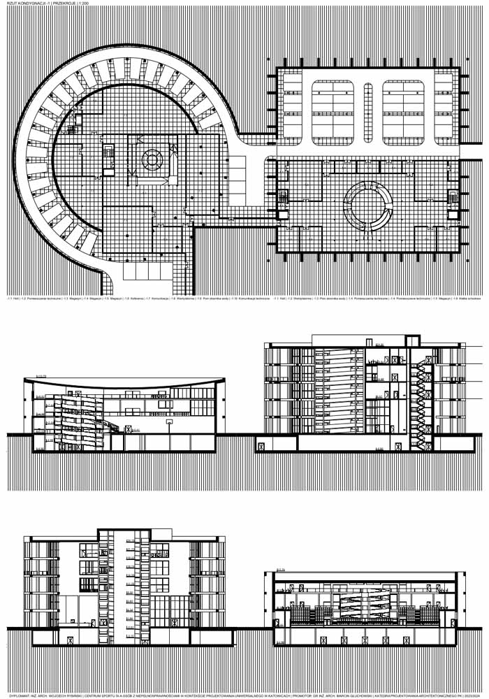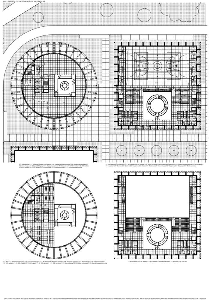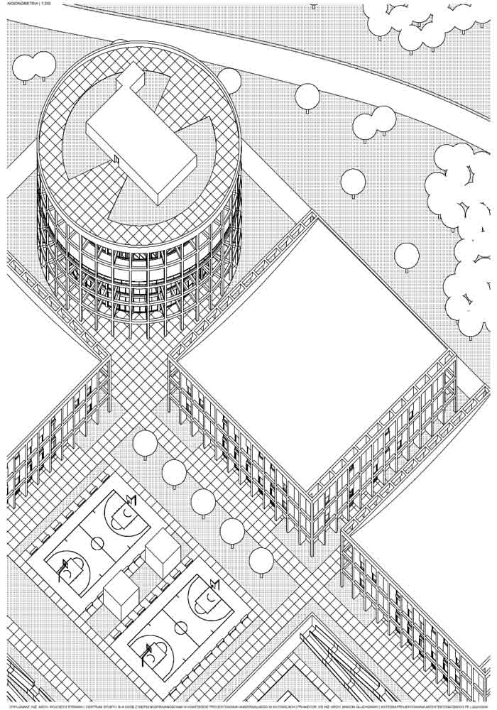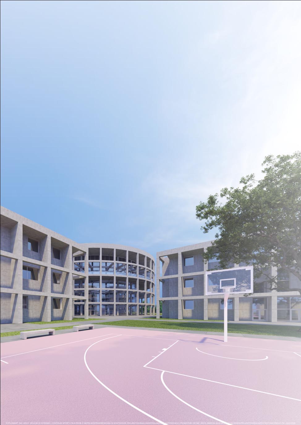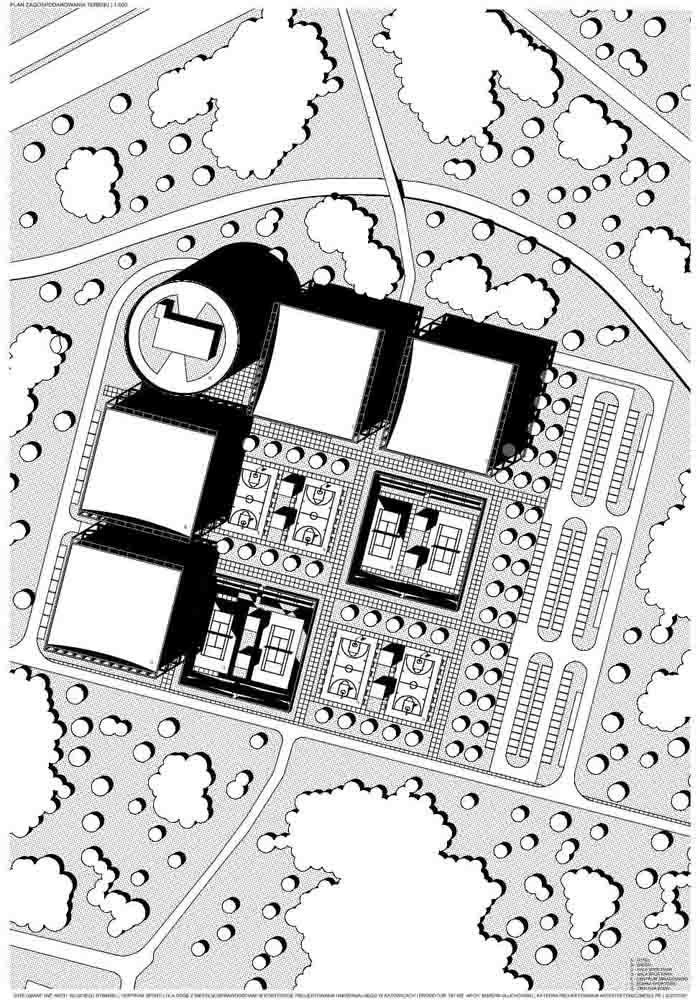 Założeniem projektu było stworzenie miejsca, gdzie ludzie z niepełnosprawnościami będą mieli dostęp do aktywności ruchowych oraz przestrzeni, gdzie będzie można doświadczyć jakie przeszkody panują w przestrzeni publicznej dla ludzi o ograniczonych możliwościach poruszania się. Pięć budynków oraz boiska zostały rozłożone na siatce 3×3. Formy czterech obiektów zostały zaprojektowane na planie kwadratu. Piąty budynek został wyróżniony kształtem oraz wysokością. Wszystkie obiekty zostały otoczone siatką słupowo-belkową, która pełni funkcję konstrukcyjną oraz nadaje rytmu całości założenia. Cały projekt tworzono z uznaniem zasad projektowania uniwersalnego, dlatego dominantami są pochylnie znajdujące się w budynkach oraz przy boiskach. Stanowią one główną drogę komunikacyjną, oraz są to dominanty przestrzeni. Rampy zaprojektowano na bazie kontrastu, kwadrat w kole i koło w kwadracie. Okrągły budynek został podzielony na pół, połowa koła stanowi przestrzeń funkcjonalno-użytkową, druga połowa została wydzielona tylko dla ramp. Kwadrat natomiast został zaprojektowany w 100% symetrycznie.