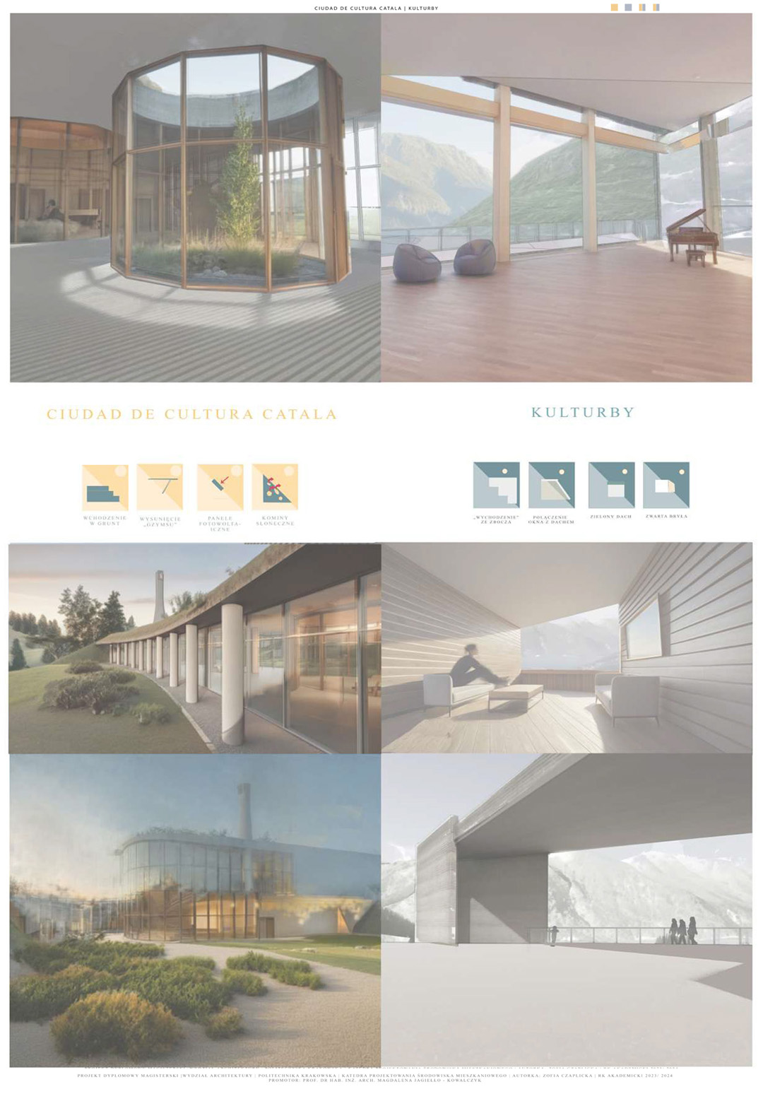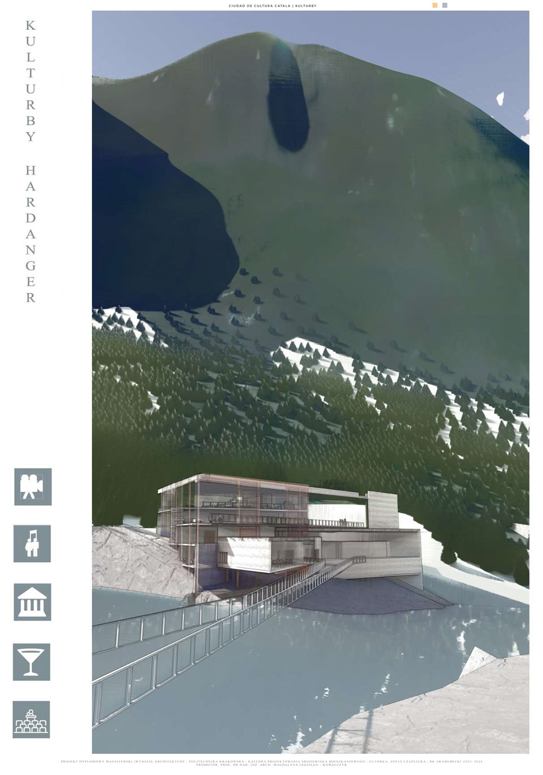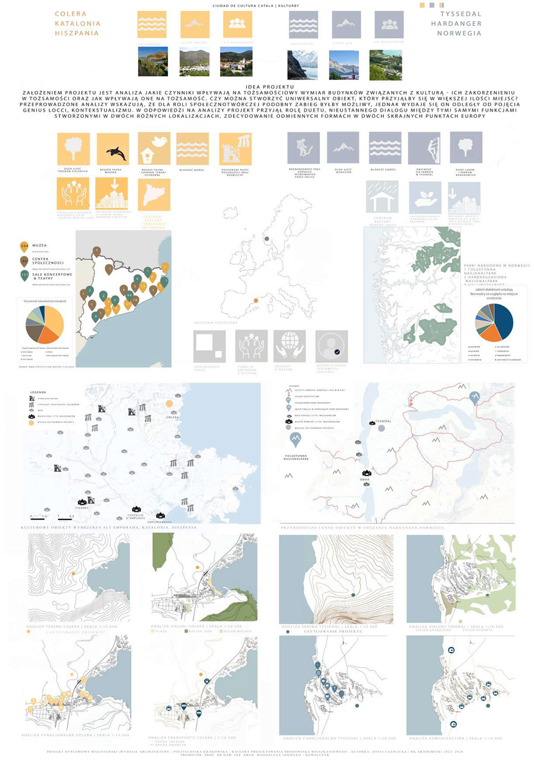 Projekt poświęcony jest dualizmowi między budynkami kulturowymi w Hiszpanii i Norwegii, który stanowi pretekst do szerszej refleksji dotyczącej tożsamości obiektu architektonicznego. Ideowo nawiązuje do dwustronności relacji pomiędzy czynnikami mającymi moc kształtowania tożsamości budynku a możliwością wpływania obiektu na społeczność lokalną. Część teoretyczna skupia się na analizie wyselekcjonowanych współczesnych obiektów spełniających wybrane kryteria. Zebrany materiał wskazuje zarówno na powszechne, jak i indywidualne zasady wpływające na kształtowanie się obiektów kulturowych. Część praktyczną tworzą dwa projekty o podobnym programie funkcjonalnym i odmiennej formie inspirowanej miejscem powstania. Kontrast podobieństw i różnic stwarza wizję kulturowego osadzenia obu obiektów. Przedstawiony dwugłos projektów, poszukujący koncepcji naturalnej harmonii między zasadami uniwersalnymi a kontekstem architektoniczno-urbanistycznym, stanowi główną ideę obu projektów.