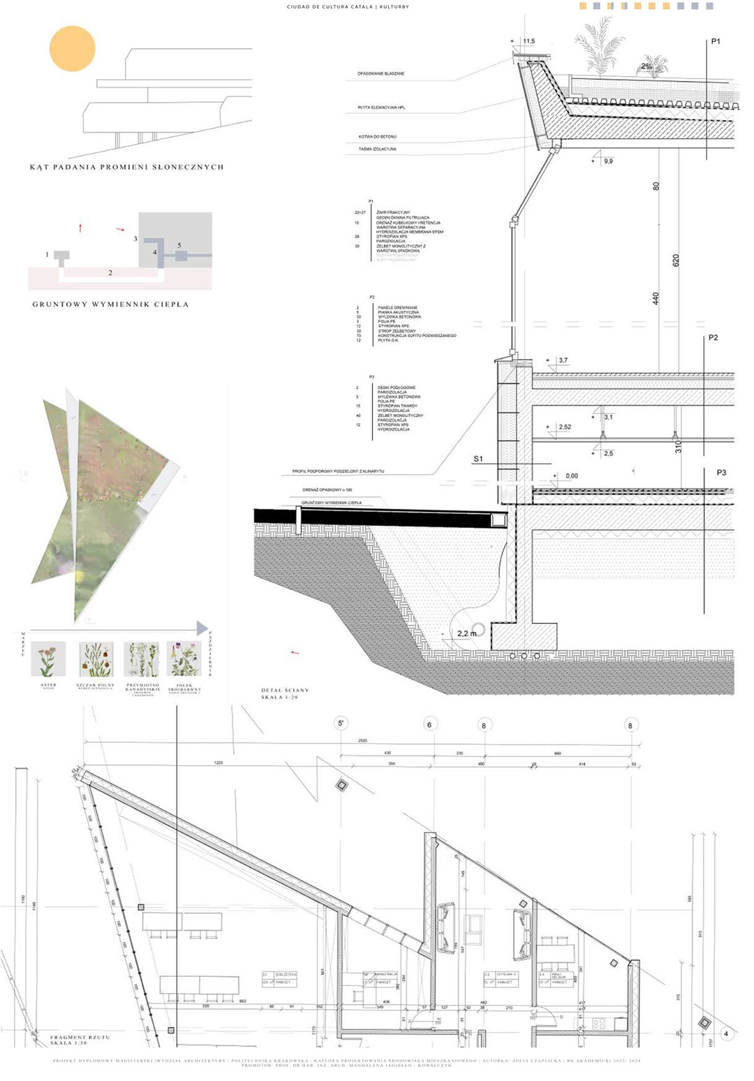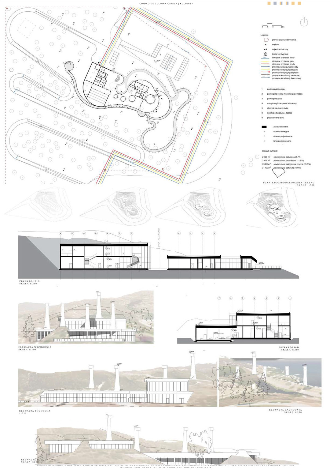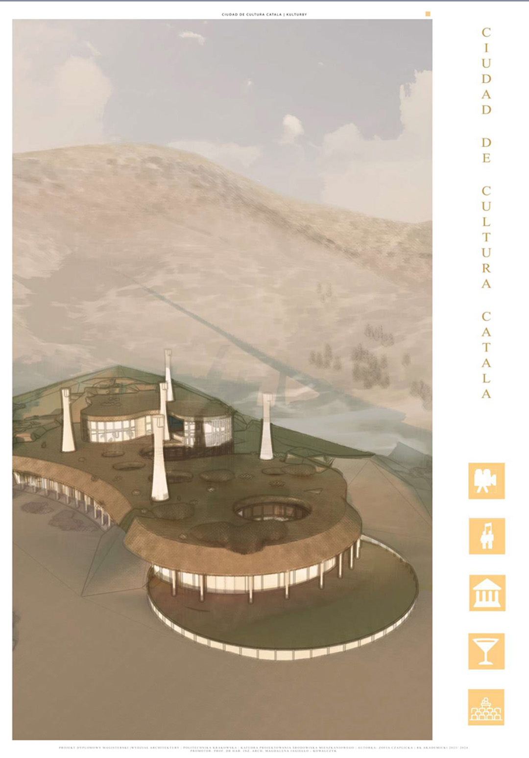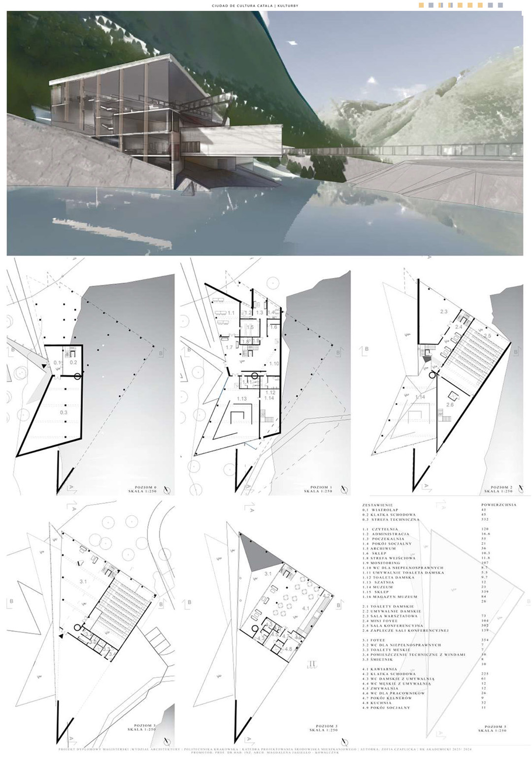Projekt poświęcony jest dualizmowi między budynkami kulturowymi w Hiszpanii i Norwegii, który stanowi pretekst do szerszej refleksji dotyczącej tożsamości obiektu architektonicznego. Ideowo nawiązuje do dwustronności relacji pomiędzy czynnikami mającymi moc kształtowania tożsamości budynku a możliwością wpływania obiektu na społeczność lokalną. Część teoretyczna skupia się na analizie wyselekcjonowanych współczesnych obiektów spełniających wybrane kryteria. Zebrany materiał wskazuje zarówno na powszechne, jak i indywidualne zasady wpływające na kształtowanie się obiektów kulturowych. Część praktyczną tworzą dwa projekty o podobnym programie funkcjonalnym i odmiennej formie inspirowanej miejscem powstania. Kontrast podobieństw i różnic stwarza wizję kulturowego osadzenia obu obiektów. Przedstawiony dwugłos projektów, poszukujący koncepcji naturalnej harmonii między zasadami uniwersalnymi a kontekstem architektoniczno-urbanistycznym, stanowi główną ideę obu projektów.