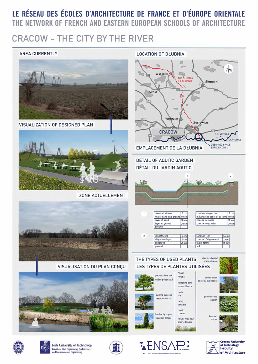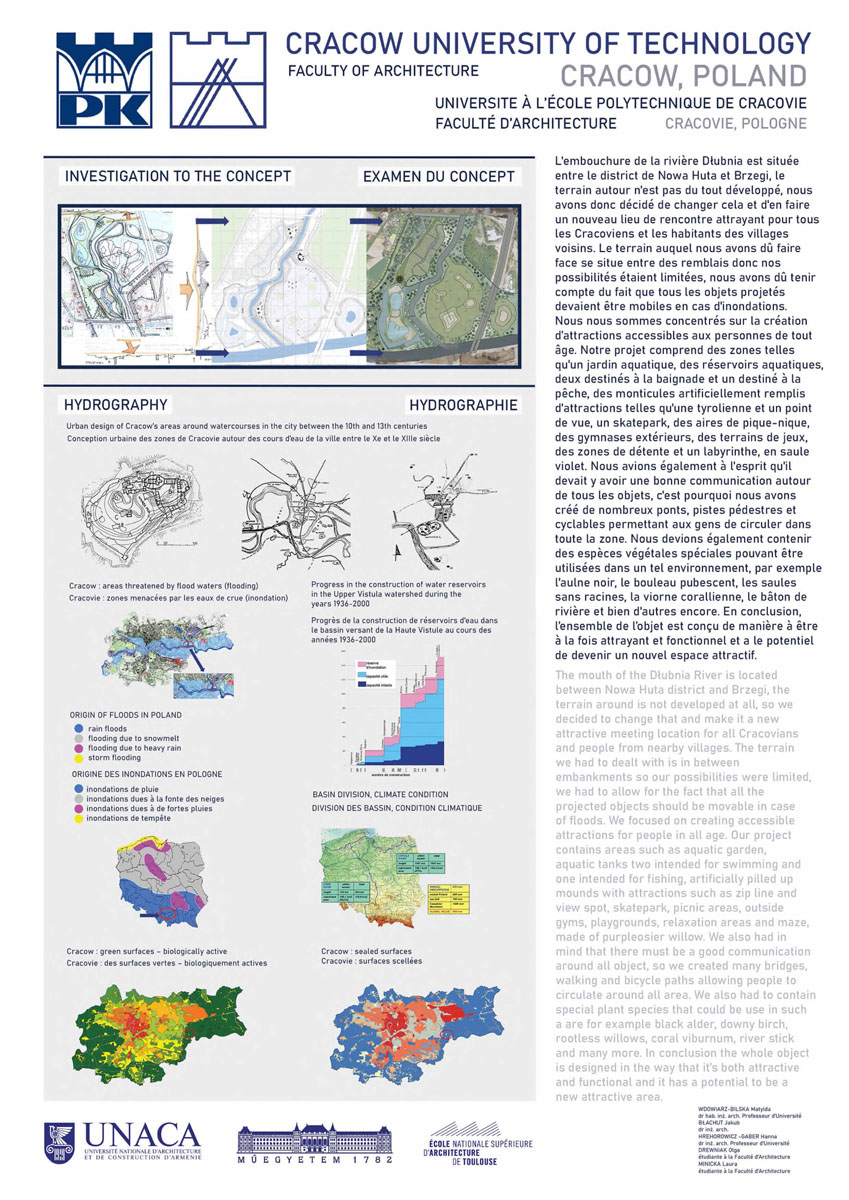 Pierwszego dnia odbyło się powitanie studentów i wykładowców na uniwersytecie w Tuluzie, a następnie miały miejsce prezentacje projektów wykonanych przez studentów biorących udział w warsztatach. Tematem tegorocznych projektów było szeroko pojęte zagadnienie wody w dzisiejszych miastach. Projekt reprezentujący Politechnikę Krakowską dotyczył rewitalizacji terenu ujścia Dłubni. Został on wykonany przez Olgę Drewniak i Laurę Minicką, studentki drugiego roku architektury, pod kierunkiem dr hab. inż. arch. Matyldy Wdowiarz -Bilskiej, prof. PK, dr inż. arch. Hanny Hrehorowicz-Gaber, prof. PK oraz dr inż. arch. Jakuba Błachuta, przy współpracy dr inż. Marty Łapuszek..
