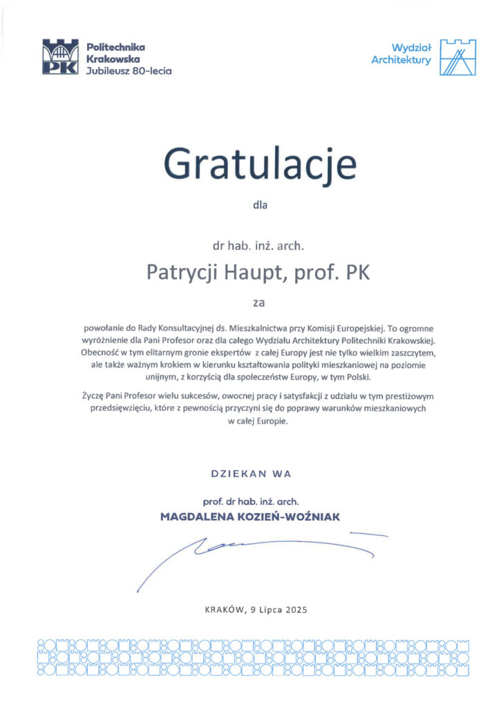 Dr hab. inż. arch. Patrycja Haupt została powołana przez Komisję Europejską do nowo utworzonej Rady Konsultacyjnej ds. Mieszkalnictwa – elitarnego grona 15 ekspertów z całej Europy, którego zadaniem jest opracowanie strategicznych rekomendacji dla Europejskiego Planu Dostępnego Mieszkalnictwa. To wyjątkowe wyróżnienie dla Polski i polskiej nauki, w tym szczególnie obszaru architektury i urbanistyki. Polska ekspertka pracuje w Katedrze Środowiska Mieszkaniowego Wydziału Architektury Politechniki Krakowskiej, jest też koordynatorką Laboratorium Przekształceń Środowiska Mieszkaniowego na WA PK.