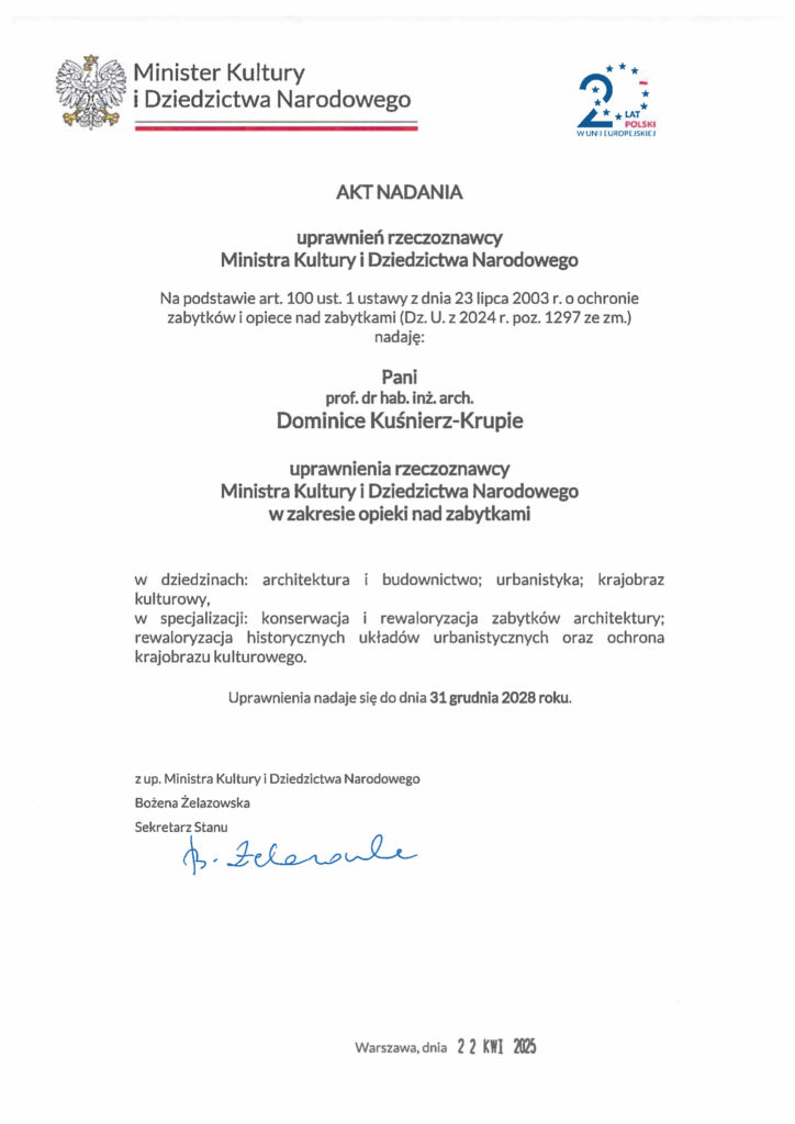 W dniu 22 kwietnia 2025 roku Prof. dr hab. inż. arch. Dominika Kuśnierz-Krupa z Katedry Historii Architektury i Konserwacji Zabytków otrzymała uprawnienia Ministra Kultury i Dziedzictwa Narodowego na kolejną kadencję.