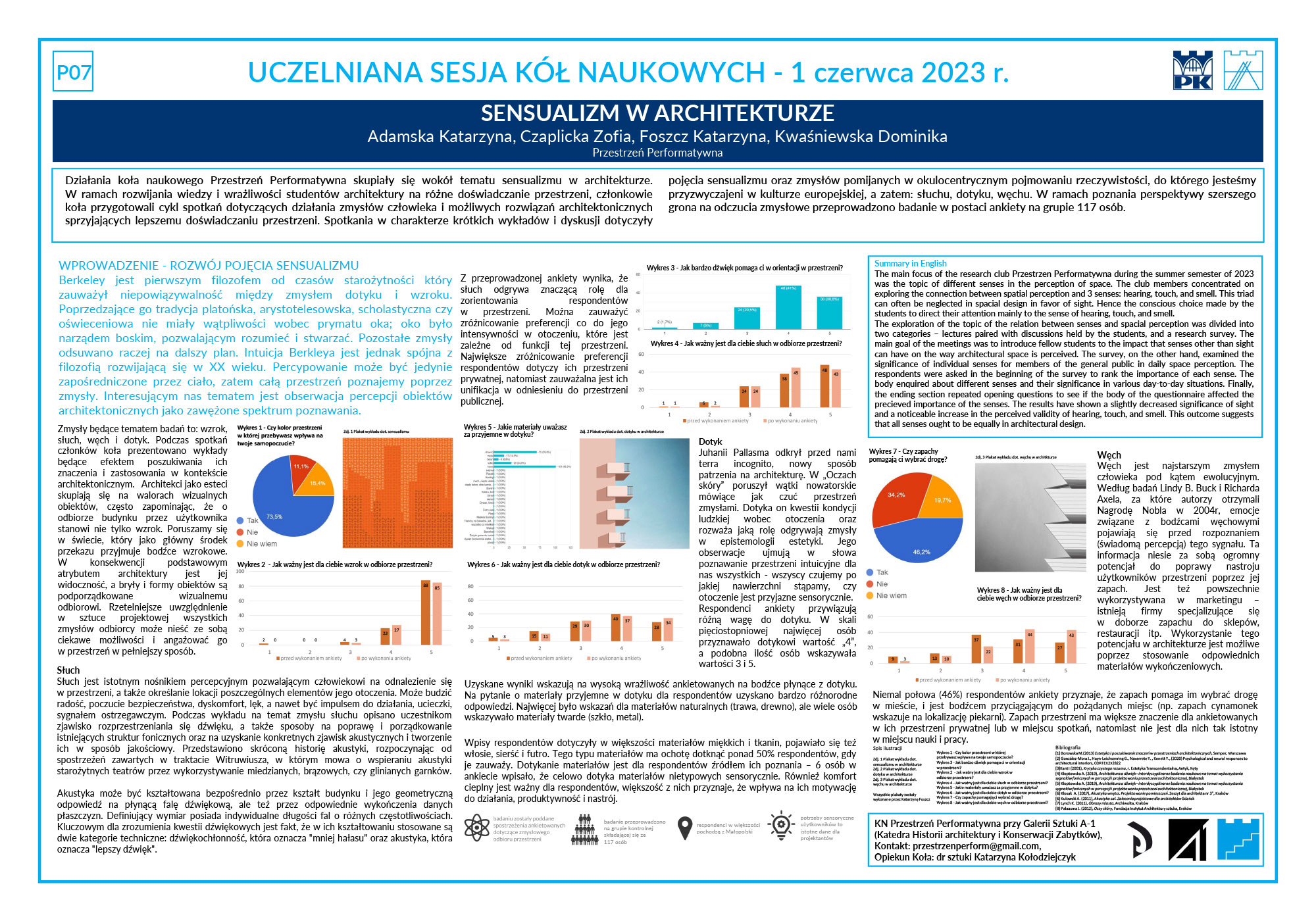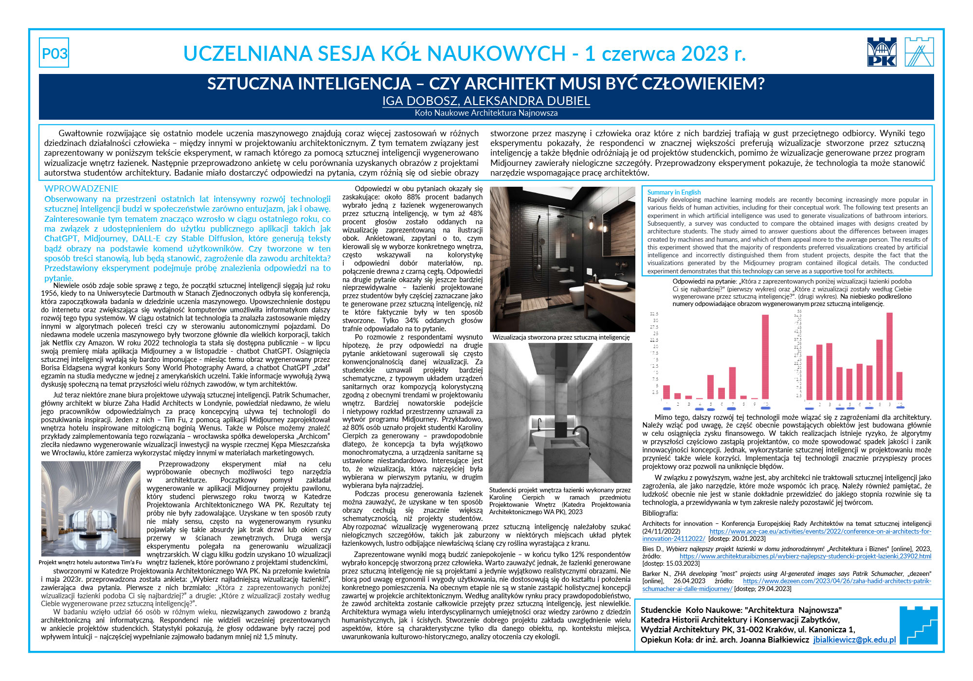 Jury Sesji Studenckich Kół Naukowych Wydziału Architektury 2023: Prodziekan prof. dr hab. inż. arch. Justyna Kobylarczyk, prof. dr hab. inż. arch. Ewa Stachura, dr hab. inż. arch. Katarzyna Hodor, prof. PK, dr hab. inż. arch. J. Sroczyńska, prof. PK, dr inż. arch. Hanna Hrehorowicz – Gaber, prof. PK, dr inż. arch. Elżbieta Waszczyszyn, prof. PK, dr sztuki Katarzyna Kołodziejczyk, dr inż. arch. Angelika Lasiewicz-Sych, dr. inż. arch. Grzegorz Schnotale, mgr inż. arch. Izabella Golicz pod przewodnictwem Pełnomocnika Dziekana Wydziału Architektury ds. Studenckich Kół Naukowych dra inż. arch. Farida Nassery. Jury Sesji Studenckich Kół Naukowych Wydziału Architektury 2023 wyłoniło najlepszych 8 referatów z przedstawionych 27 referatów, którym przyznano kolejne miejsca: